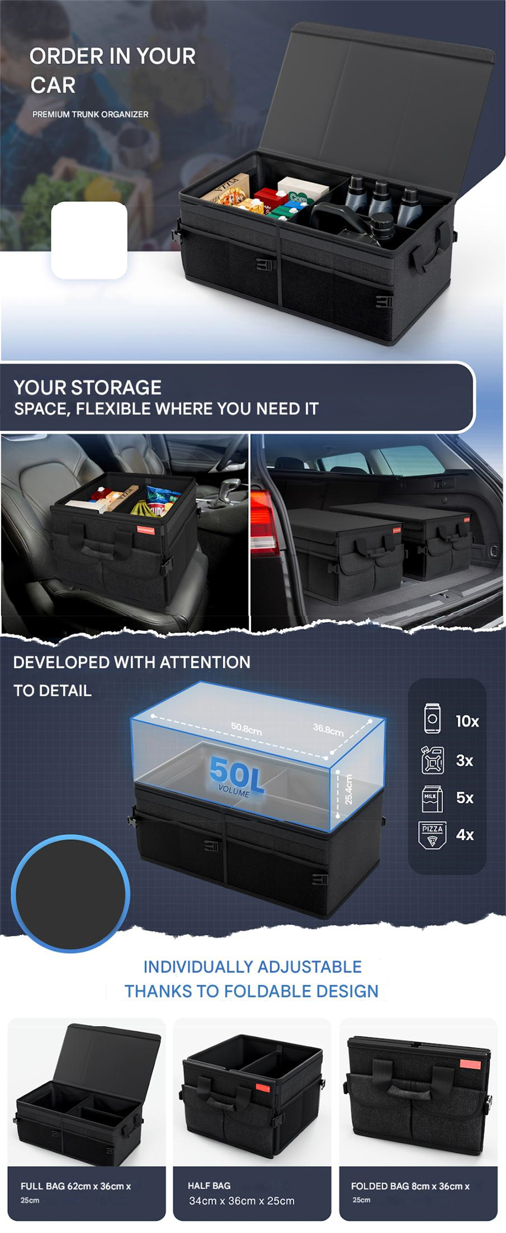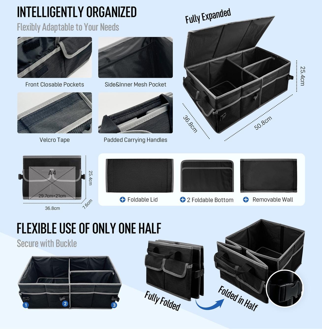 Taitettava auton tavaratilan järjestin, jossa on kolme pääosastoa ja useita ulkotaskuja. Vettä hylkivä ja UV-kestävä Oxford-kangas sekä liukuestolistat pohjassa lisäävät käytettävyyttä ja vakautta arjen kuljetuksissa.
