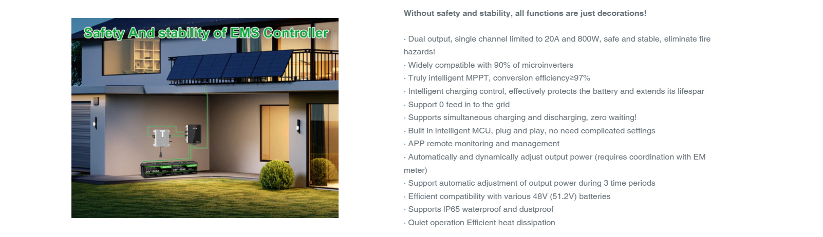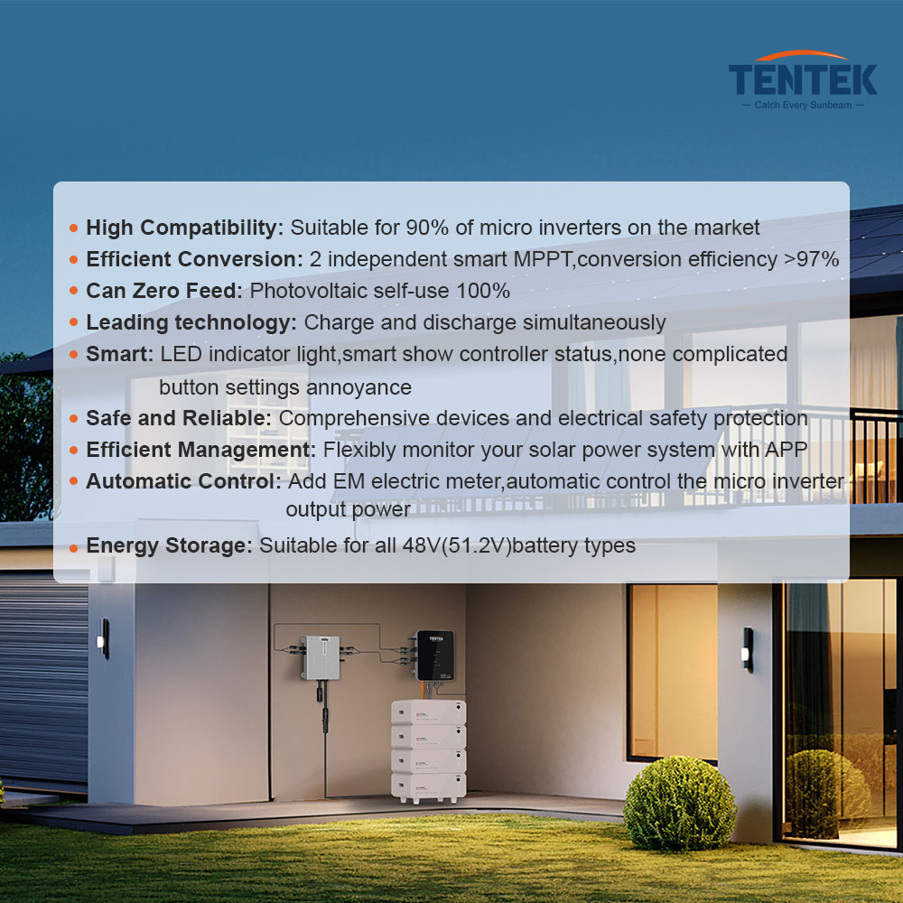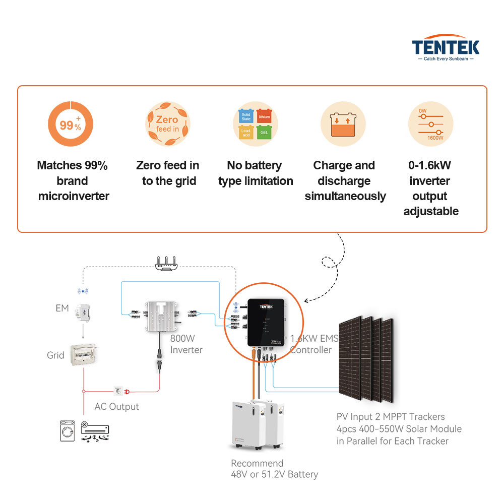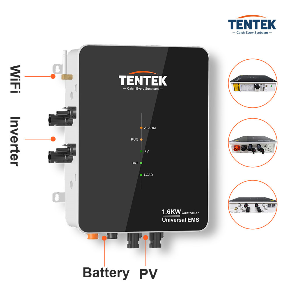 TENTEK EMS 1.6KW on älykäs aurinkolatausohjain, joka hallitsee kahta MPPT-seurantaa, akut ja mikroinvertterit samassa yksikössä. Se soveltuu erityisesti 48V aurinkosähköjärjestelmiin, joissa halutaan optimoida lataus, kulutus ja verkkoon syöttö.