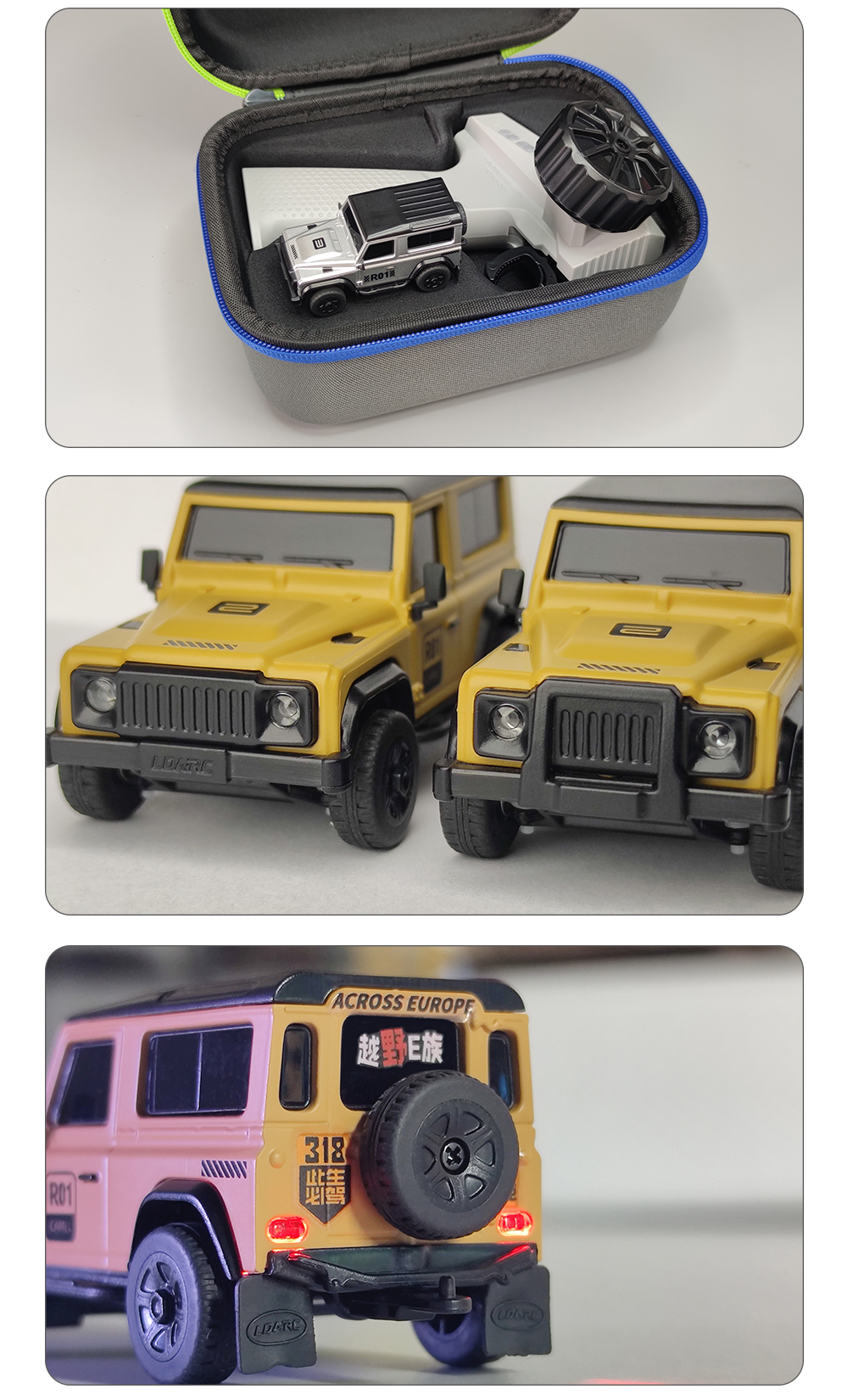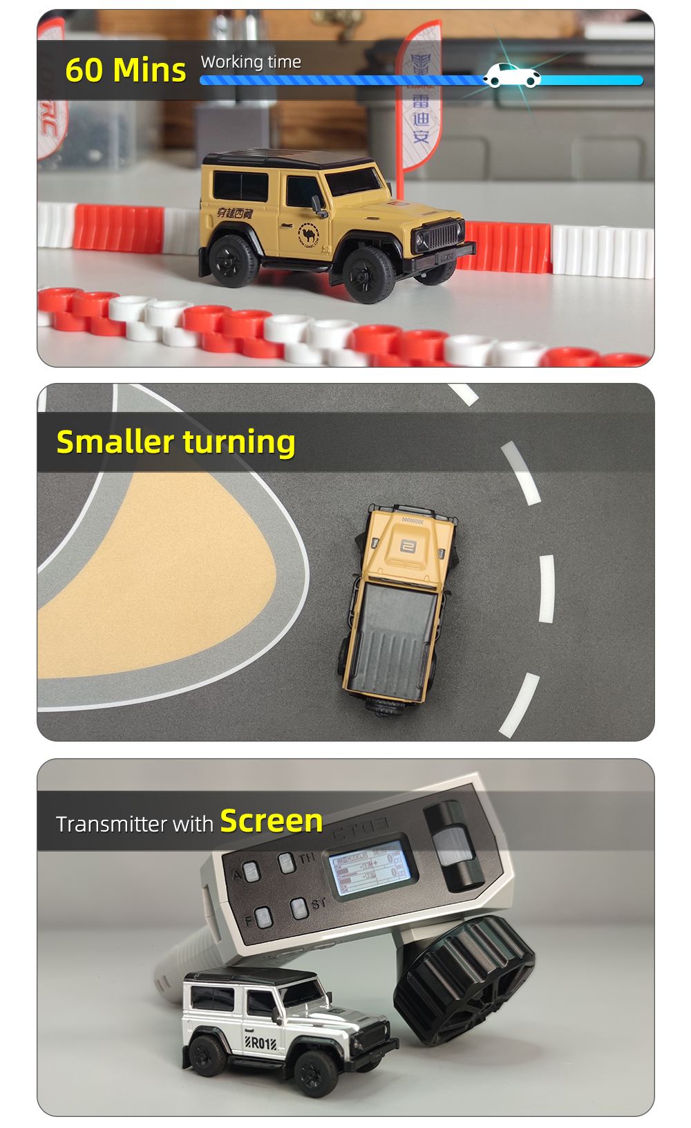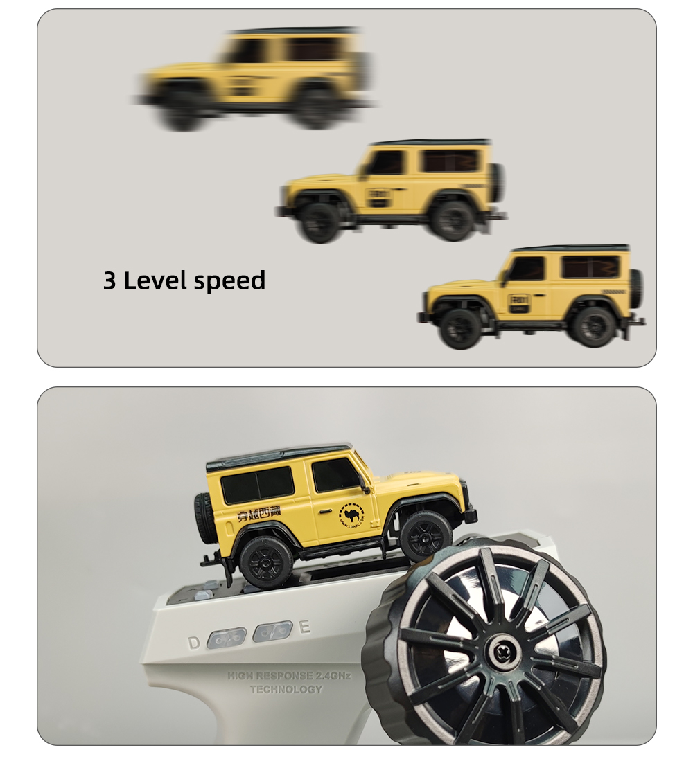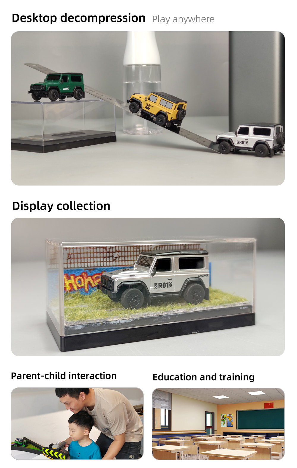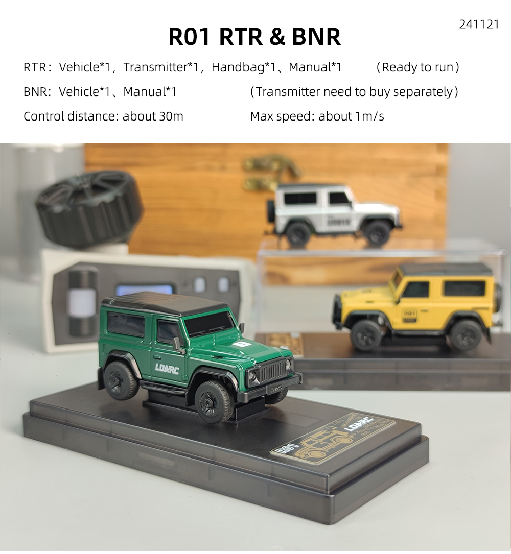 R01 on pöytäkäyttöön sopiva mittakaavan 1:64 minikokoinen kauko-ohjattava auto, pituus noin 7 cm ja paino noin 28 g. Viimeistely on siisti ja ulkonäkö tyylikäs. Ajonopeutta ja ohjausherkkyyttä voi säätää yhdellä painikkeella, mikä tekee käytöstä helppoa myös aloittelijoille. Laaja valojärjestelmä sisältää lähivalot ja kaukovalot, vilkut, peruutusvalot, jarruvalot sekä hätävilkut. Pehmeät kumiset sivupeilit ja lokasuojat lisäävät realistisuutta ja kestävyyttä. Sekä kauko-ohjain että ajoneuvo ladataan USB-laturilla, ajoneuvon yhdellä latauksella ajoaika on jopa 60 minuuttia. Tuote sopii sekä lasten silmä–käsi–aivoyhteistyön harjoitteluun että aikuisten pöytästressileluksi.