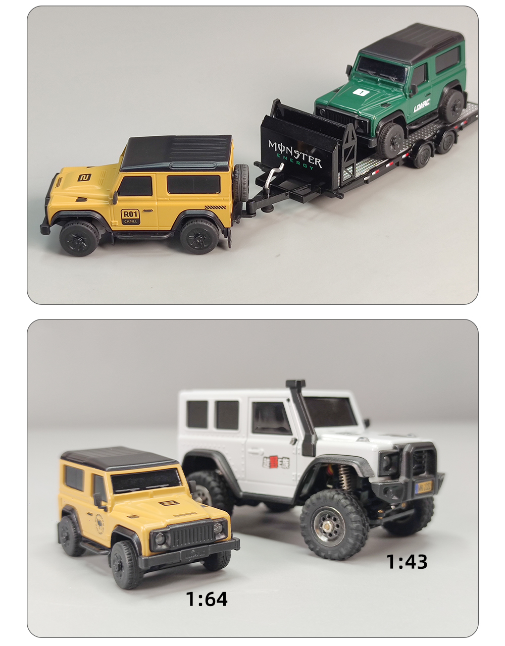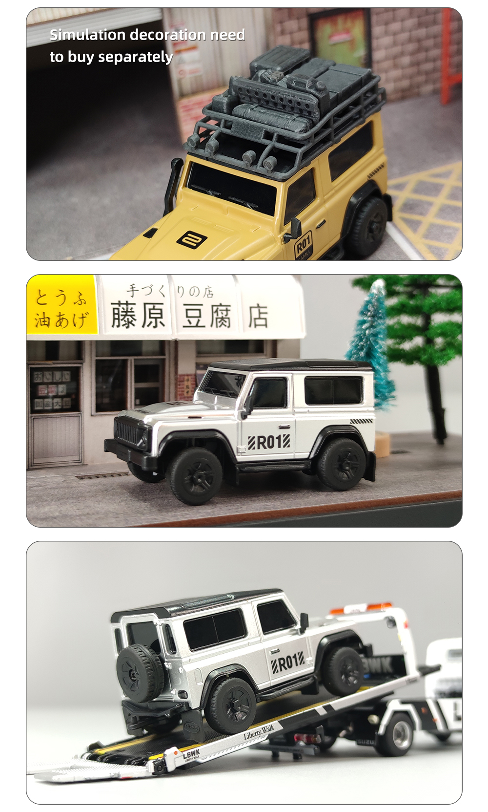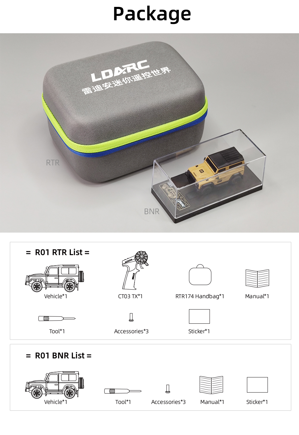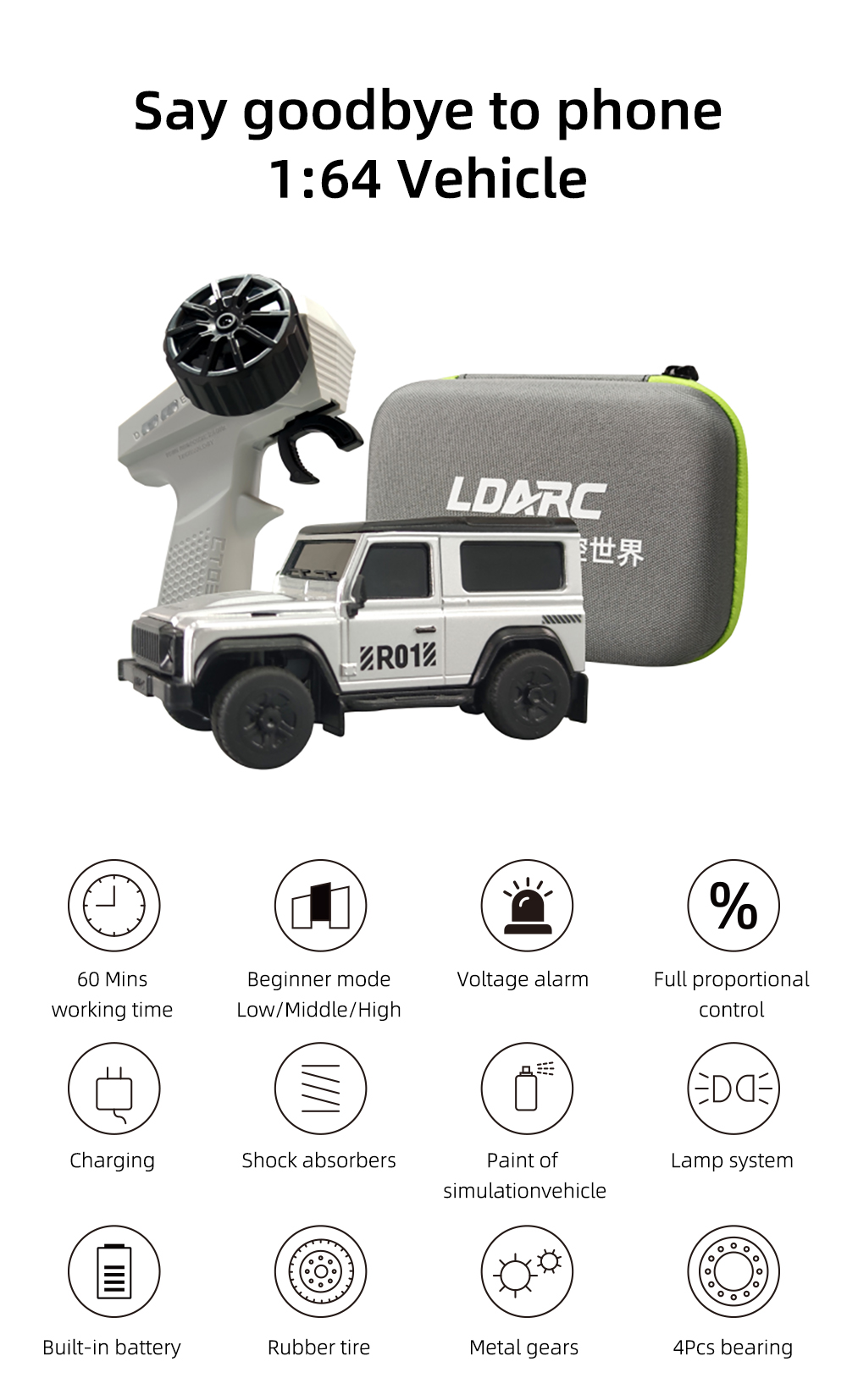 R01 on pöytäkäyttöön sopiva mittakaavan 1:64 minikokoinen kauko-ohjattava auto, pituus noin 7 cm ja paino noin 28 g. Viimeistely on siisti ja ulkonäkö tyylikäs. Ajonopeutta ja ohjausherkkyyttä voi säätää yhdellä painikkeella, mikä tekee käytöstä helppoa myös aloittelijoille. Laaja valojärjestelmä sisältää lähivalot ja kaukovalot, vilkut, peruutusvalot, jarruvalot sekä hätävilkut. Pehmeät kumiset sivupeilit ja lokasuojat lisäävät realistisuutta ja kestävyyttä. Sekä kauko-ohjain että ajoneuvo ladataan USB-laturilla, ajoneuvon yhdellä latauksella ajoaika on jopa 60 minuuttia. Tuote sopii sekä lasten silmä–käsi–aivoyhteistyön harjoitteluun että aikuisten pöytästressileluksi.