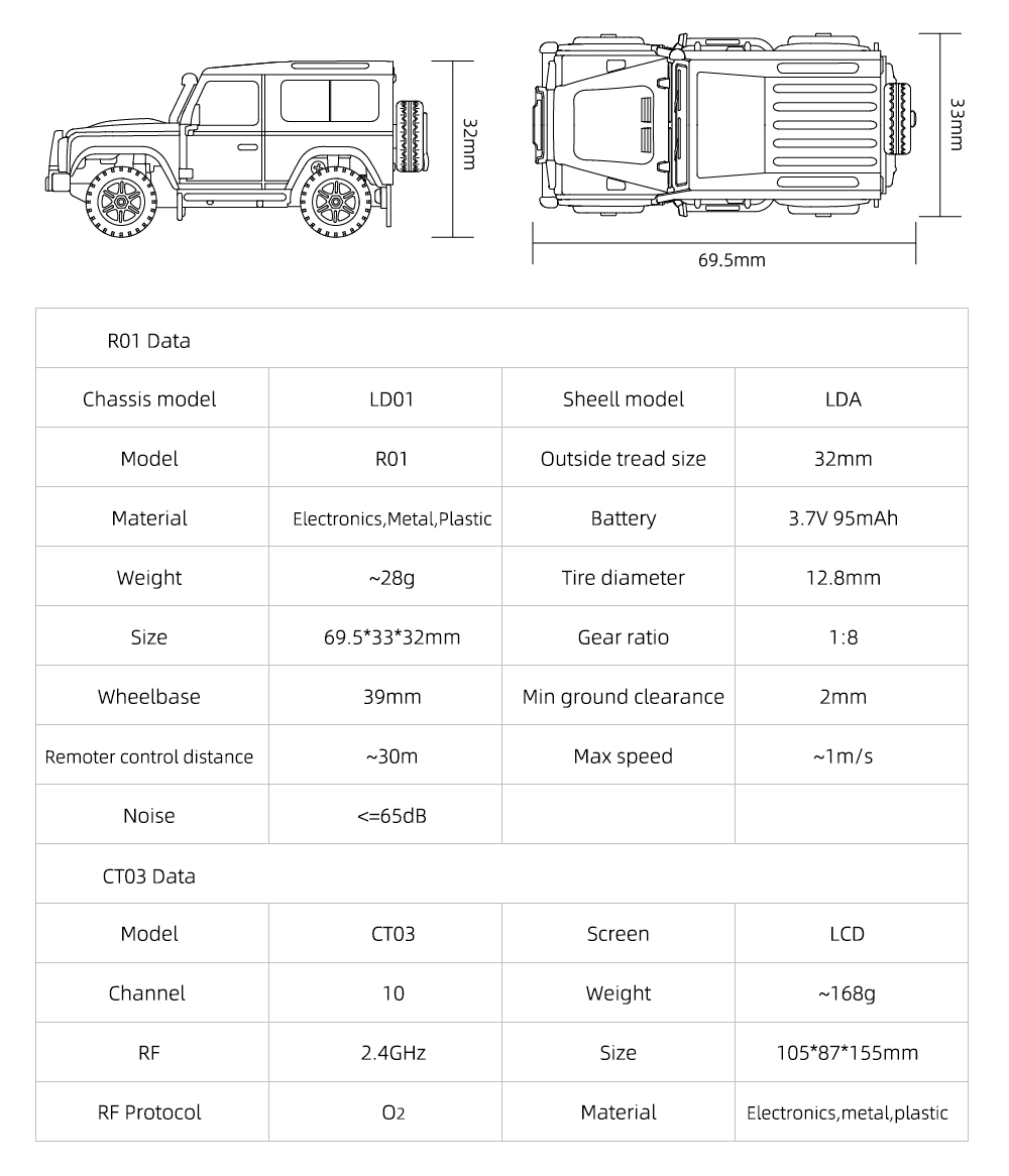 Auton koko: 69.5*33*32 mm Akseliväli: 39 m Pienin maavara: 2 mm Ulkoraideleveys: 32 mm Renkaan halkaisija: 12.8 mm Kauko-ohjaimen koko: 105*87*155 m Laatikon koko: 120*59*55 mm/190*145*110 mm |
