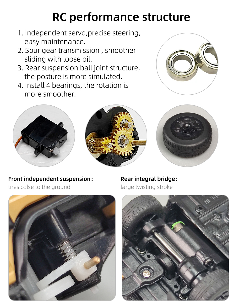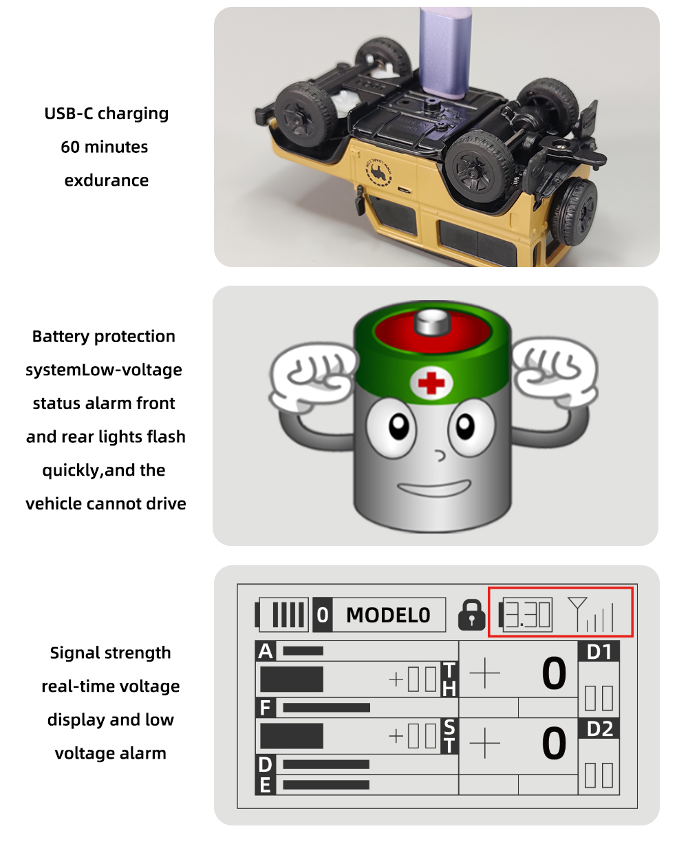 R01 on mittakaavan 1:64 pöytäkokoisen kauko-ohjattavan auton kokoluokkaa, pituus noin 7 cm ja paino noin 28 g. Viimeistely on huolellinen ja ulkonäkö miellyttävä. Nopeus ja ohjauksen herkkyys ovat säädettävissä yhdellä painikkeella, mikä sopii hyvin myös rc-aloittelijoille. Valojärjestelmä on runsas: lähivalot/kaukovalot, suuntavilkut, peruutusvalot, jarruvalot ja hätävilkut. Pehmeät kumiset sivupeilit ja lokasuojat lisäävät realismia ja kestävyyttä. Sekä kauko-ohjain että auto latautuvat USB-laturilla. Ajoneuvon akunkesto on jopa 60 minuuttia kerrallaan. Kauko-ohjattava auto kehittää lasten käden, silmän ja aivojen yhteistyötä ja toimii myös aikuisille pöytästressileluna.