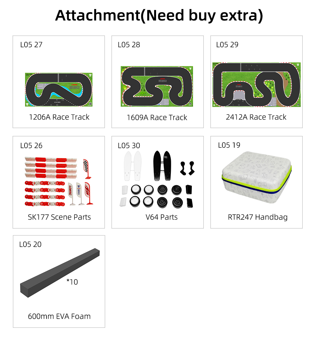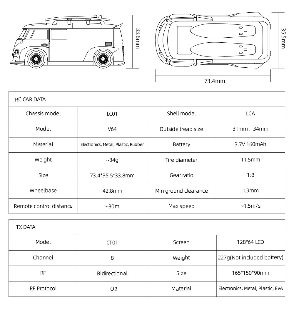 Auton koko: 73.4*35.5*33.8 mm Akseliväli: 42.8 mm Pienin maavara: 1.9 mm Renkaan halkaisija: 11.5 mm Raidan leveys ulkoreunasta: 31 mm, 34 mm Kauko-ohjaimen koko: 165*150*90 mm |