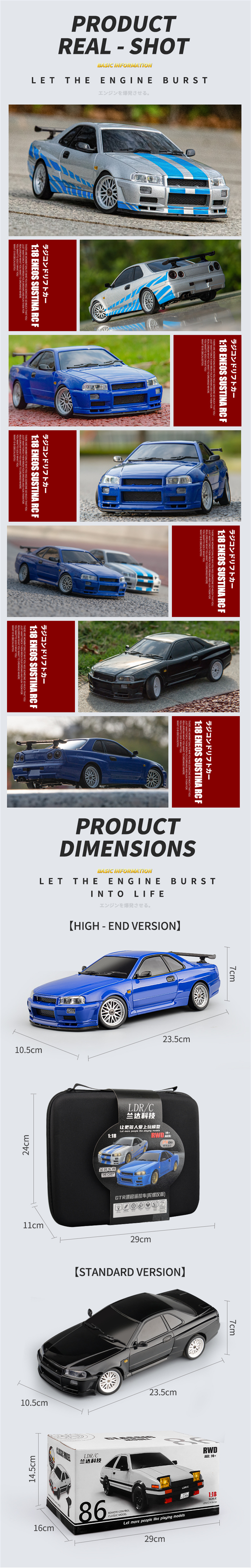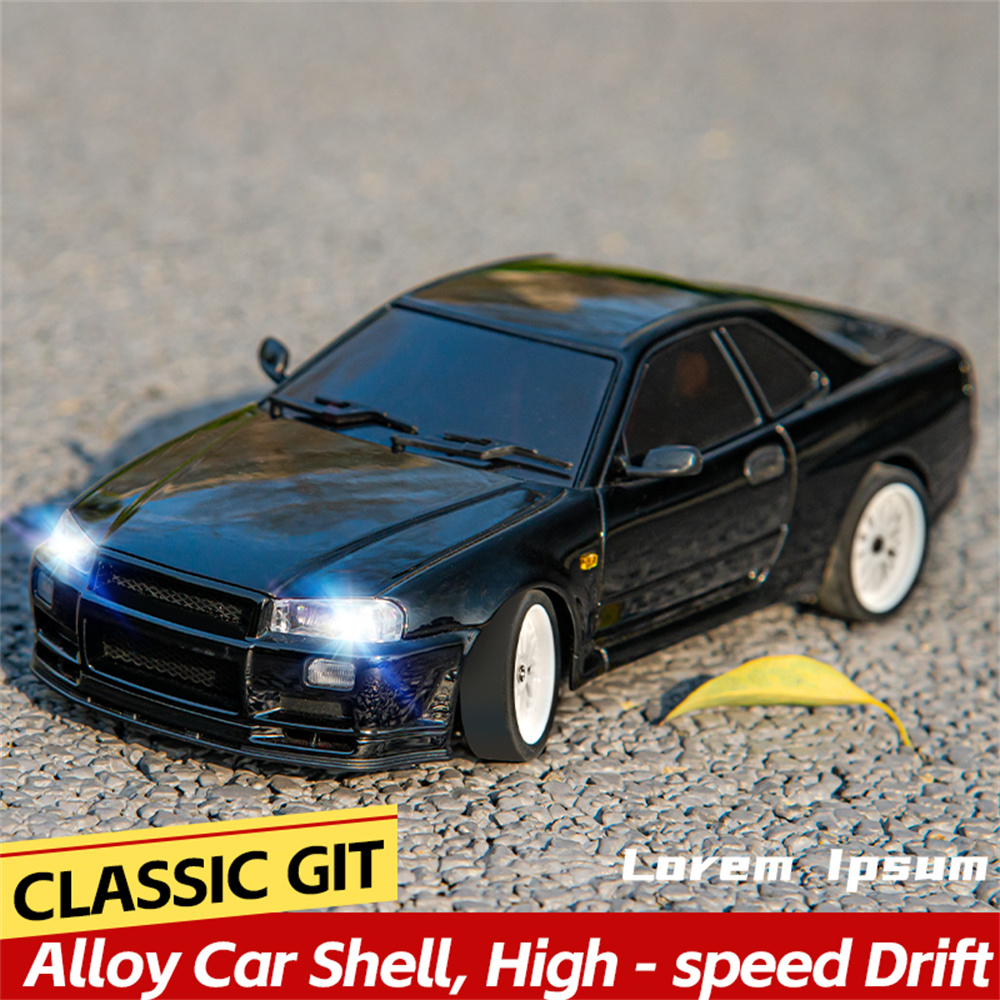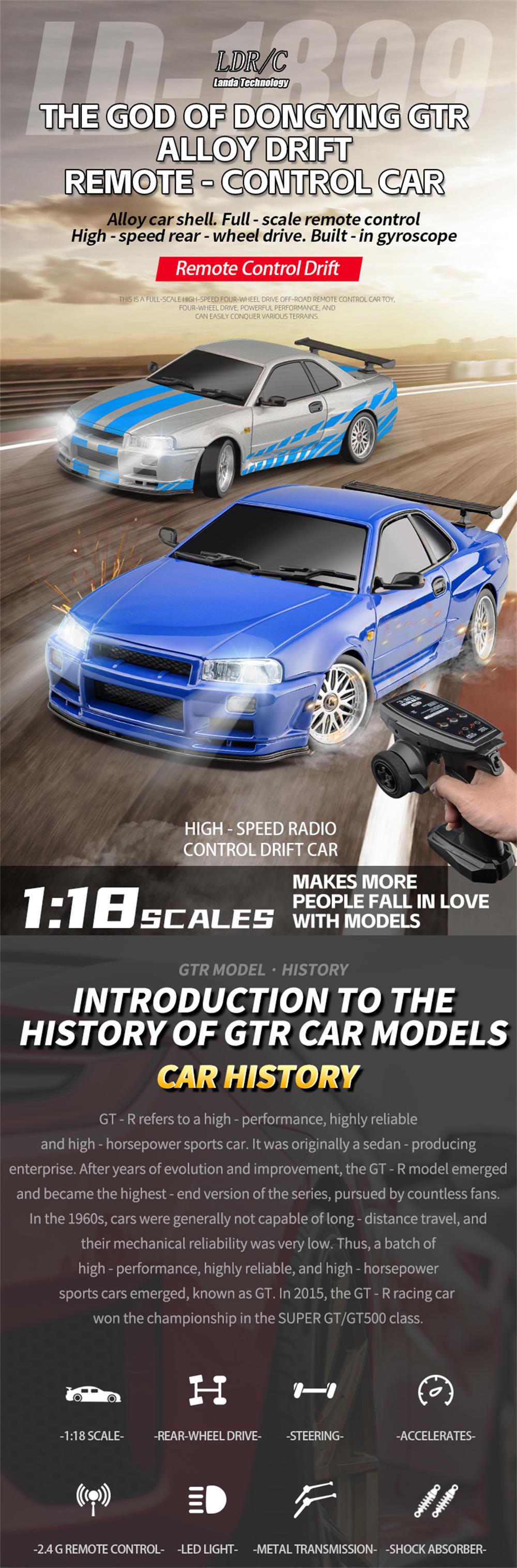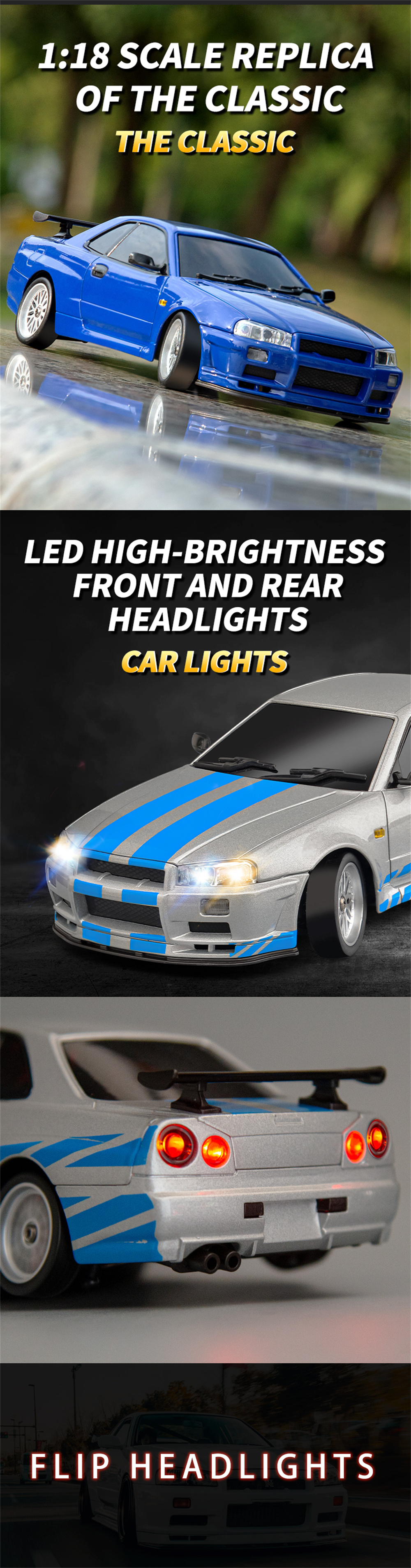 LDRC 1899/A99 valmiiksi koottu 1/18 GTR R34 radio-ohjattava drift-auto takaveto gyroskooppi LED-valot