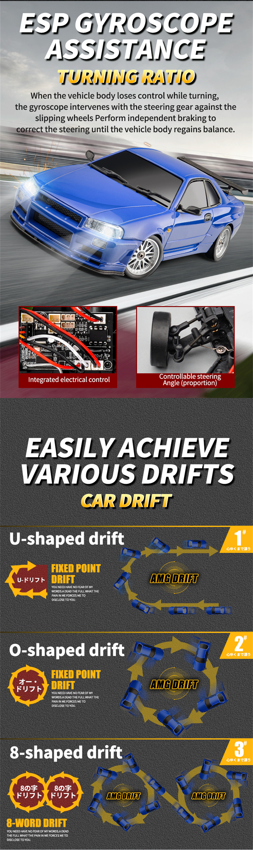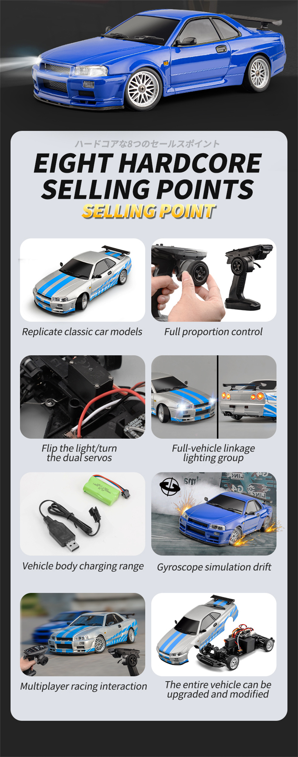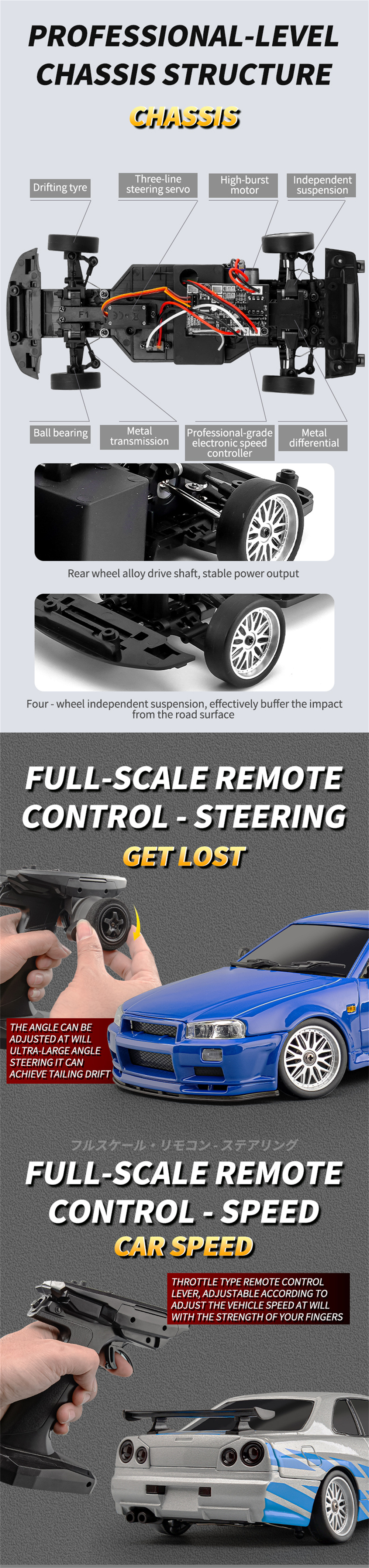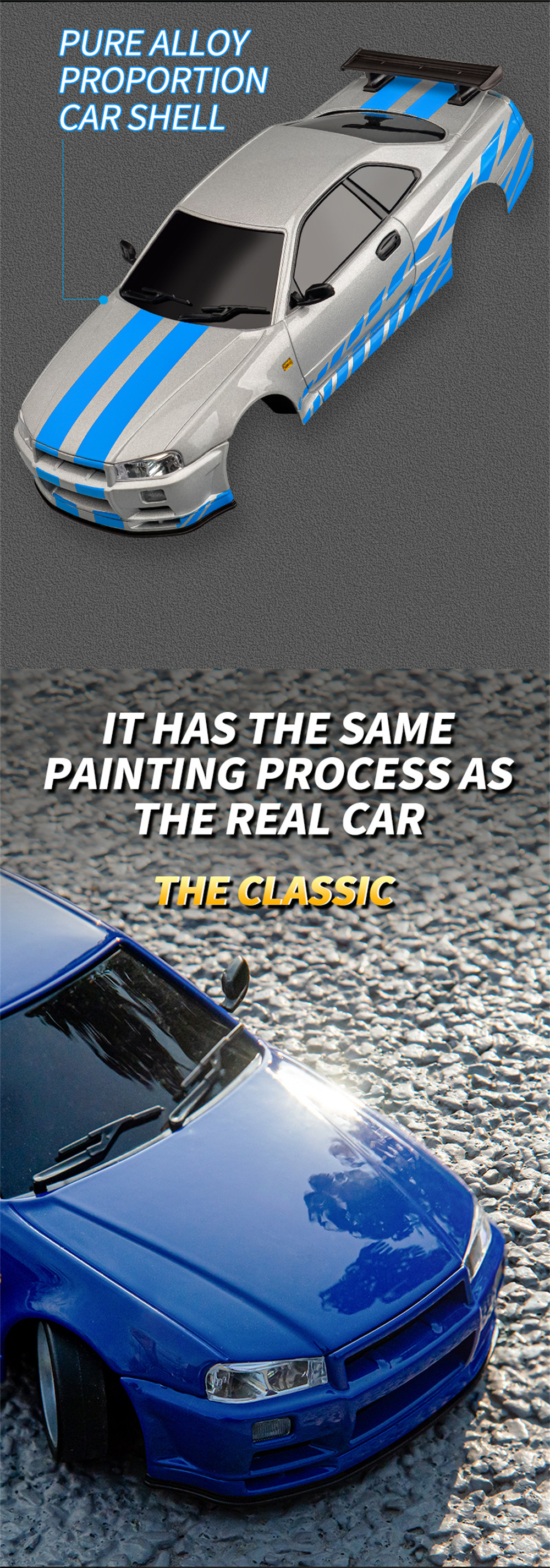LDRC 1899/A99 valmiiksi koottu 1/18 GTR R34 radio-ohjattava drift-auto takaveto gyroskooppi LED-valot