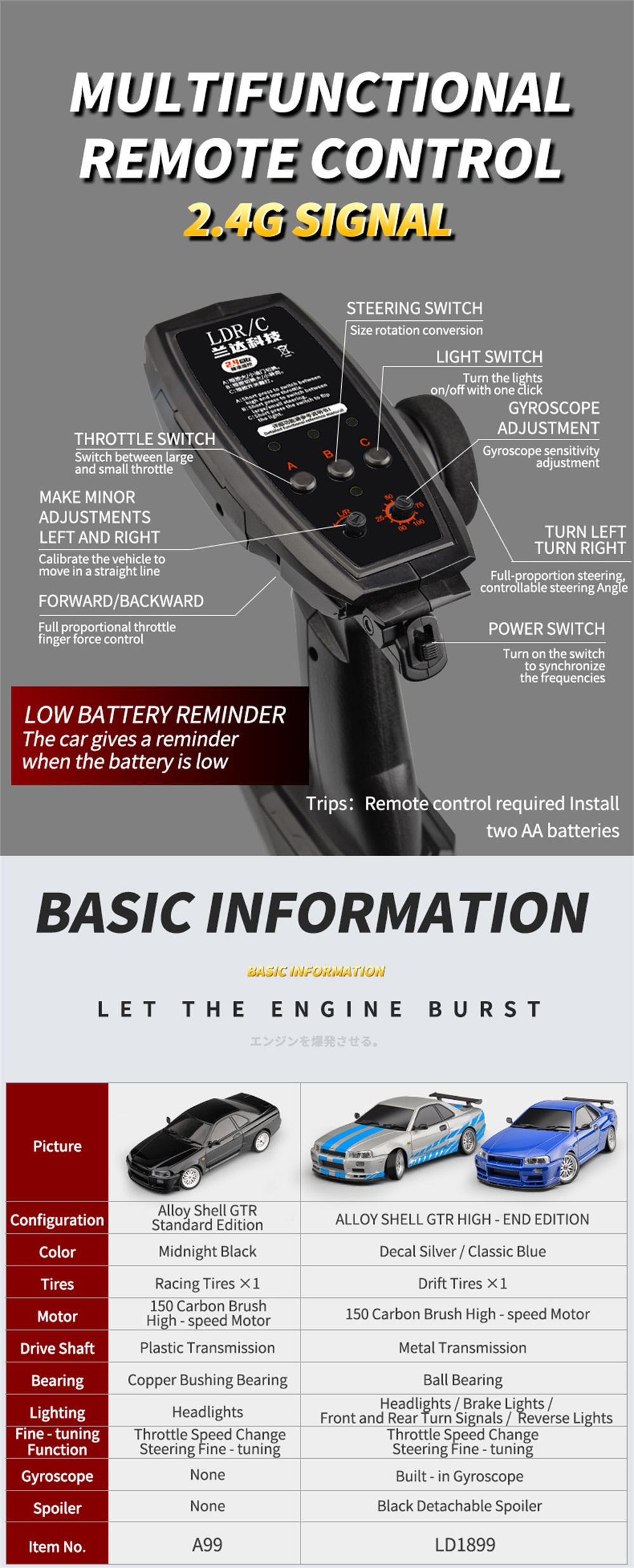 1:18-skaalan LDR/C 1899/A99 on pienikokoinen driftaus-auto, jossa on moninivelinen rakenne ja realistinen ulkonäkö esikuvan mittasuhteiden mukaan. Metallinen simuloitu kori, sisäänrakennettu gyroskooppiavustus (vain 1899), 2.4G 3-kanavainen kaukosäädin äänimerkillä, metallinen voimansiirtoakseli ja räätälöity 150-nopeusmoottori tuovat vakaata suorituskykyä. Driftausrenkaat ja kaukosäätimellä ohjattavat ajovalot lisäävät ajokokemusta. Autossa on nelipyöräinen riippumaton jousitus, koko auton kuulalaakerointi, 9g ohjausservo sekä täysin portaattomasti säädettävä kaasu ja ohjaus.