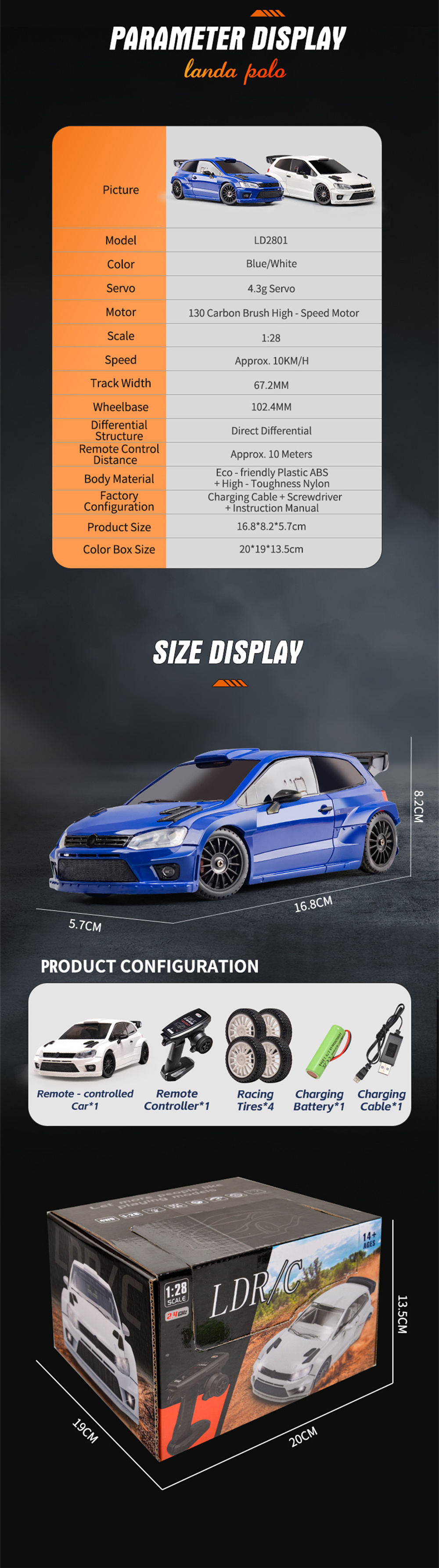 1:28-mittakaavainen LDR/C 2801 -driftausauto tarjoaa hauskaa ajoa sisällä ja ulkona. Täysproportionaalinen kaasu ja ohjaus, 2.4G-kauko-ohjain sekä suojatut elektroniikkakomponentit tekevät siitä sopivan sekä aloittelijoille että harrastajille.