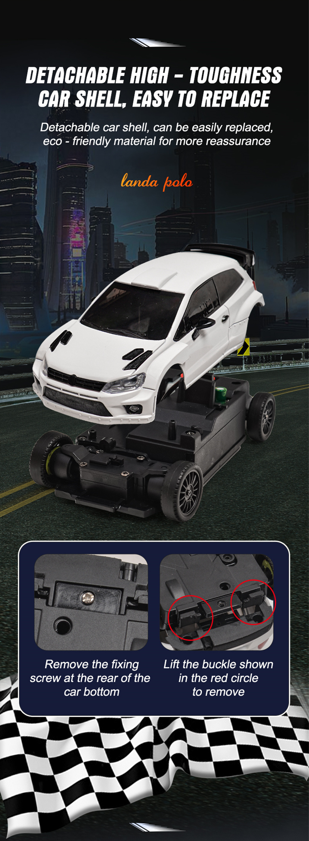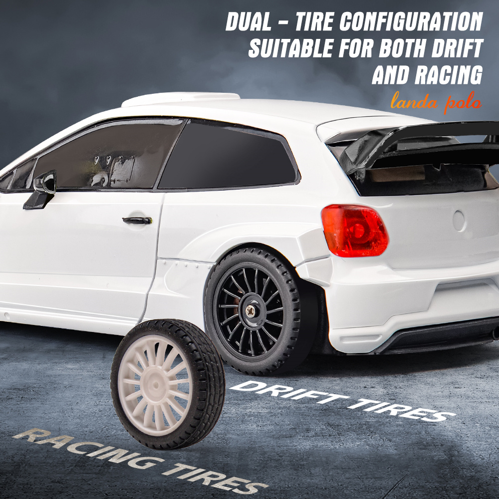 - Driftausauto, jossa monivarsirakenne ja 1:28-mallinnus oikeasta autosta mittasuhteet säilyttäen.