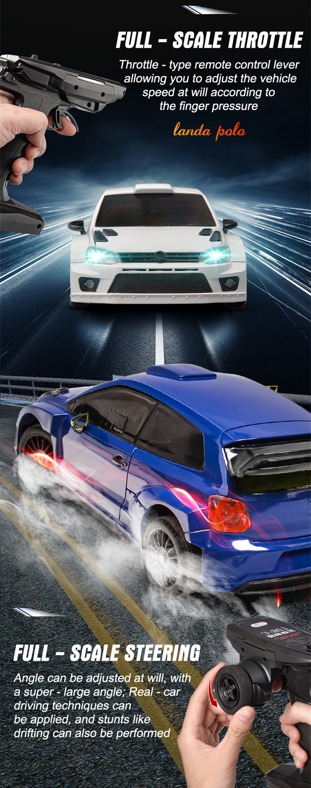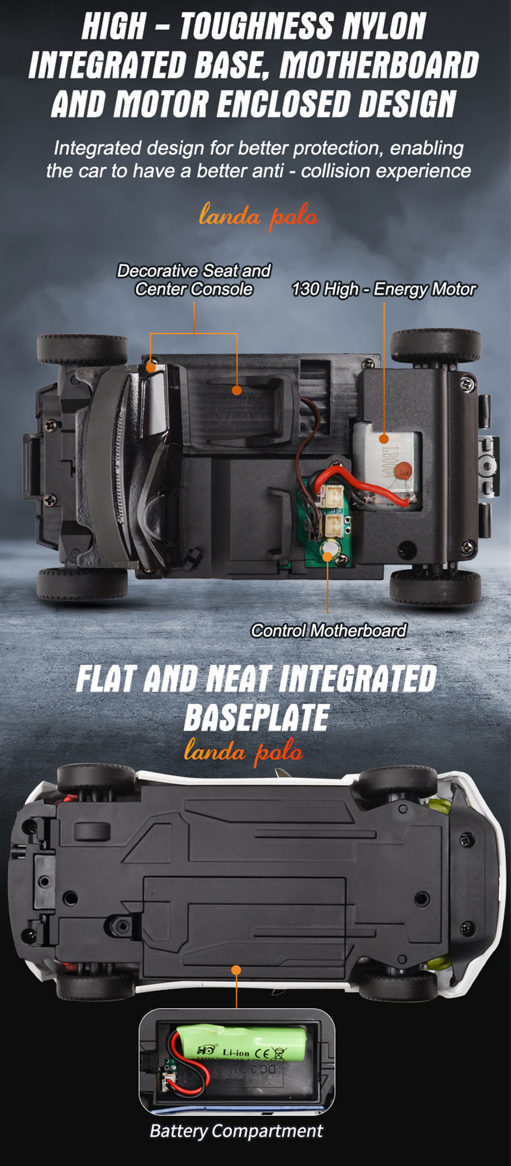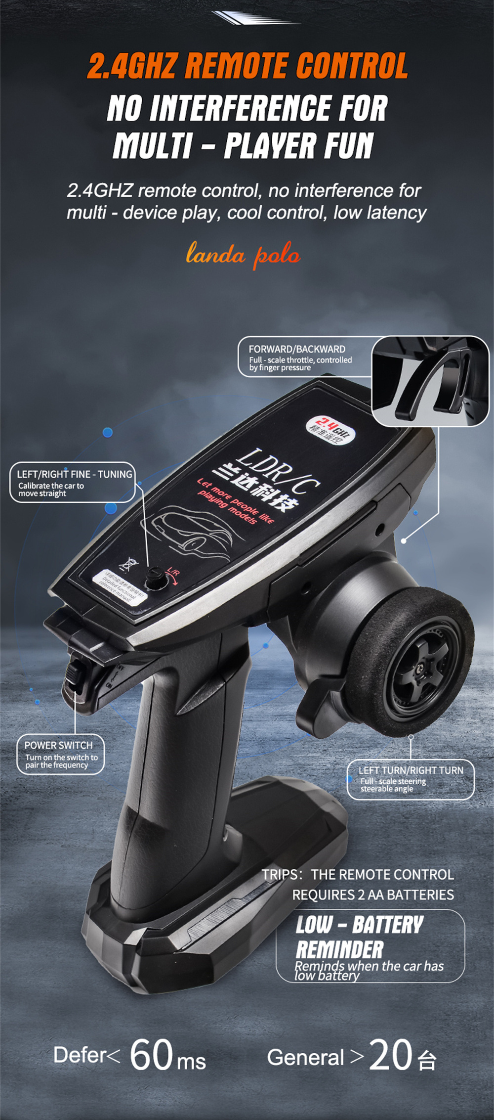 - 2.4G-kauko-ohjaus automaattisella taajuuden muodostuksella, useampi auto voi ajaa samanaikaisesti.