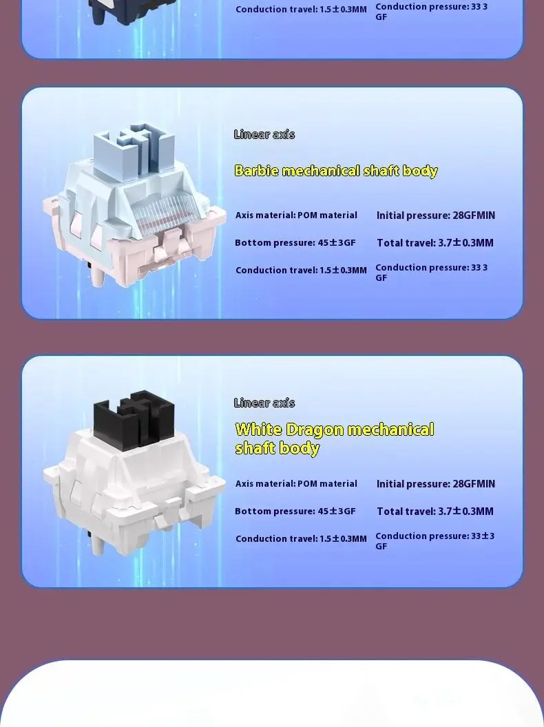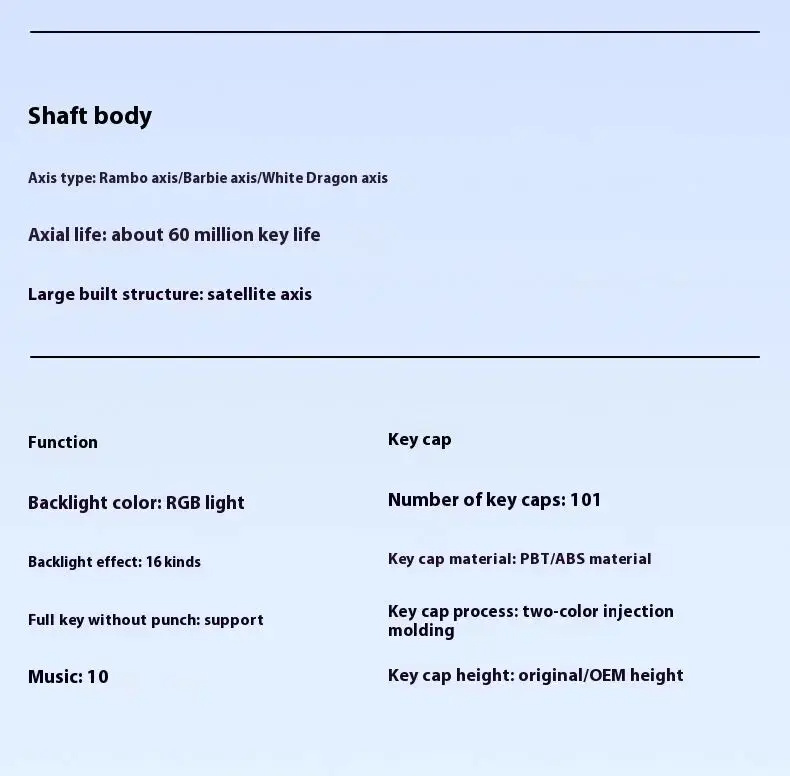 | Näppäinhatut | Kaksivärivalu, ABS (White Dragons -kytkin) / PBT (Rambo/Barbies -kytkin) |