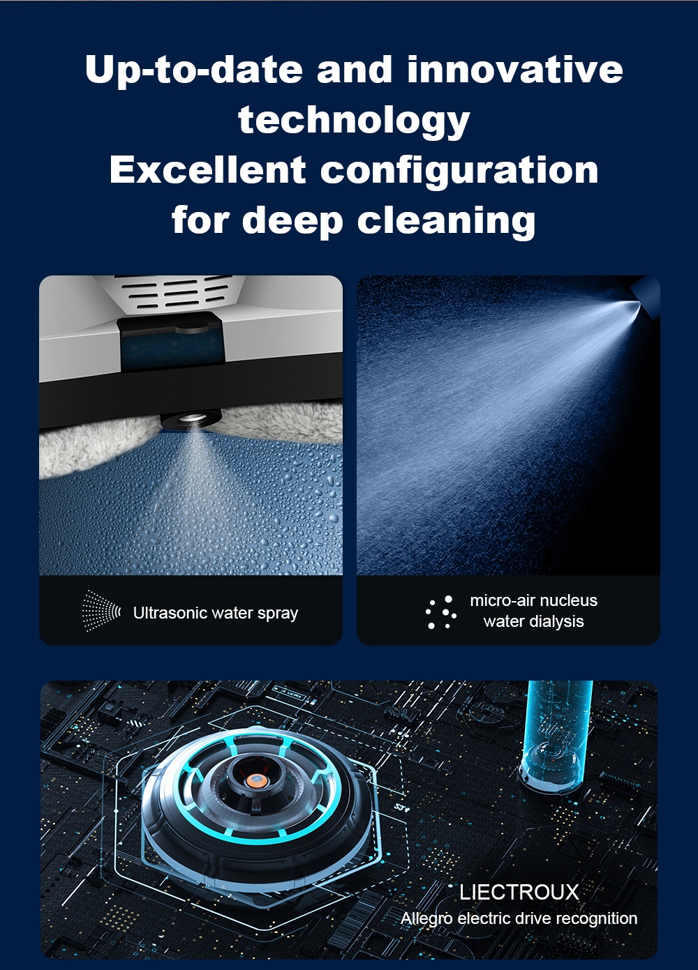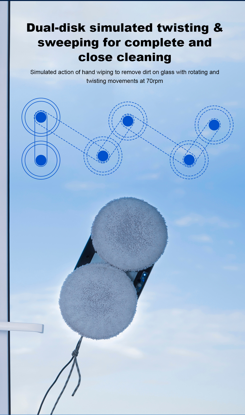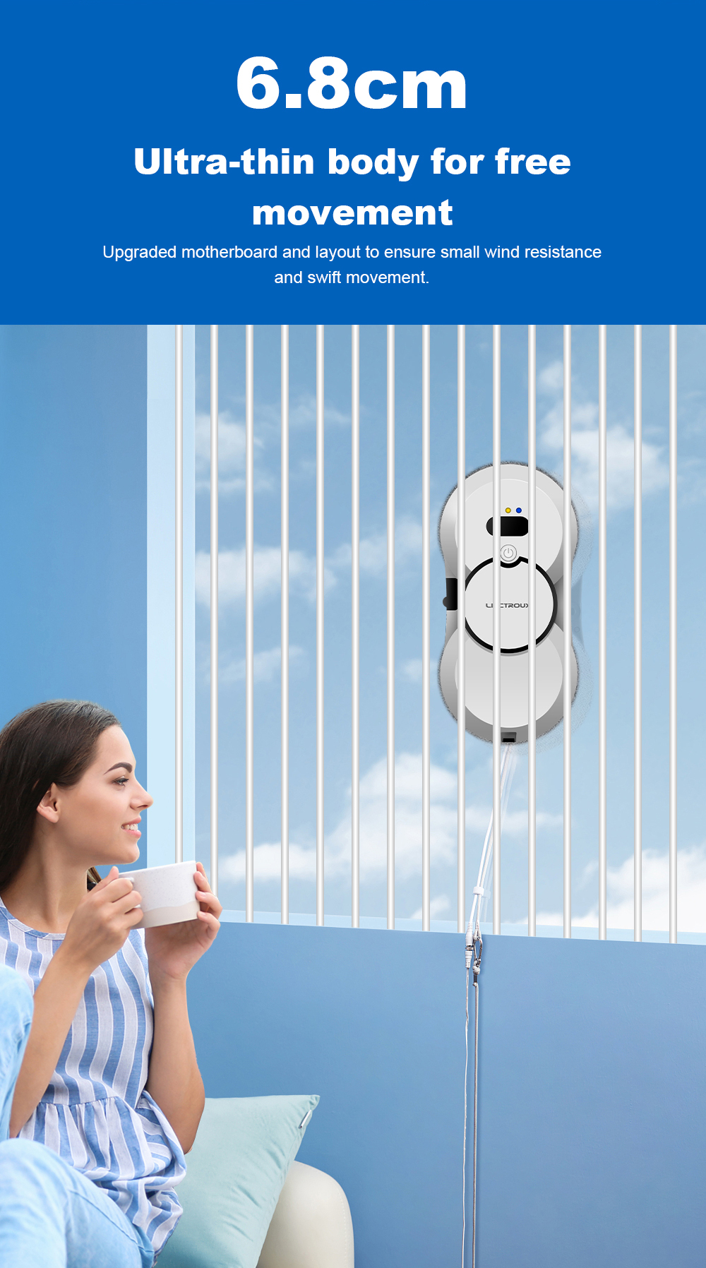 Älykäs ikkunanpesurobotti helpottaa pystypintojen puhdistusta kotona. Tehokas imuteho pitää laitteen tiukasti kiinni lasissa, ja ves sumutus auttaa irrottamaan likaa. Ohut runko liikkuu ketterästi, ja laite toimii joko automaattisesti tai mukana tulevalla infrapunakaukosäätimellä. UPS-varmistus ja turvaköysi lisäävät turvallisuutta.