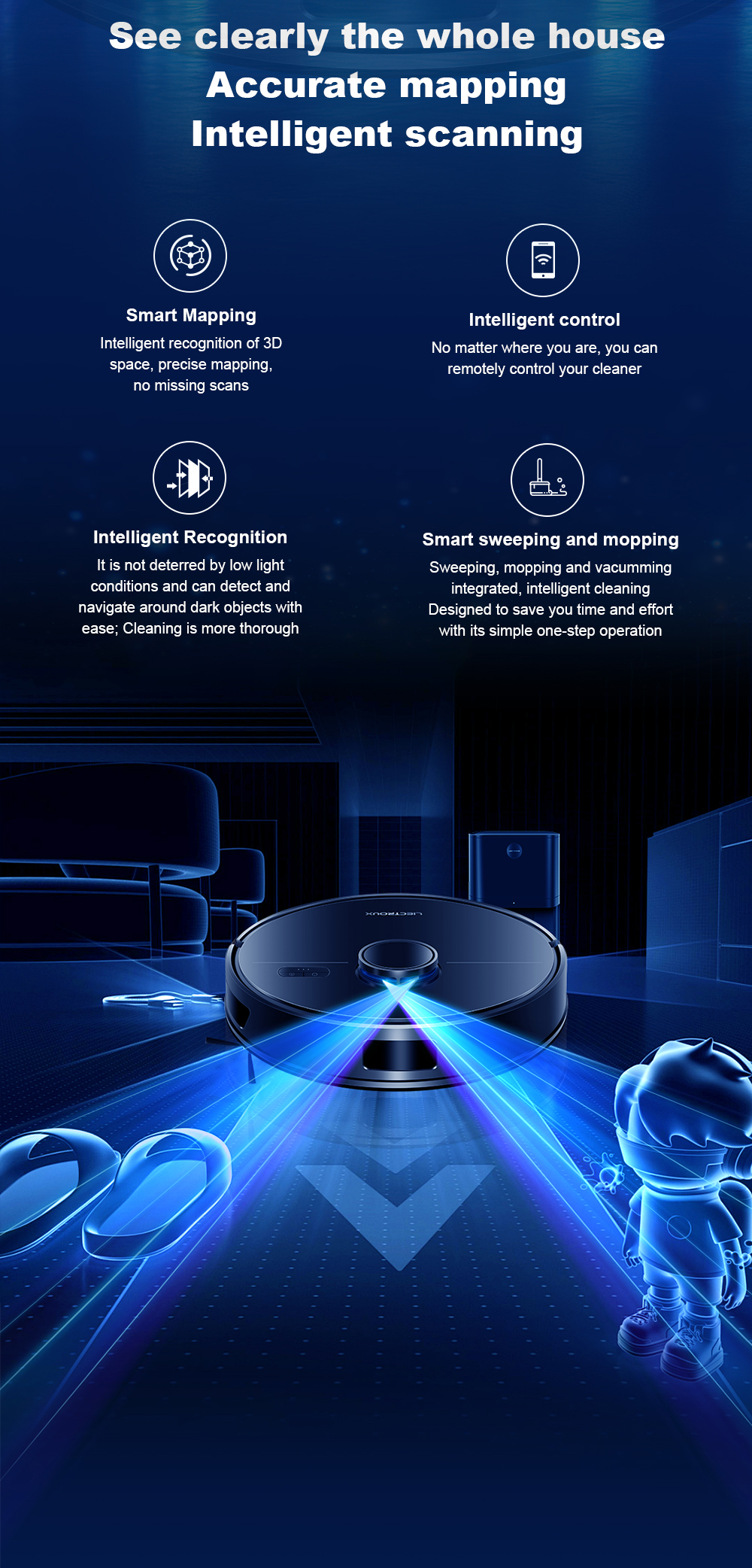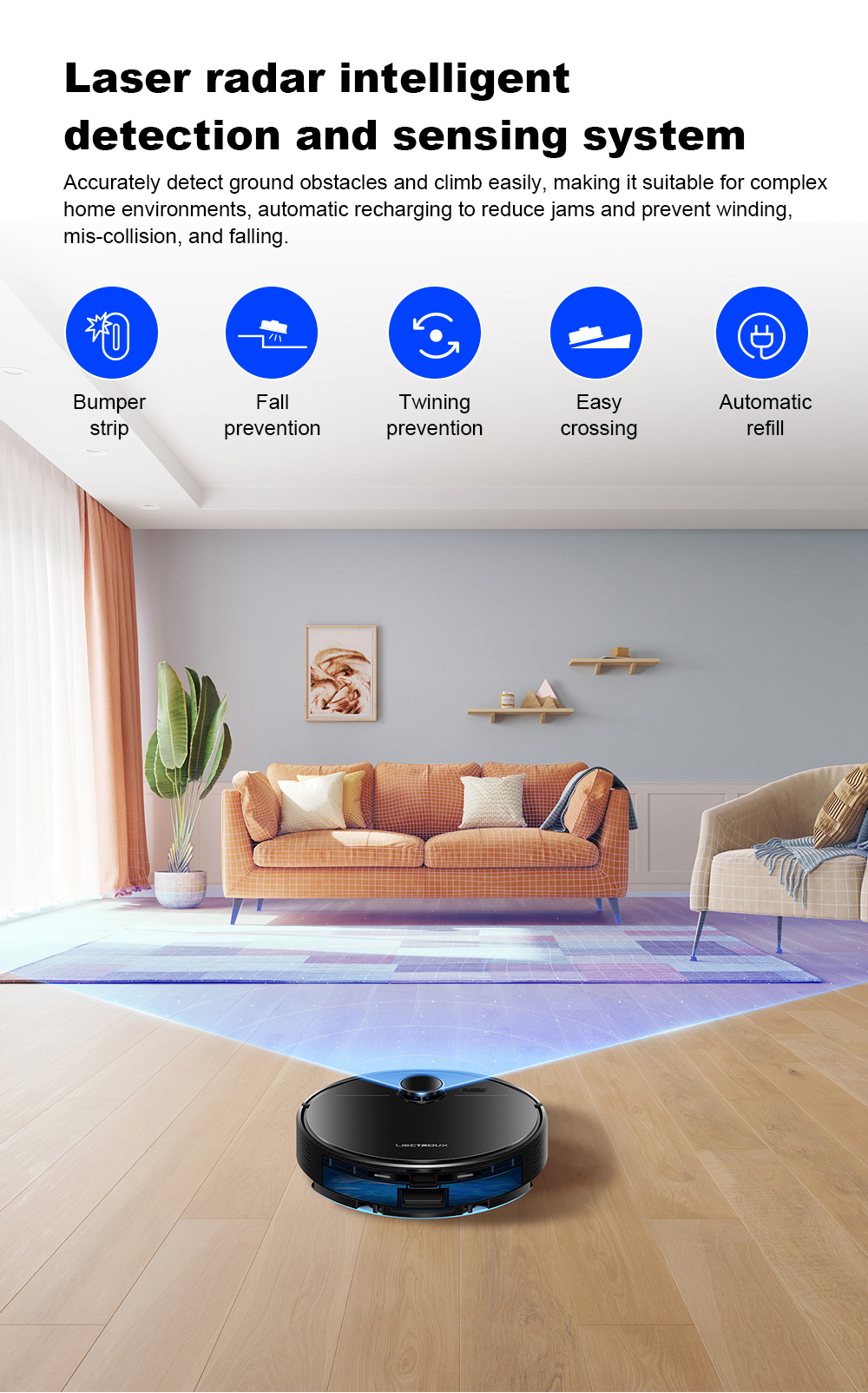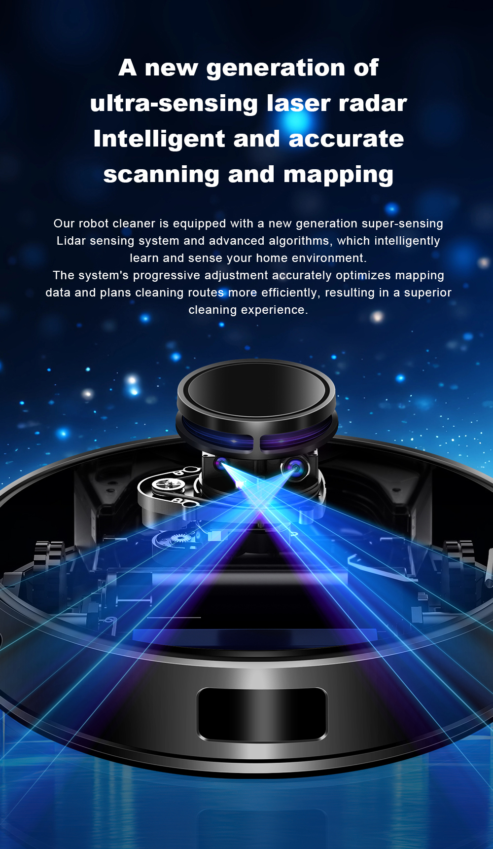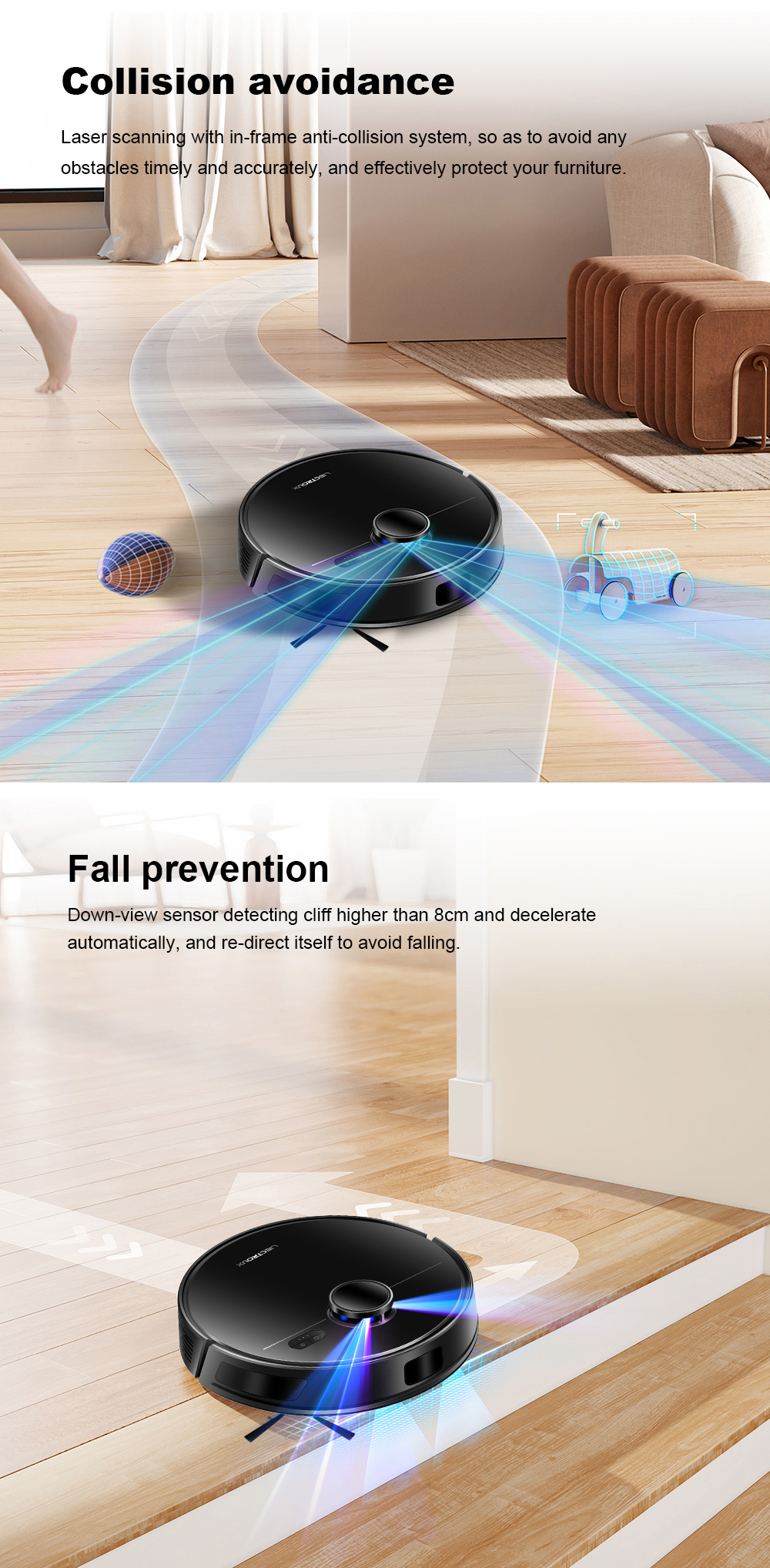 Edistynyt LDS LiDAR -navigointi: 360° skannaus ja nopea kartoitus tunnistavat kotisi pohjaratkaisun ja suunnittelevat siivousreitit älykkäästi. Koko kodin kattavuus vähentää ohituksia. Täysi anturisarja väistää esteitä, suojaa seiniä ja huonekaluja sekä estää juuttumisen tai putoamisen portaista.