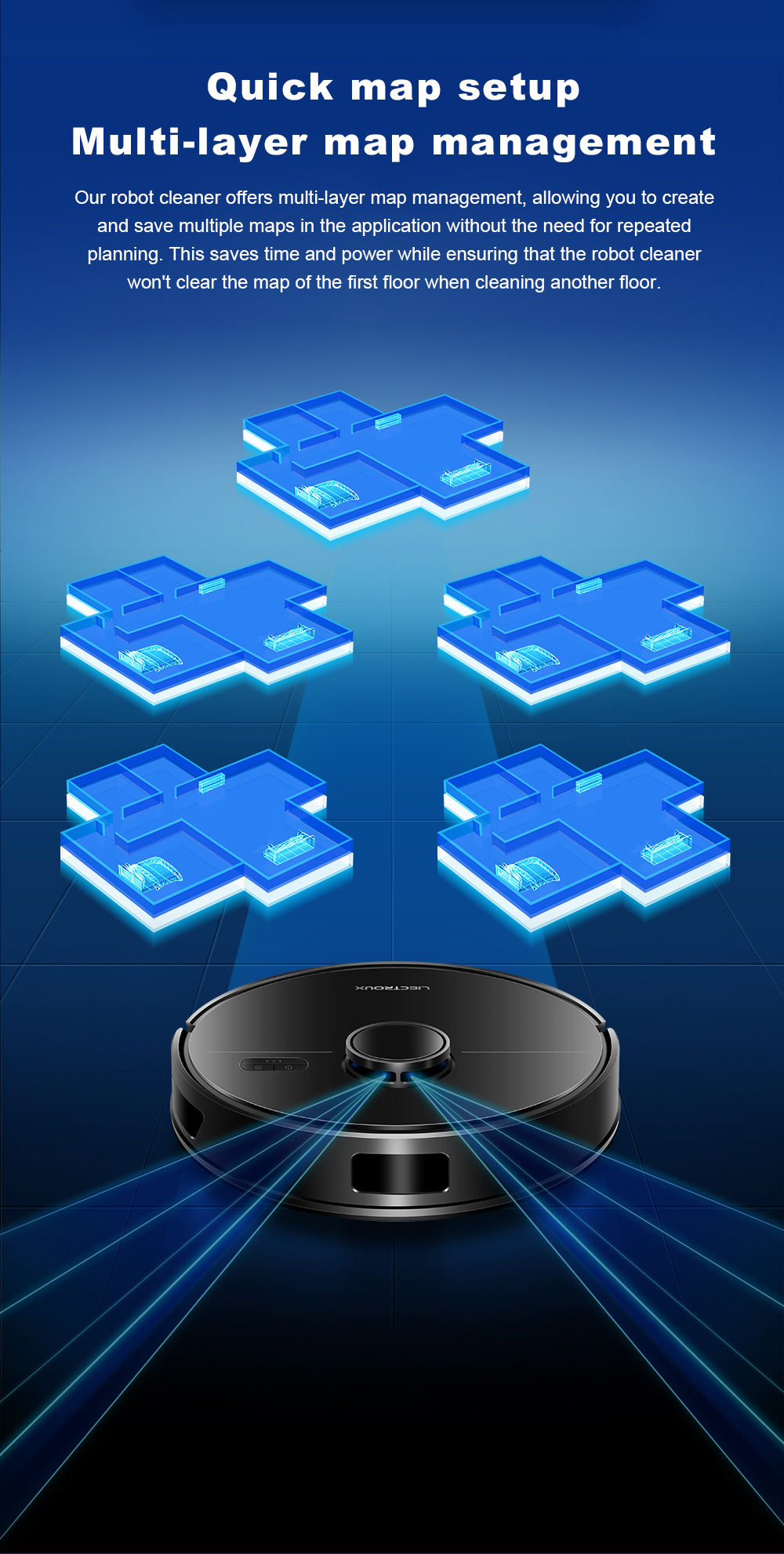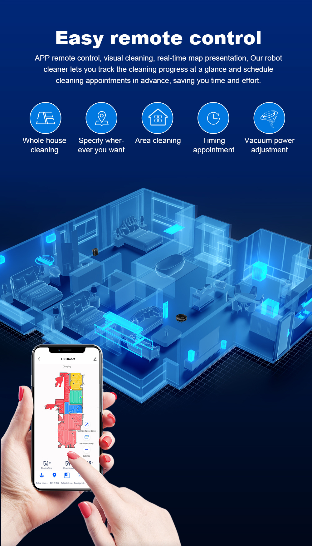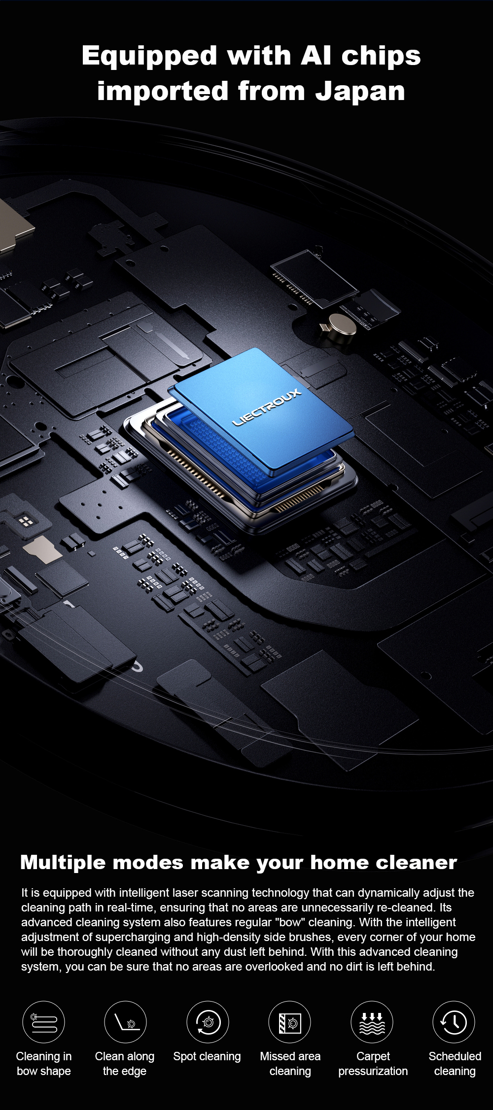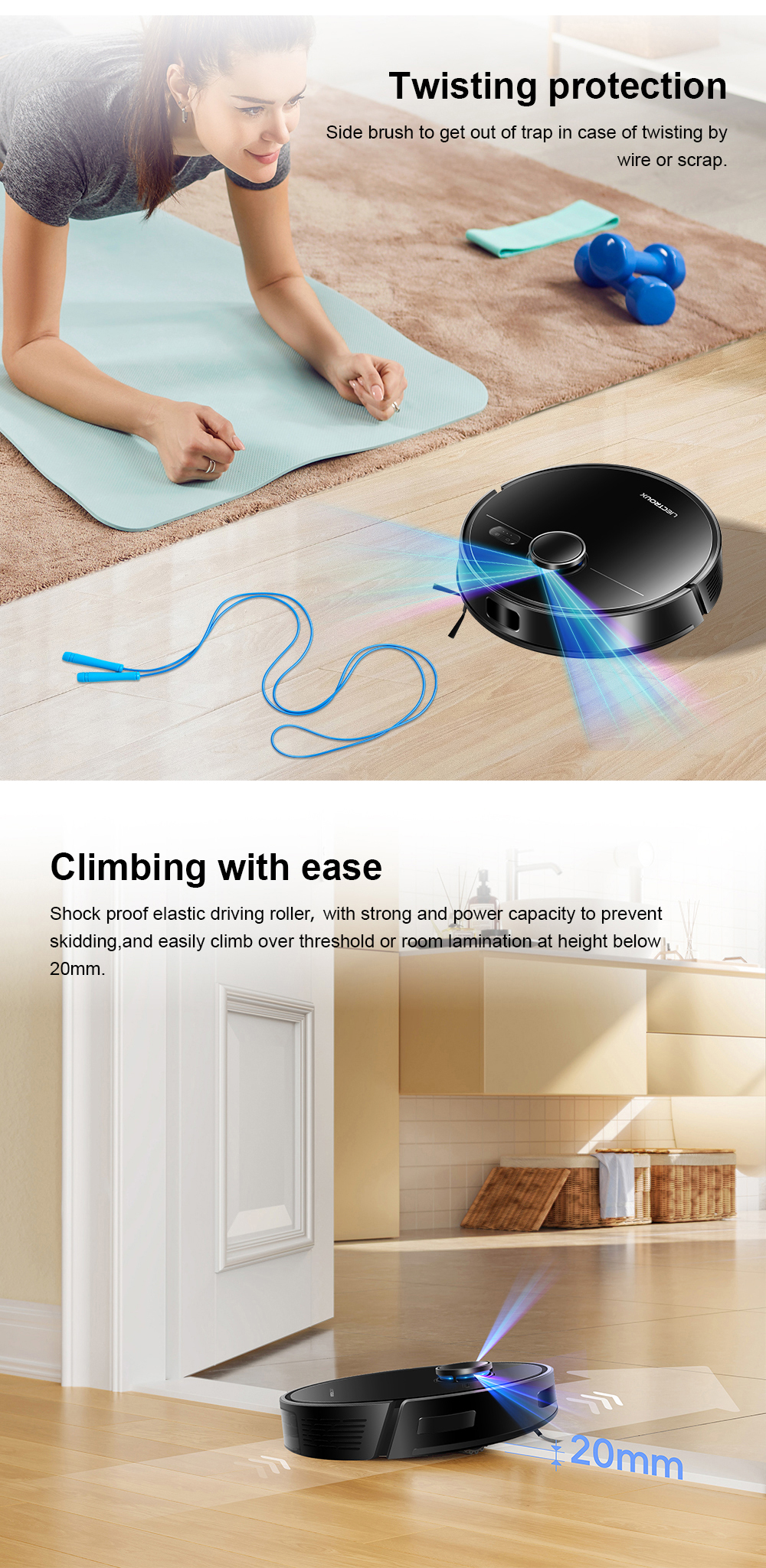 Edistynyt LDS LiDAR -navigointi: 360° skannaus ja nopea kartoitus tunnistavat kotisi pohjaratkaisun ja suunnittelevat siivousreitit älykkäästi. Koko kodin kattavuus vähentää ohituksia. Täysi anturisarja väistää esteitä, suojaa seiniä ja huonekaluja sekä estää juuttumisen tai putoamisen portaista.