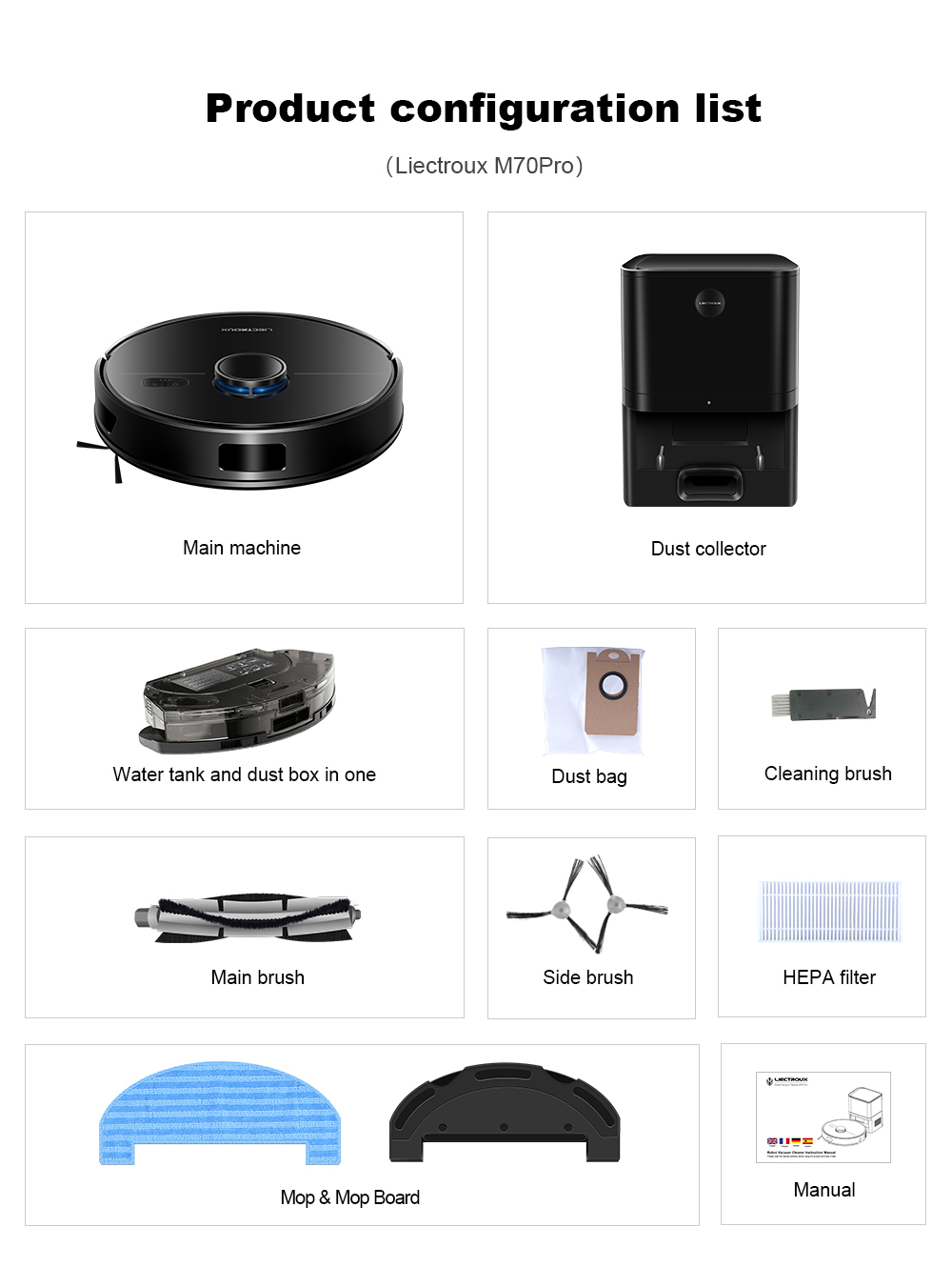 LIECTROUX M70 Pro robotti-imuri ja moppi, itsetyhjentyvä 3 l pölypussi, 6500Pa imuteho