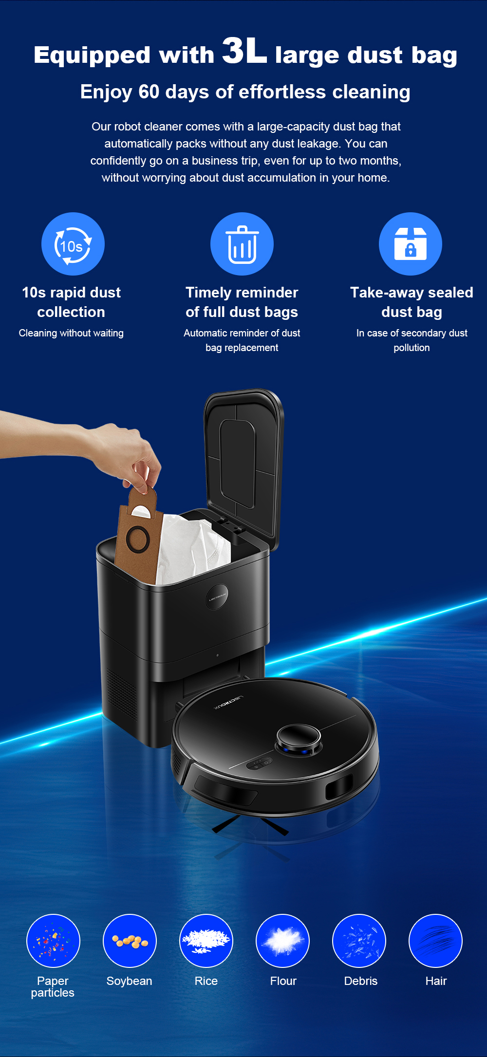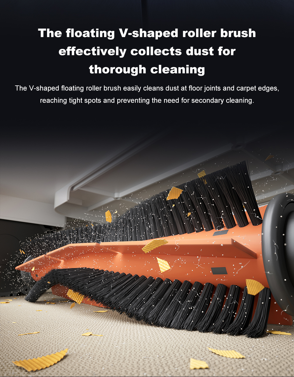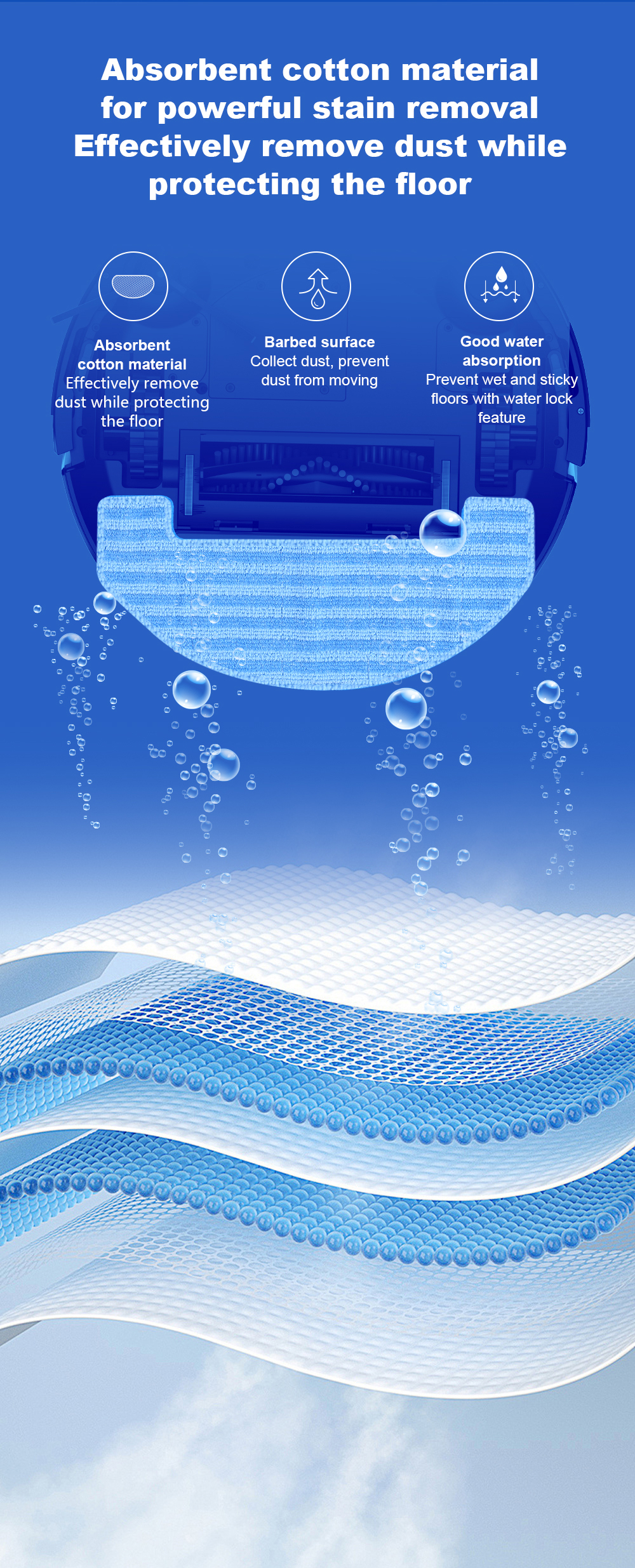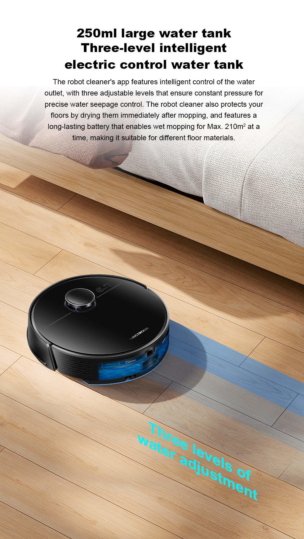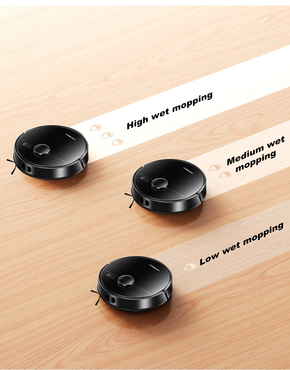 3-in-1 lakaisu, imurointi ja moppaus: Sivuharjat, V-muotoinen pääharja ja moppitaso toteuttavat 3-vaiheisen puhdistuksen, mikä tehostaa siivousta. 340 ml suurikokoinen pölysäiliö vähentää tyhjennystarvetta. 250 ml elektronisesti ohjattu vesitankki mahdollistaa tarkan, vuotamattoman veden syötön ja 3 tason säädön. Y-muotoinen moppaus jäljittelee käsin tehtävää moppia ja puhdistaa perusteellisesti.