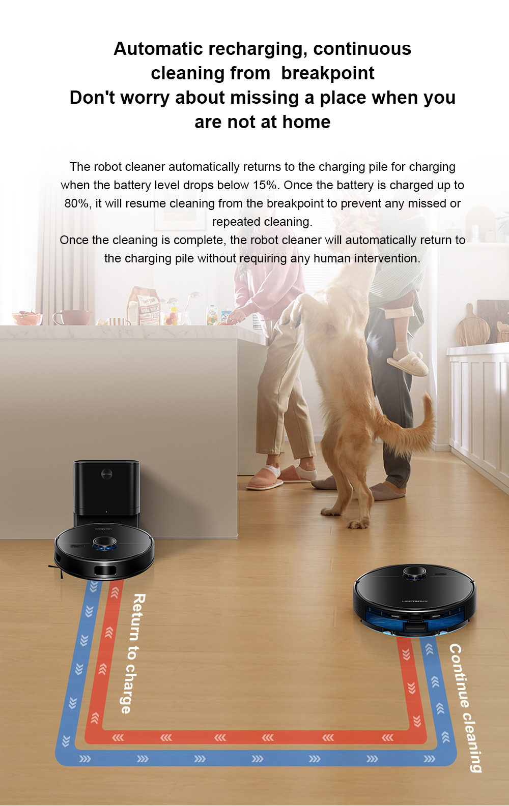 Max. 175 min käyttöaika ja automaattinen lataus: Käyttöaika on 110–175 min asetuksista riippuen, ja siivousalue jopa 2260 neliöjalkaa. Kun akun varaus on alhainen, robotti palaa telakalle latautumaan, jos siivous on kesken, se latautuu 80 %:iin ja jatkaa siitä mihin jäi.