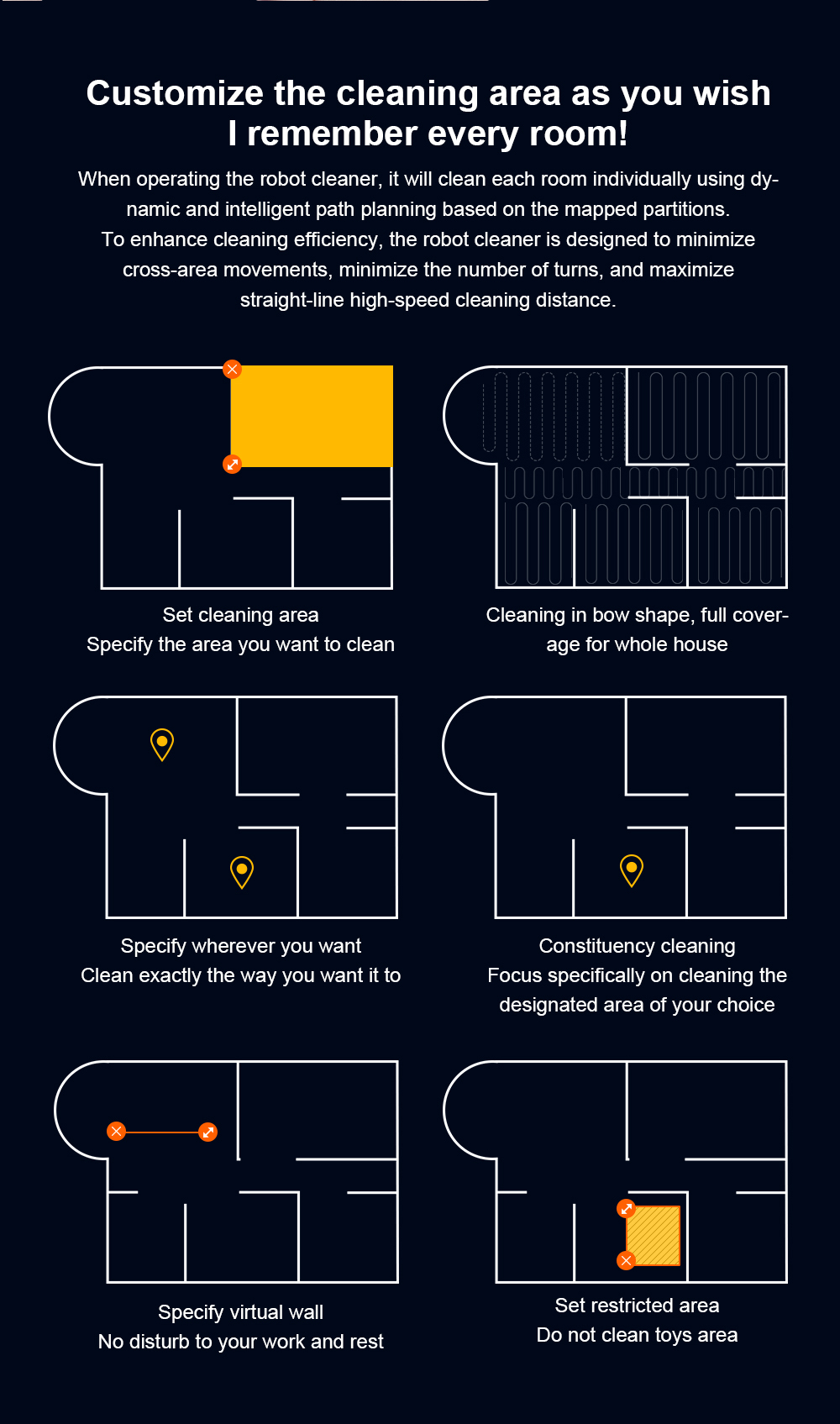 Räätälöity siivous + 30 kiellettyä aluetta: Automaattinen, reunojen, alueen, pisteen, kaksinkertainen ja ajastettu siivous sekä Y-muotoinen moppaus ja Z-tila. Luo oma siivoussuunnitelma: määritä aika, imuteho jne. Määritä sovelluksella jopa 30 virtuaalista kiellettyä aluetta (esim. matto-, lemmikki- tai lasten leikkialue).
