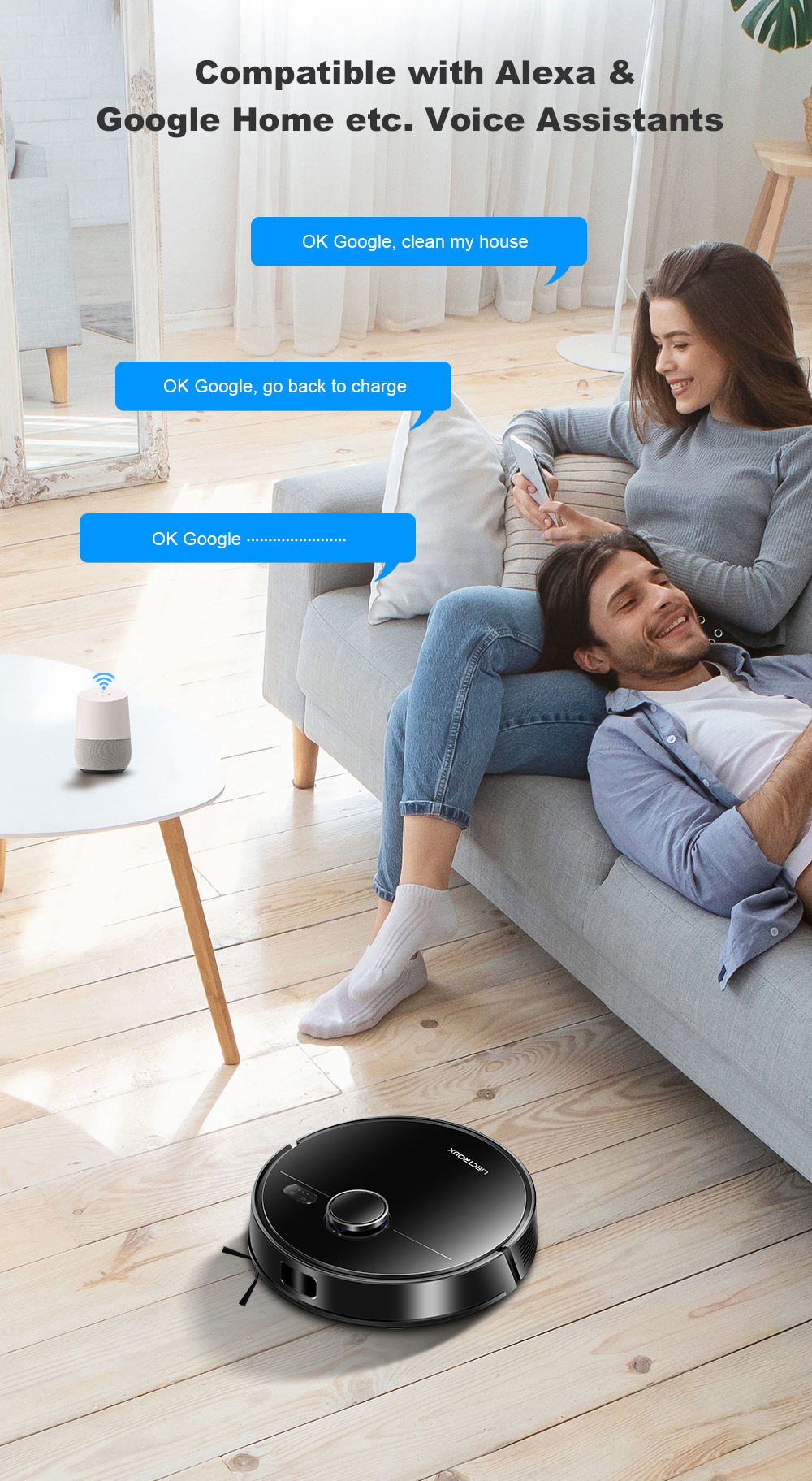 Älykkäät sovellus- ja ääniohjaukset: Smart Life Tuya -sovelluksella voit seurata reittejä, ajastaa siivouksia, säätää imua ja veden määrää, vaihtaa tiloja, luoda rajattuja alueita ja tallentaa 5 muokattavaa karttaa. Yhteensopiva Alexa- ja Google Assistant -äänikomentojen kanssa (vain 2.4GHz Wi‑Fi).