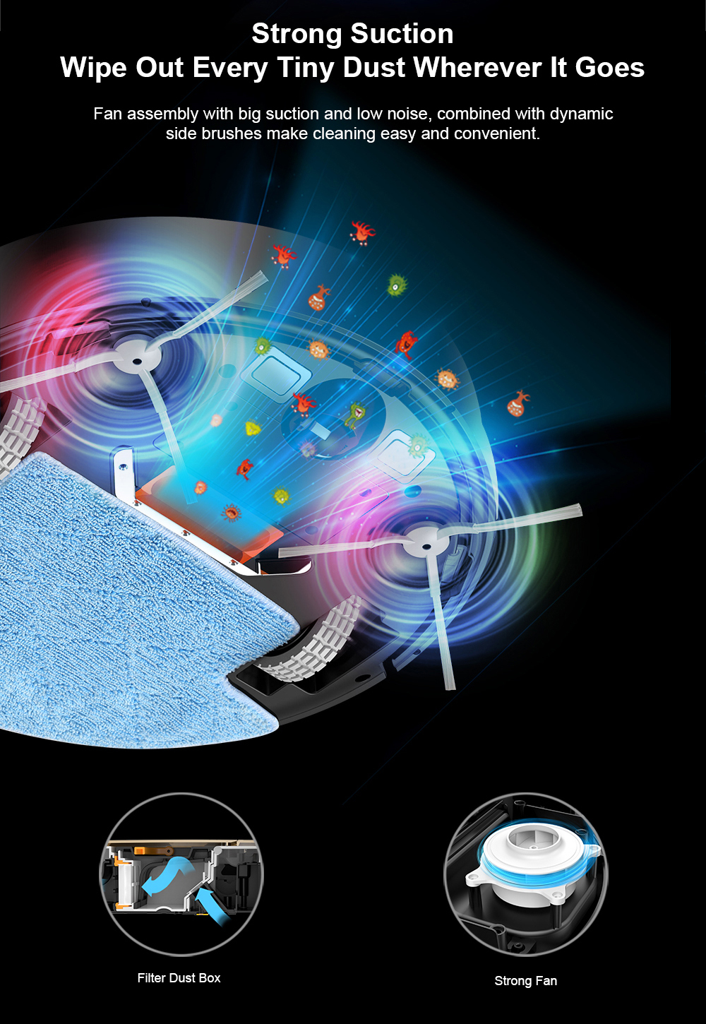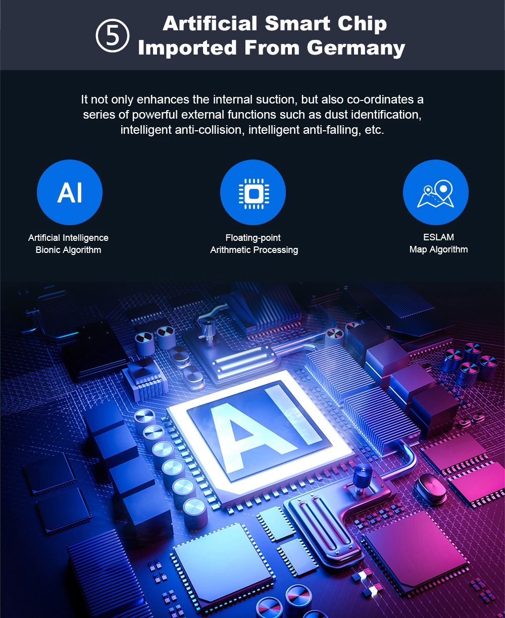Tehostaa imua ja ohjaa toimintoja, kuten pölyn tunnistus, älykäs törmäyksenesto ja älykäs putoamisenesto.