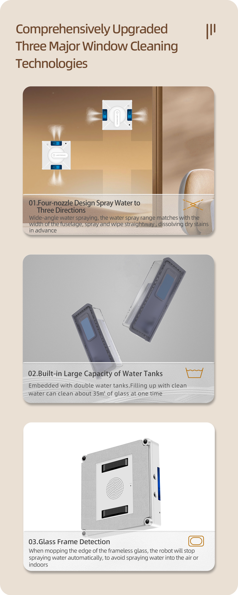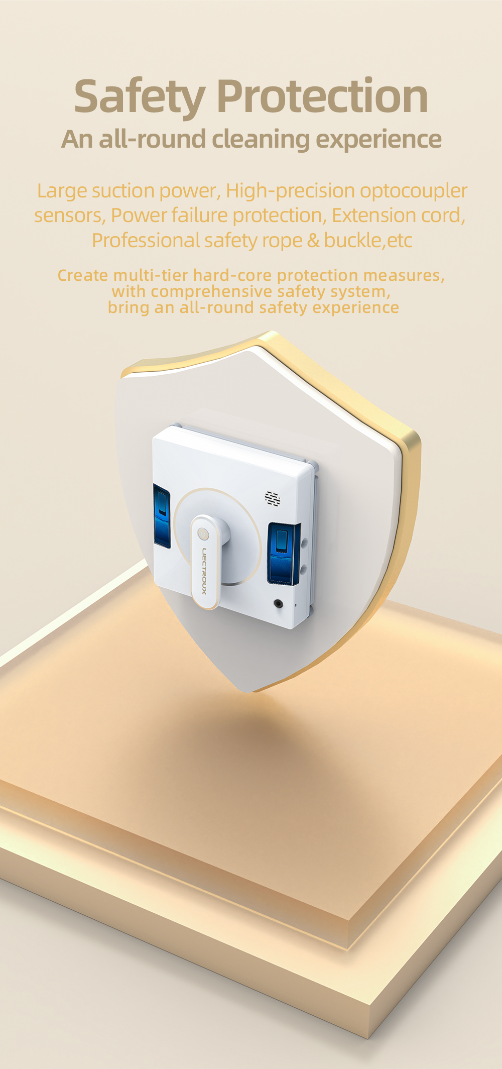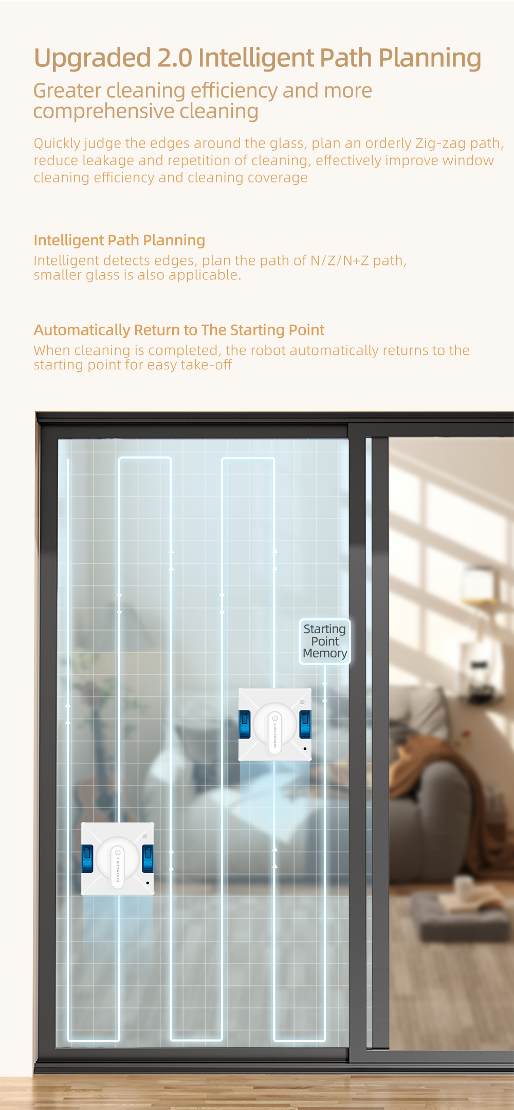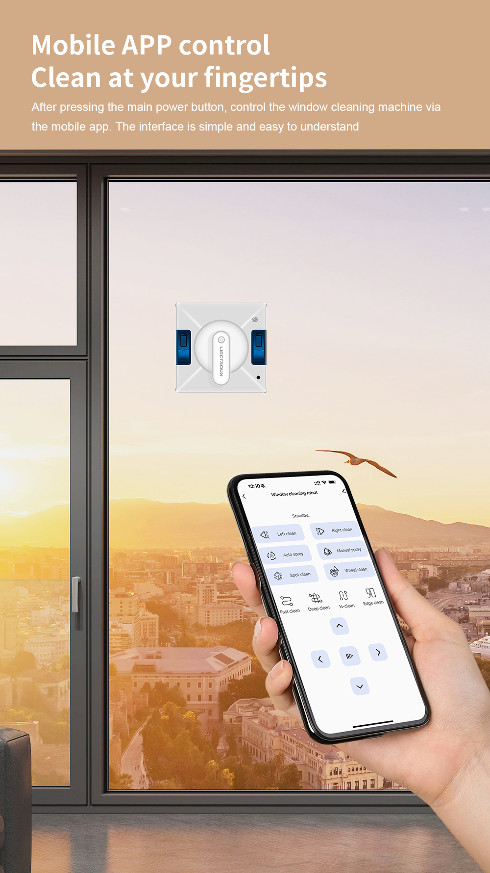 Älykäs ikkunanpuhdistusrobotti, jossa on vesisumutus kolmeen suuntaan (vasen, oikea, alas), älykäs reittisuunnittelu ja käyttö sekä kehystetyllä että kehyksettömällä lasilla. Kaukosäädin helpottaa käyttöä, ja turvaominaisuuksiin kuuluvat putoamisen esto, UPS-virtakatkossuoja sekä turvaköysi ja -soljet.