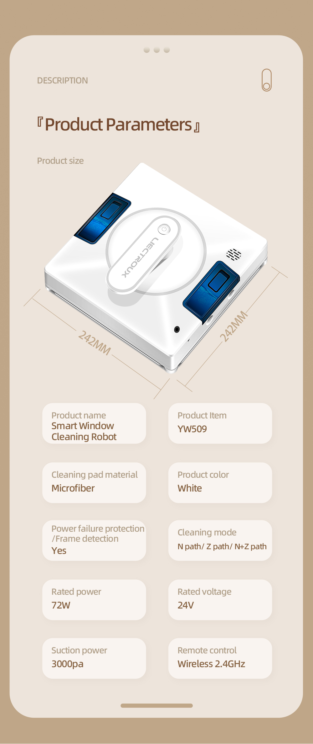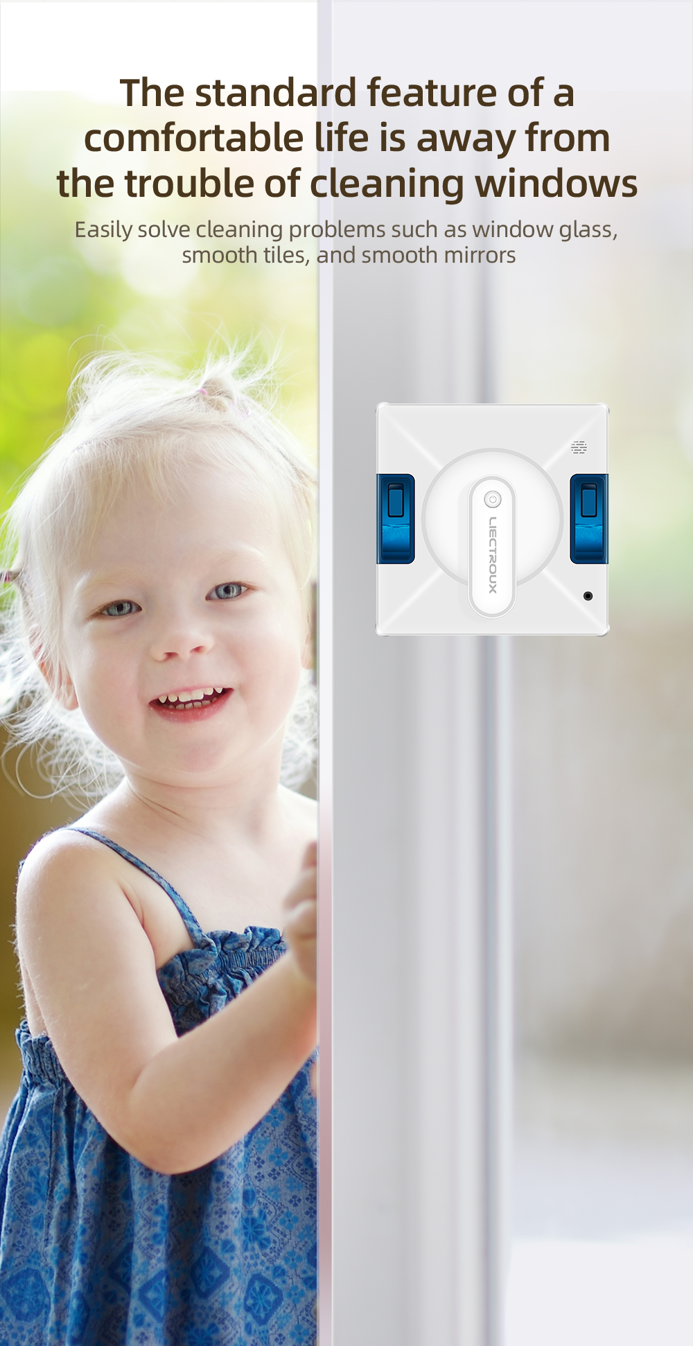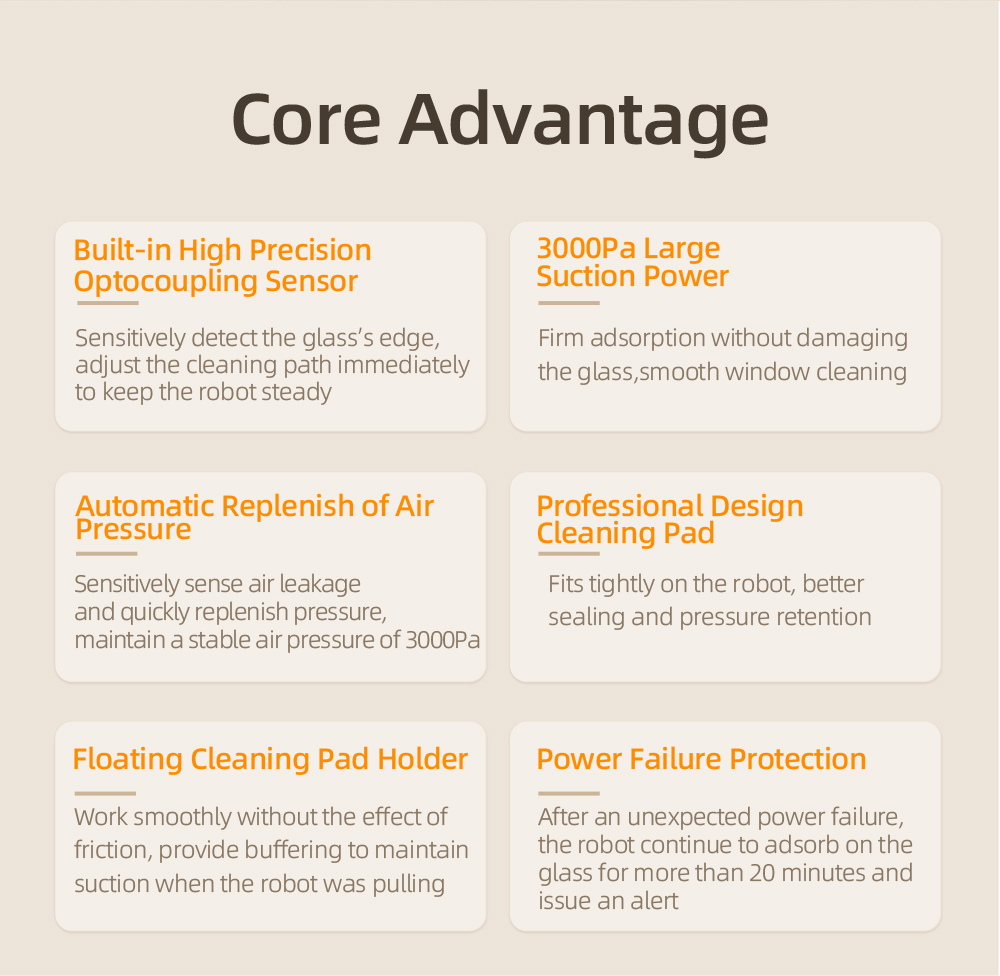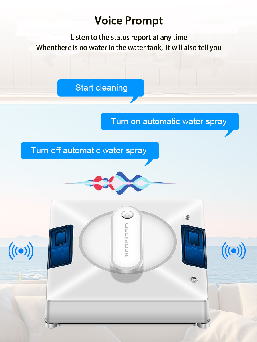 Älykäs ikkunanpuhdistusrobotti, jossa on vesisumutus kolmeen suuntaan (vasen, oikea, alas), älykäs reittisuunnittelu ja käyttö sekä kehystetyllä että kehyksettömällä lasilla. Kaukosäädin helpottaa käyttöä, ja turvaominaisuuksiin kuuluvat putoamisen esto, UPS-virtakatkossuoja sekä turvaköysi ja -soljet.