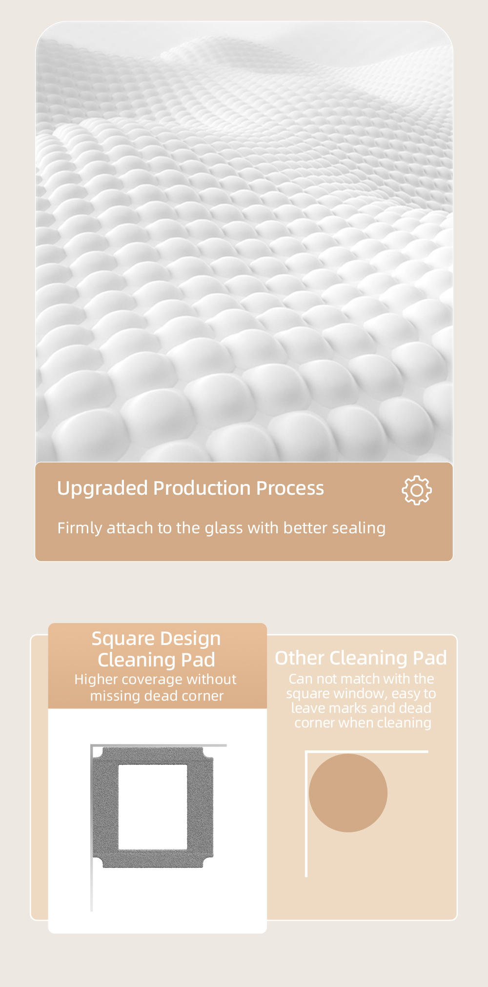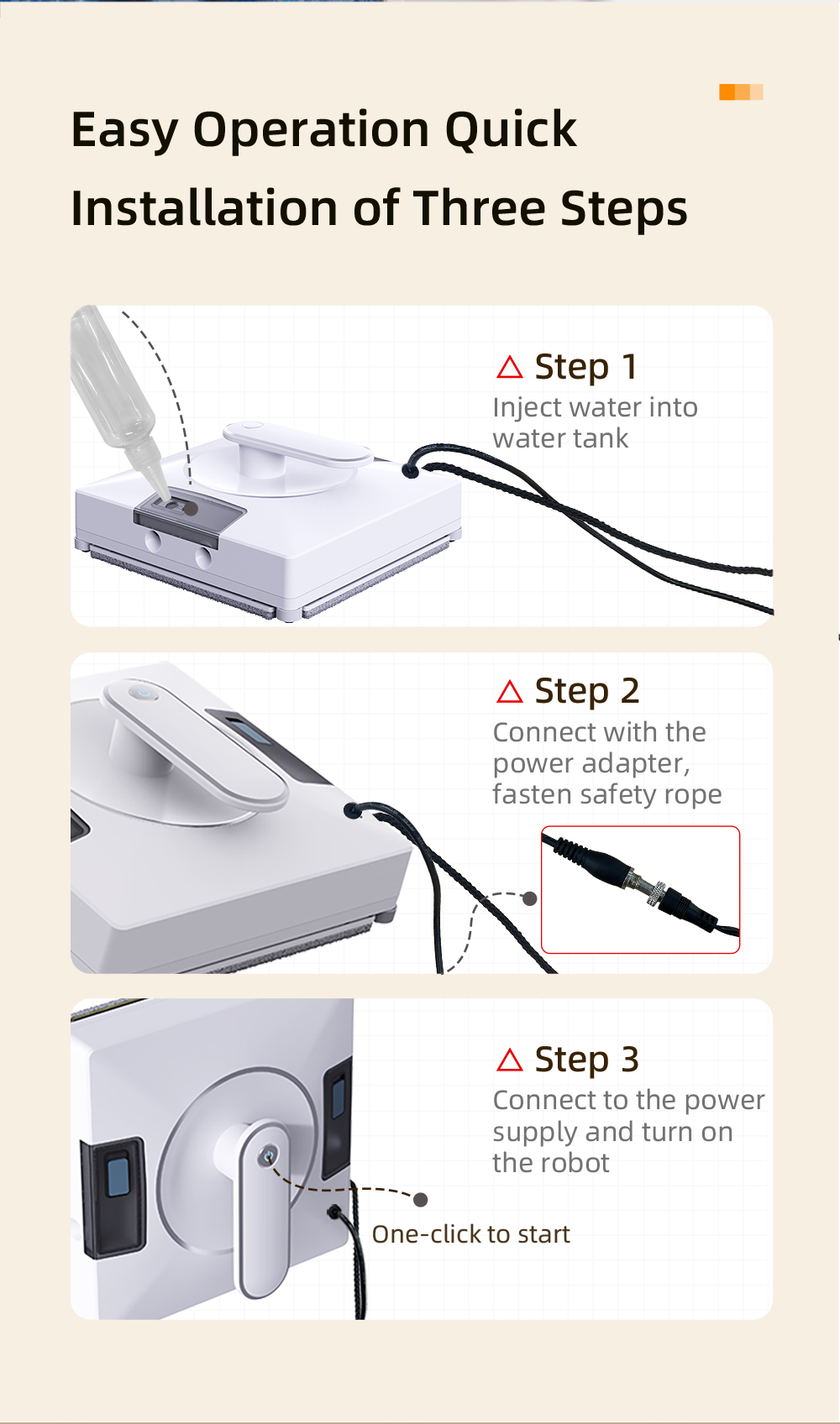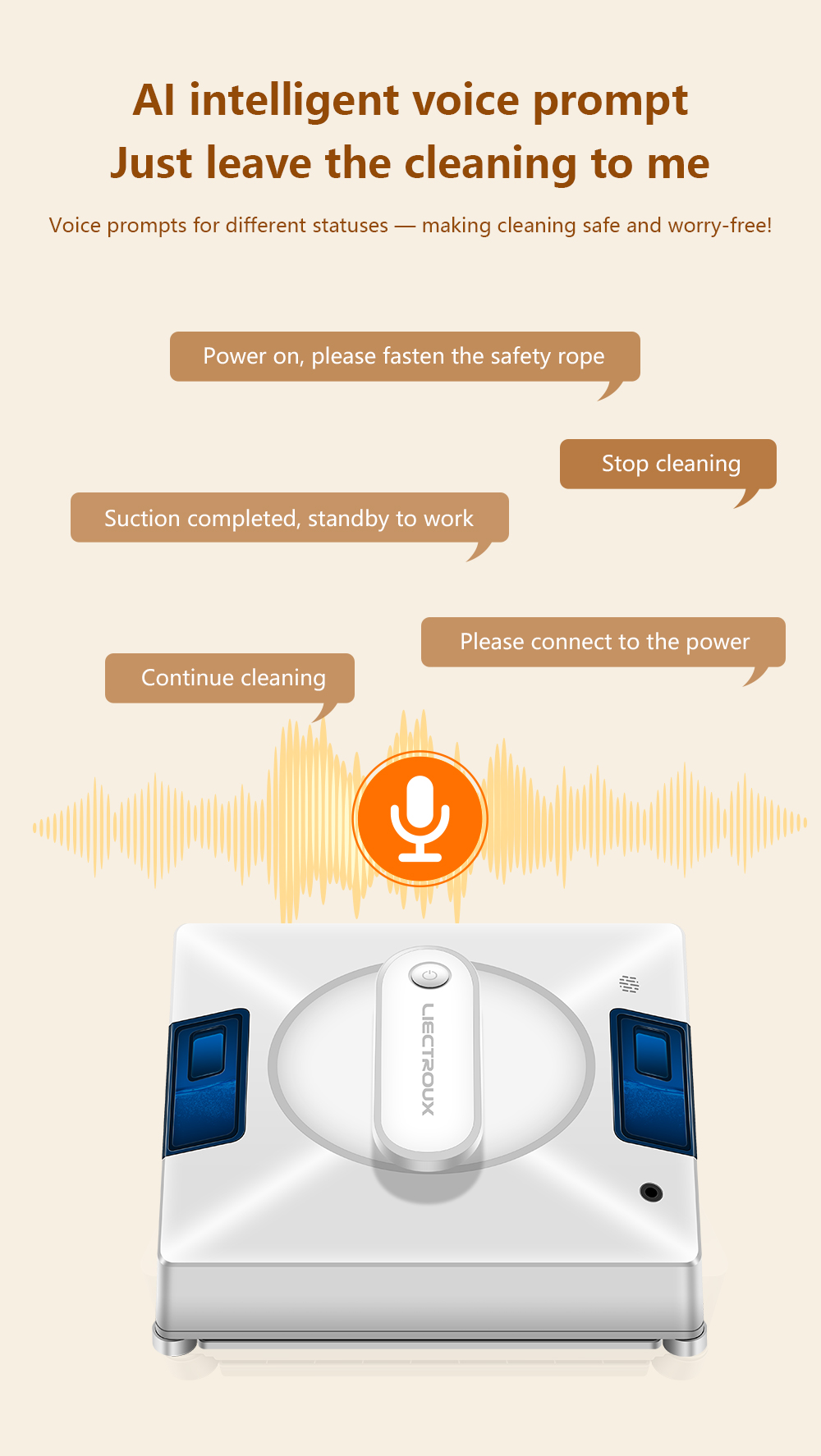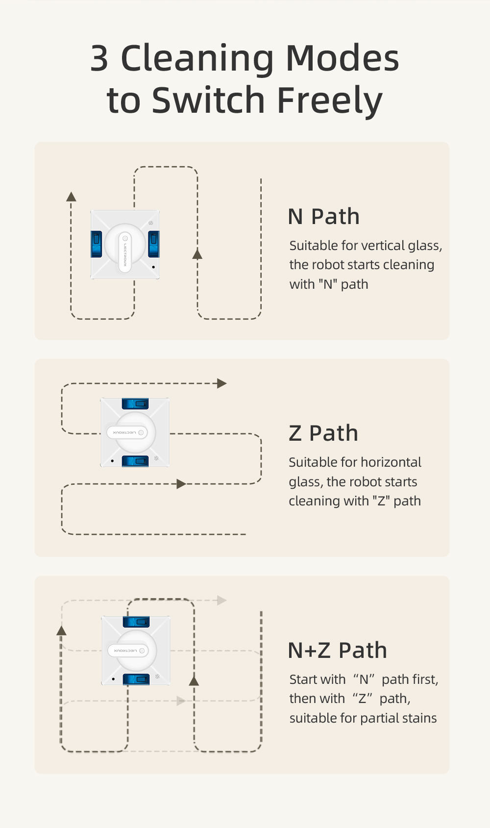 Älykäs ikkunanpuhdistusrobotti, jossa on vesisumutus kolmeen suuntaan (vasen, oikea, alas), älykäs reittisuunnittelu ja käyttö sekä kehystetyllä että kehyksettömällä lasilla. Kaukosäädin helpottaa käyttöä, ja turvaominaisuuksiin kuuluvat putoamisen esto, UPS-virtakatkossuoja sekä turvaköysi ja -soljet.