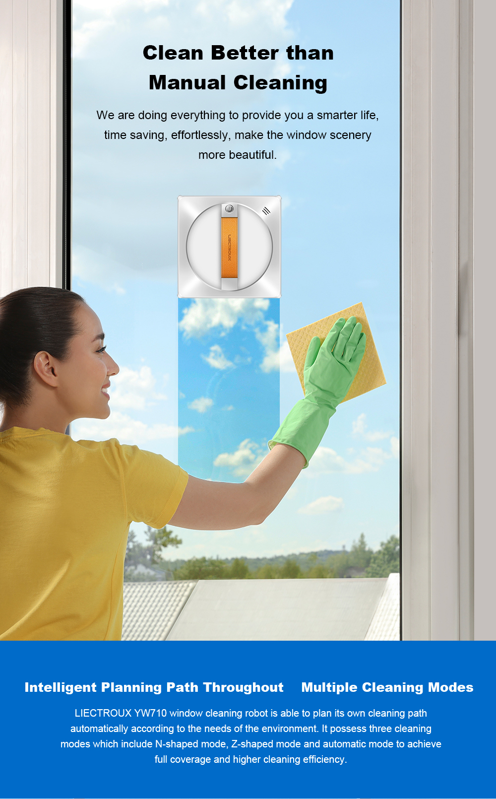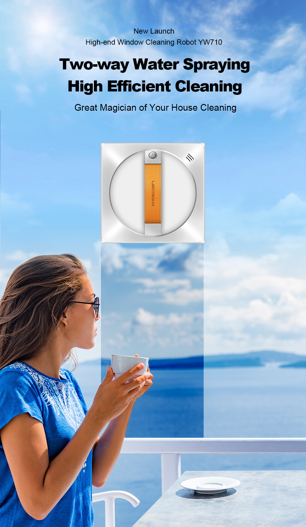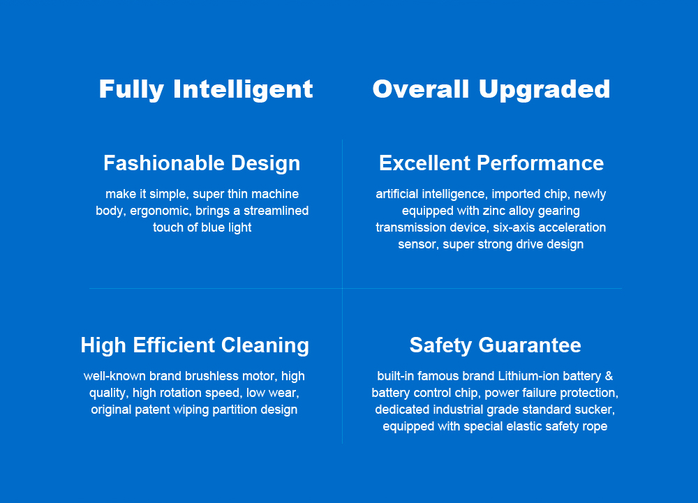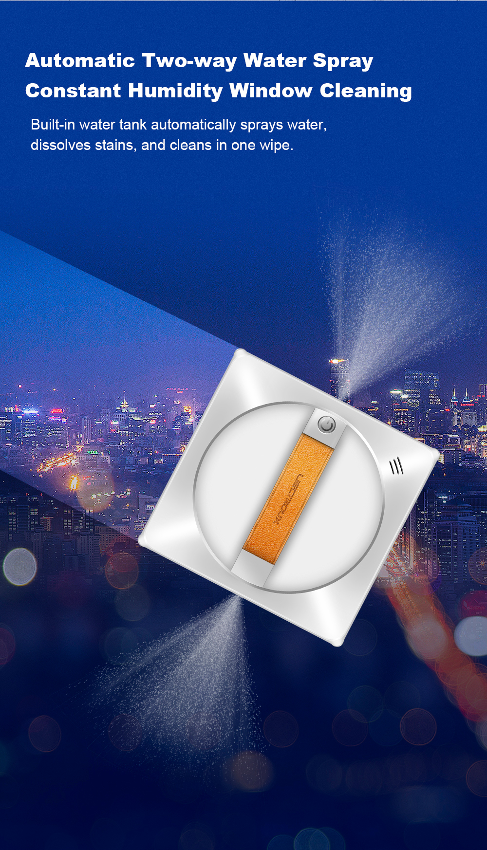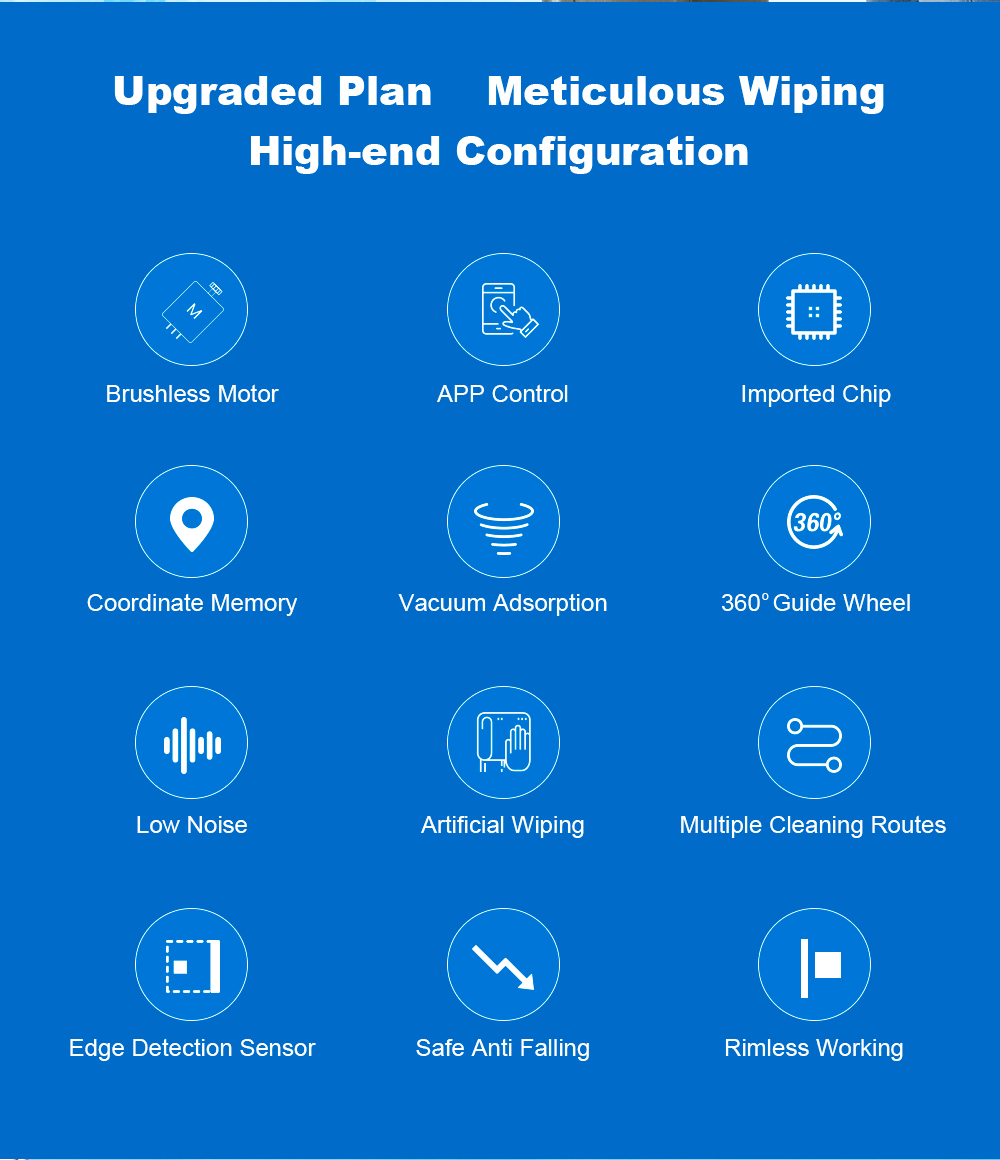 Itseohjautuva ikkunoidenpesurobotti suihkuttaa vettä automaattisesti, tunnistaa reunat, kiinnittyy imulla ja turvaköydellä, sekä ohjataan sovelluksella tai äänellä. Sopii kehystettyihin ja kehyksettömiin ikkunoihin.