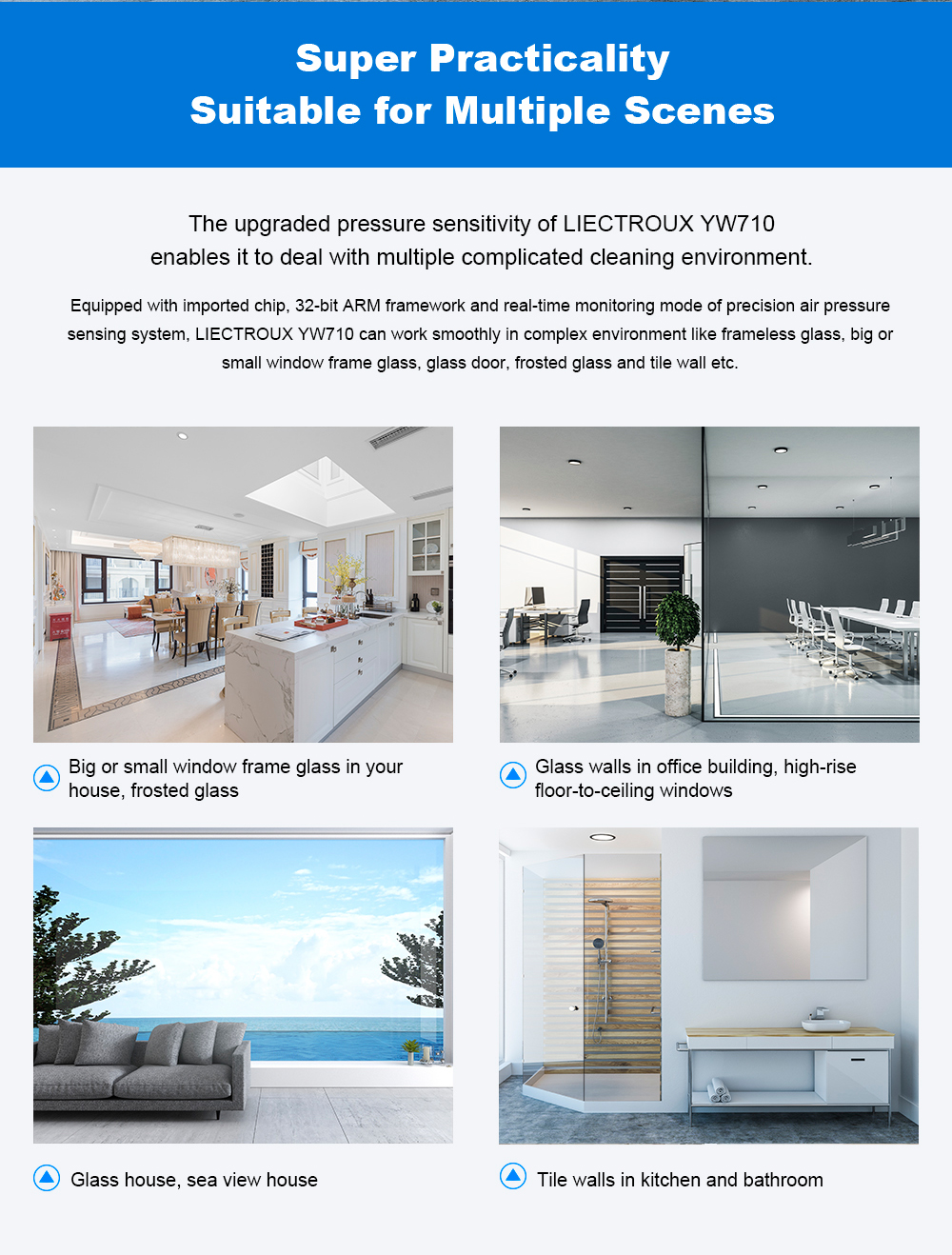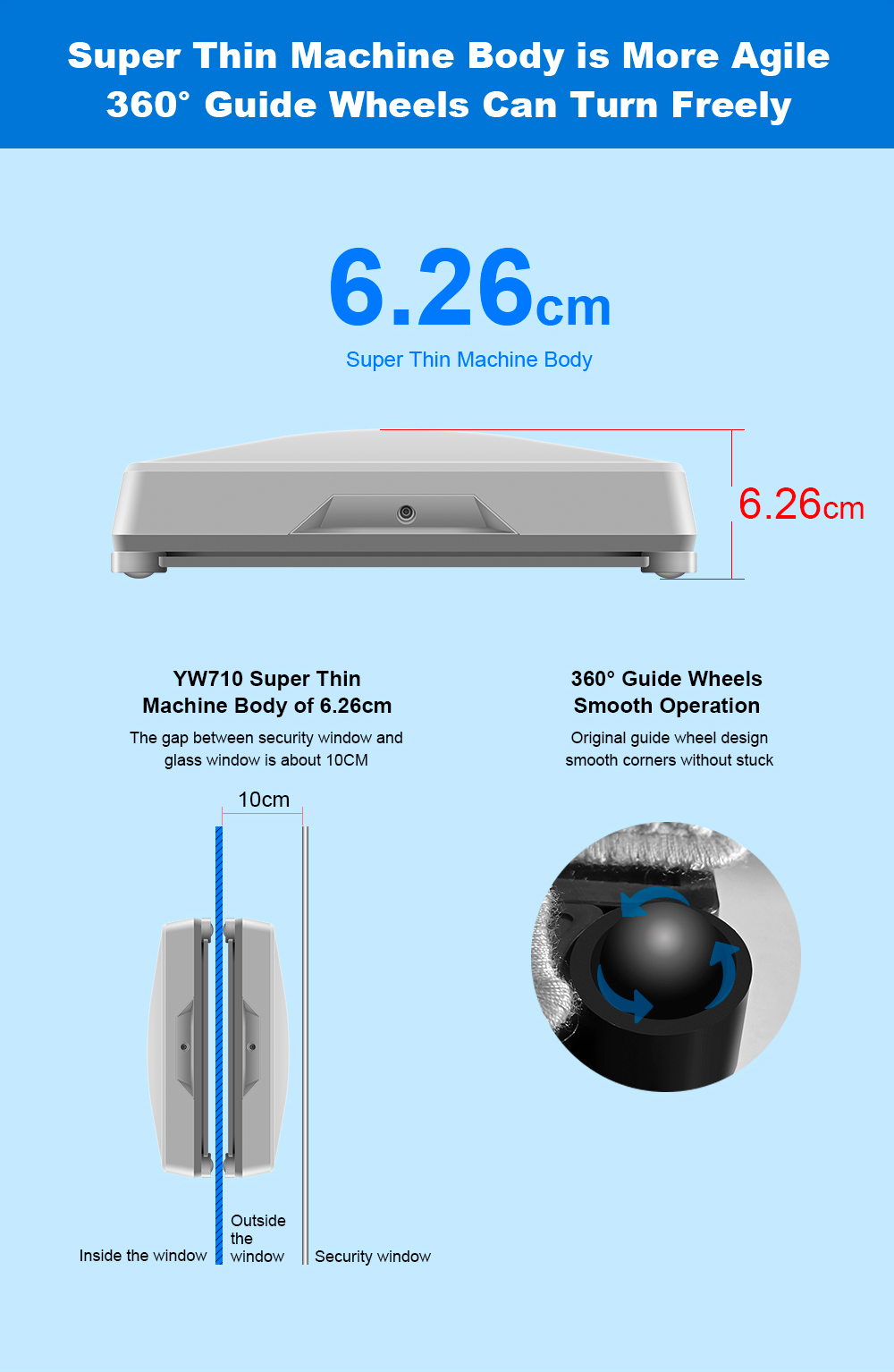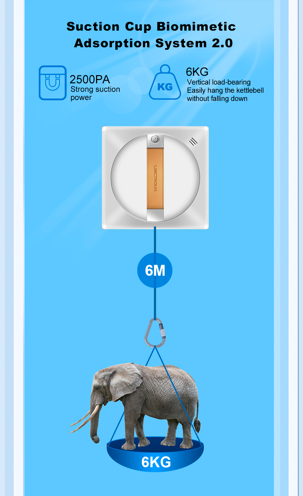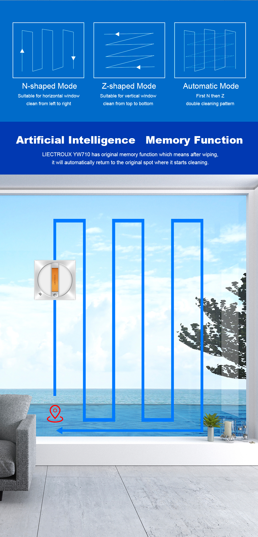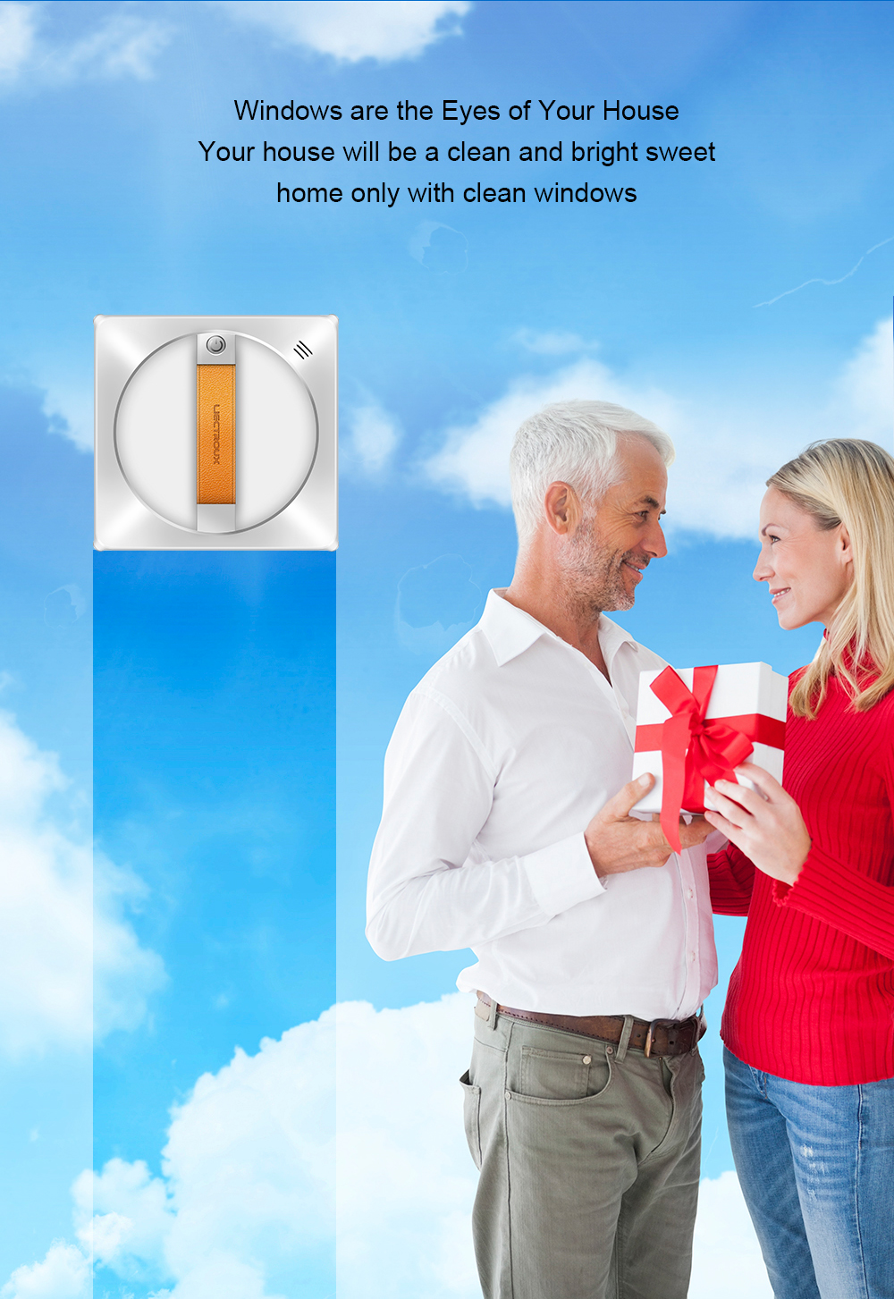 Itseohjautuva ikkunoidenpesurobotti suihkuttaa vettä automaattisesti, tunnistaa reunat, kiinnittyy imulla ja turvaköydellä, sekä ohjataan sovelluksella tai äänellä. Sopii kehystettyihin ja kehyksettömiin ikkunoihin.