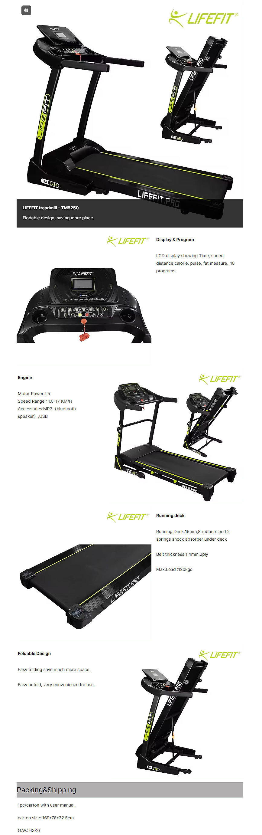 LIFEFIT TM5250 on kotikäyttöön suunniteltu juoksumatto, jossa on automaattinen kaltevuuden säätö, selkeä LCD-näyttö ja useita harjoitusohjelmia. Hydraulisesti taittuva rakenne ja siirtopyörät helpottavat säilytystä ja siirtämistä, joten laite sopii hyvin myös pienempiin tiloihin.