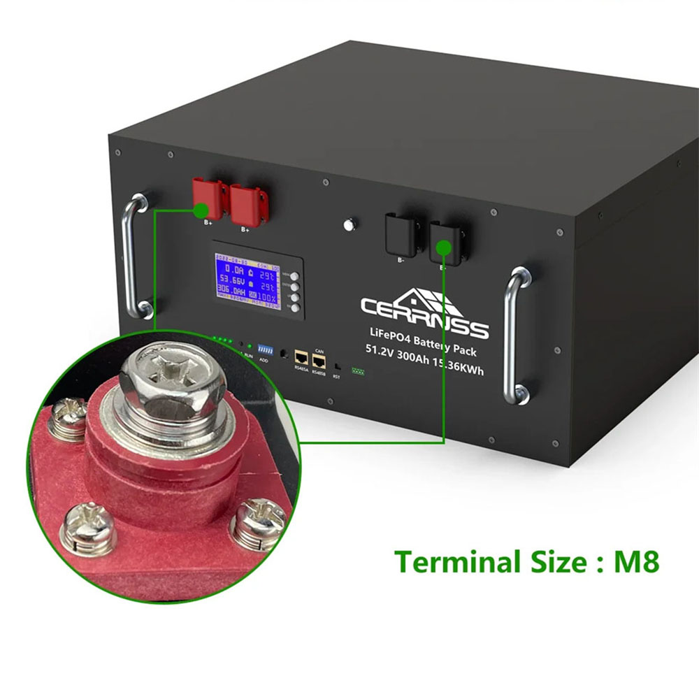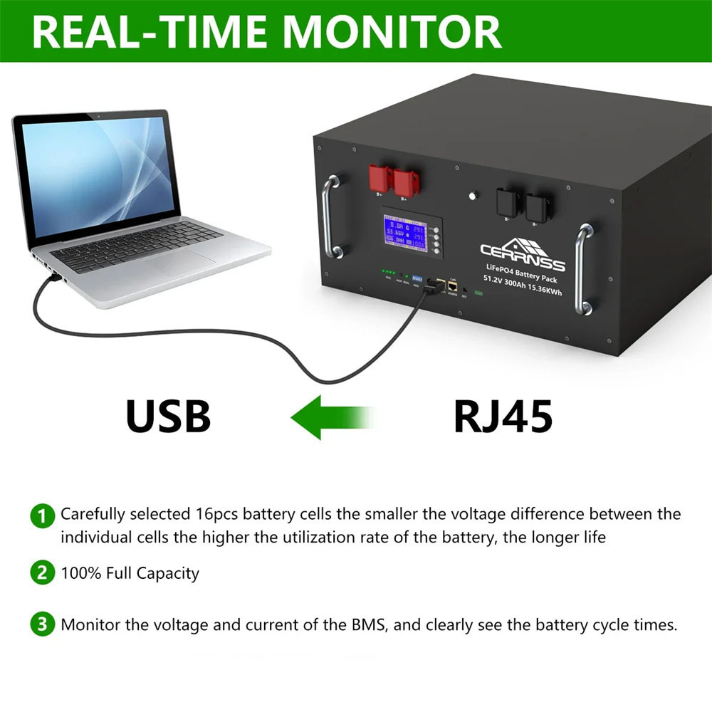 LiFePO4 48V 300Ah akkupaketti 16S älykäs BMS-järjestelmä RS485 CAN tietokoneohjaus aurinkoenergiavarasto