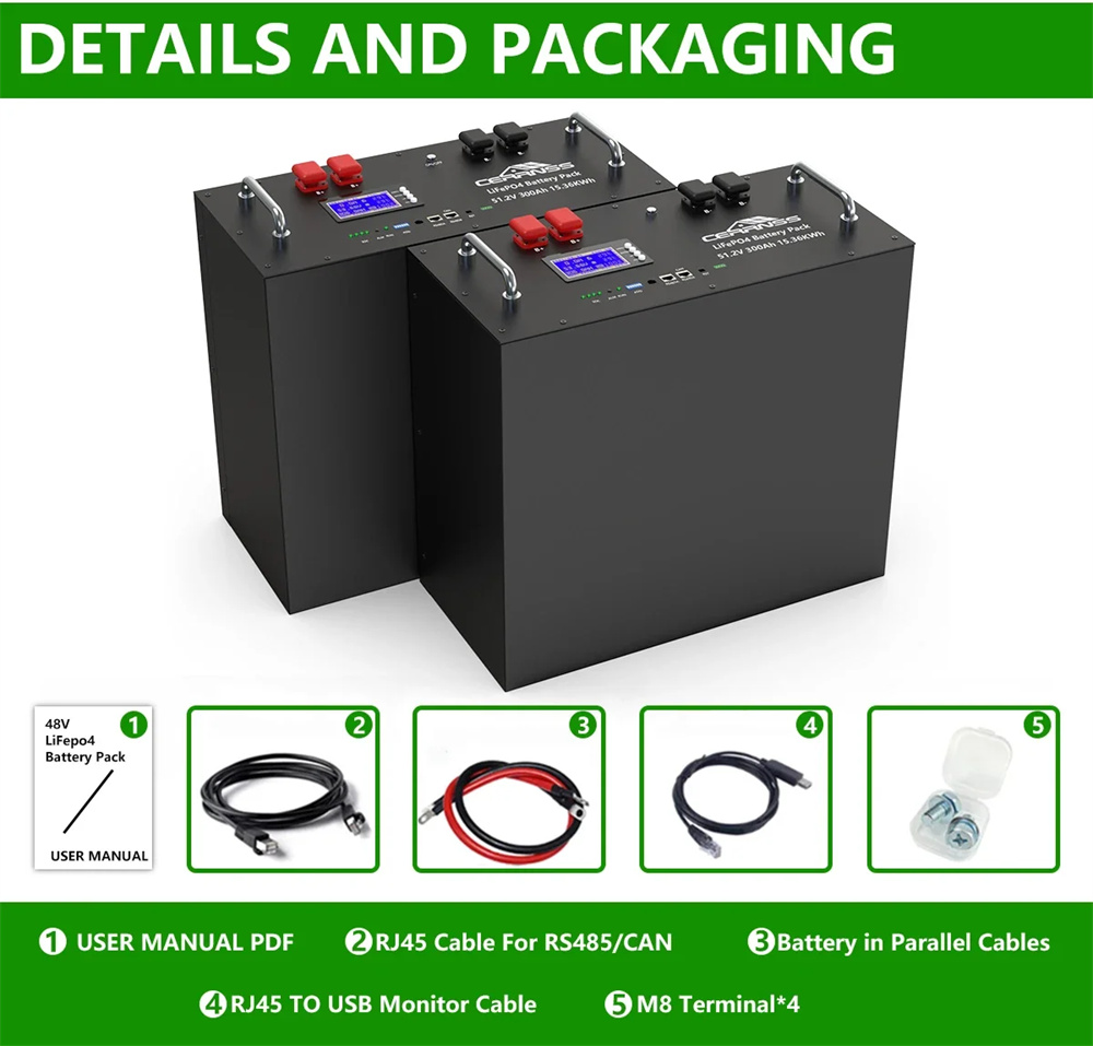 - Korkea kapasiteetti: 48V300Ah ja 15360Wh energiavarasto