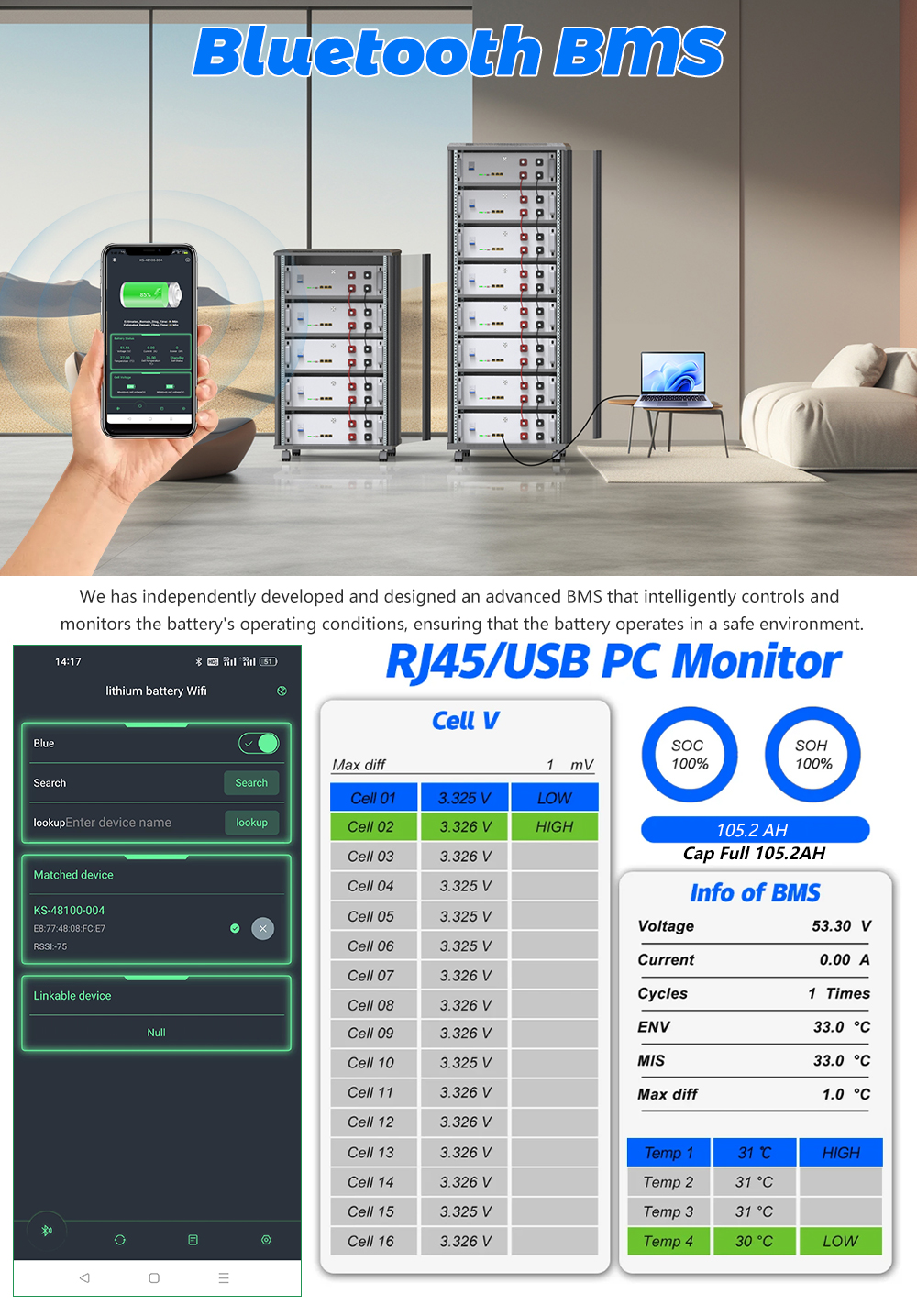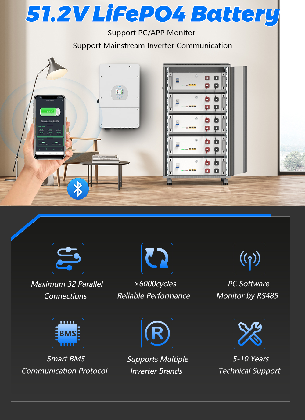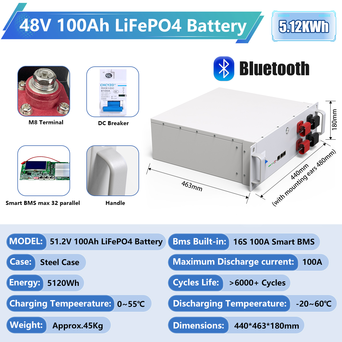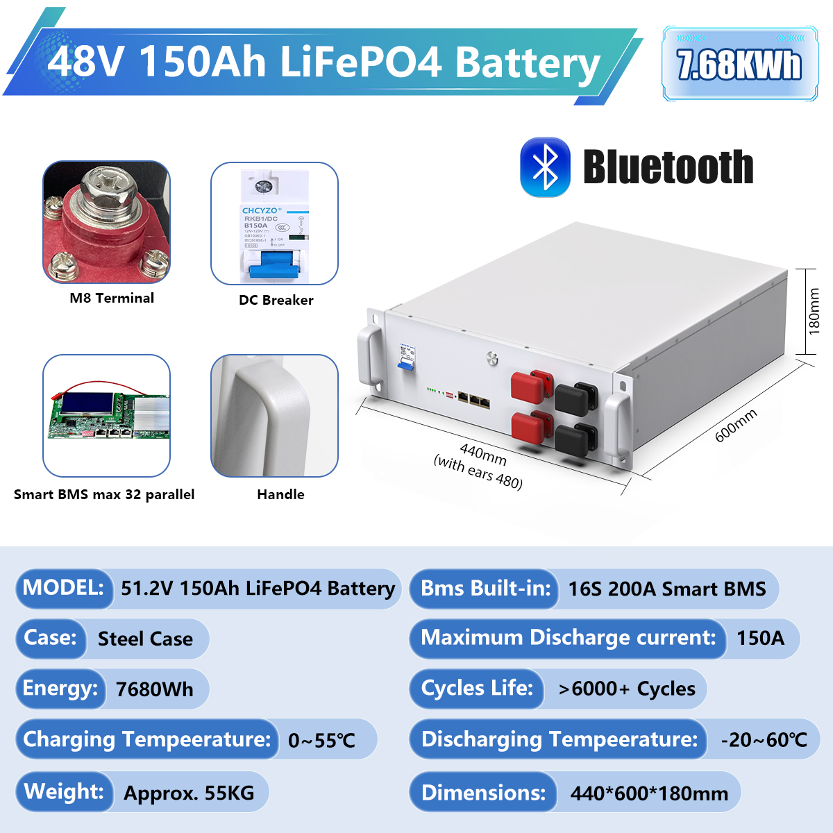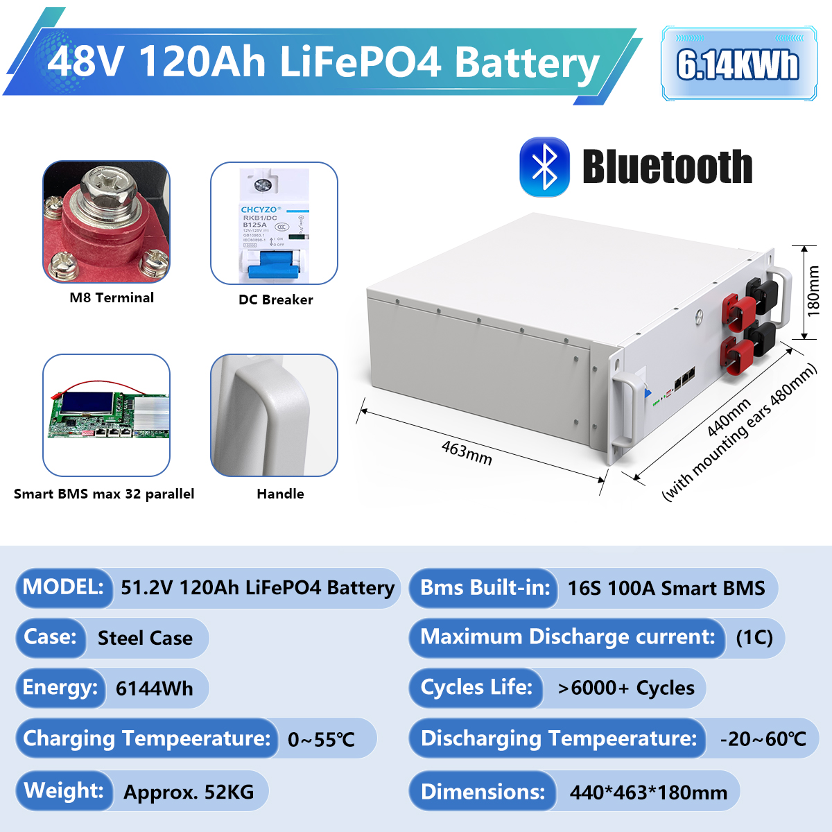 LiFePO4 51,2V 100/120/150Ah litiumakku akkunhallintajärjestelmällä bluetoothilla kotiin aurinkoenergian varastointi