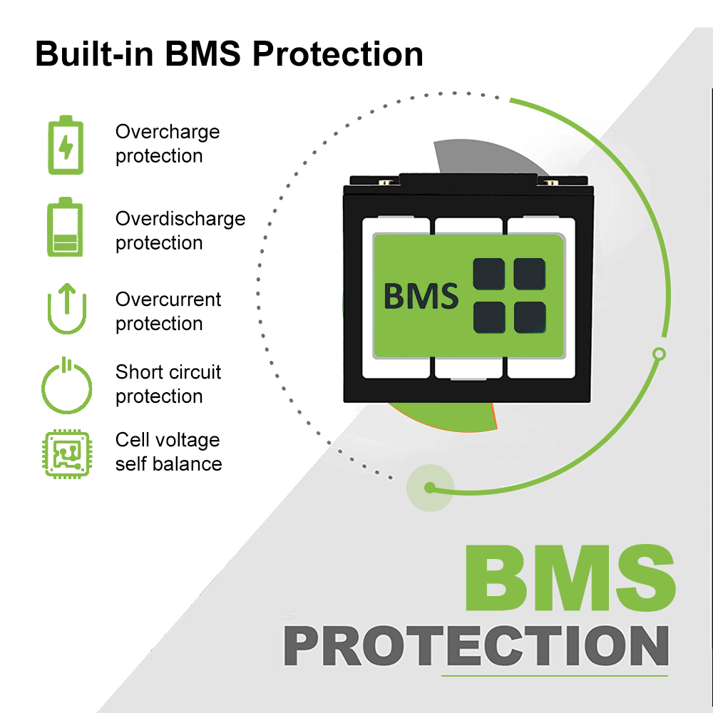 - Sisäänrakennettu BMS parantaa turvallisuutta ja luotettavuutta