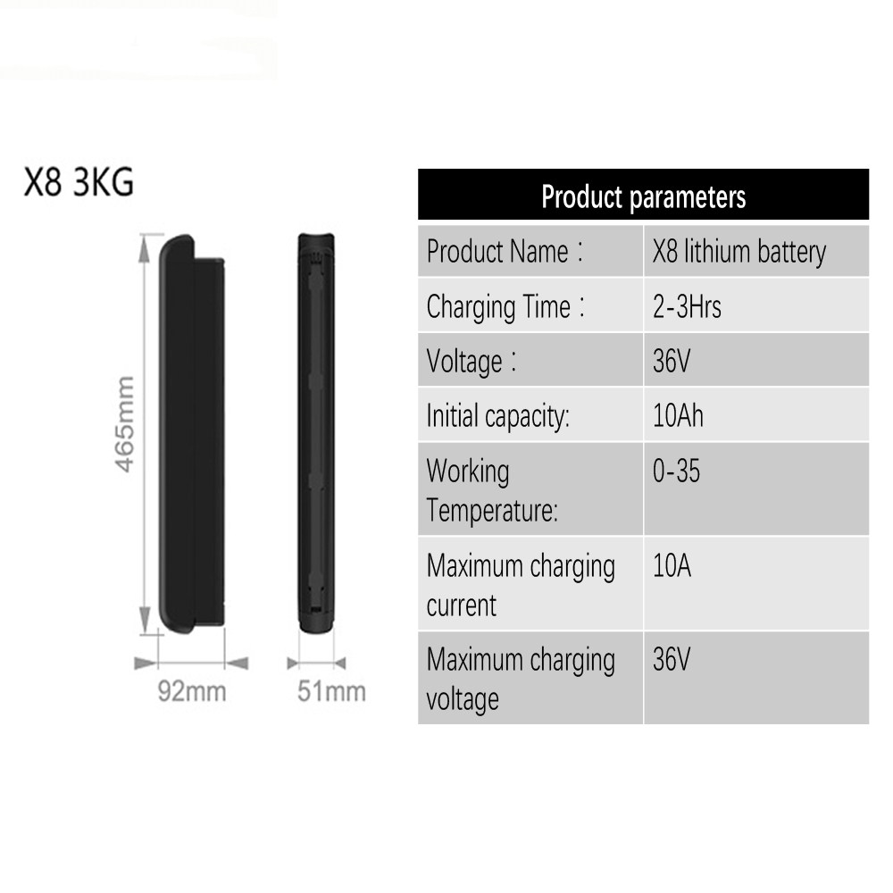Tämä litiumakku on suunniteltu X8-sähköskootteriin. Kompakti koko, 36V jännite ja 10Ah kapasiteetti tarjoavat luotettavan virran päivittäiseen ajoon. Akku latautuu täyteen noin 2–3 tunnissa, ja sen käyttöalueen lämpötila on 0–35℃.