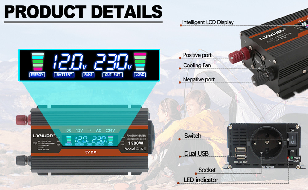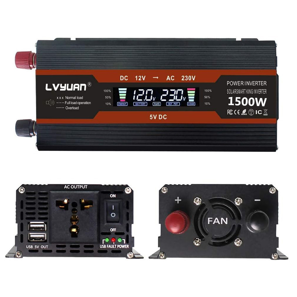 LVYUAN 12V–230V autoinvertteri 500W 1500W huippu kaksi latausporttia nestekidenäyttö eurooppalainen pistoke