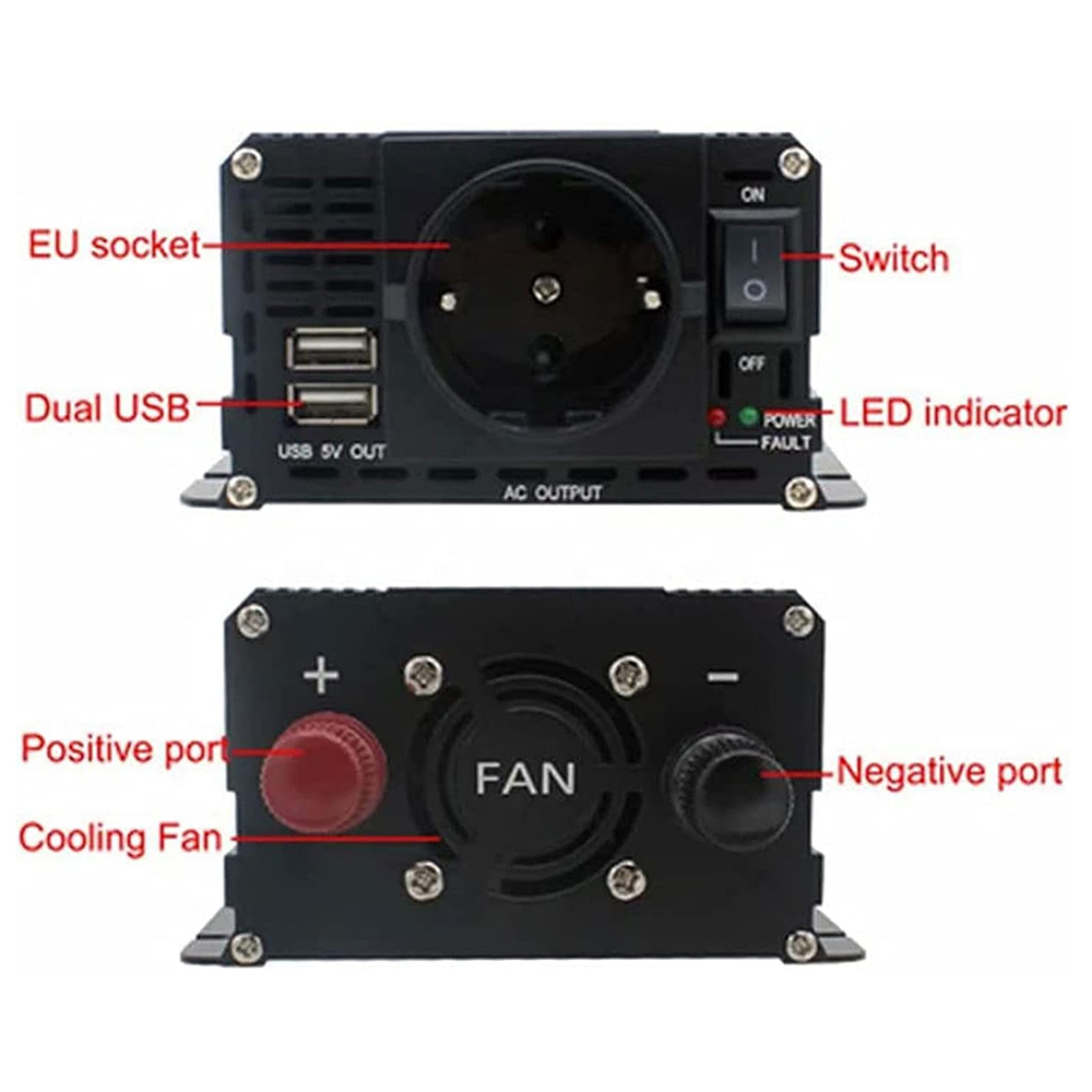 Lvyuan 12V–220V autoinvertteri 500W (1500W huippu) puhdas siniaalto, kaksi USB-porttia, EU-pistoke F-500P