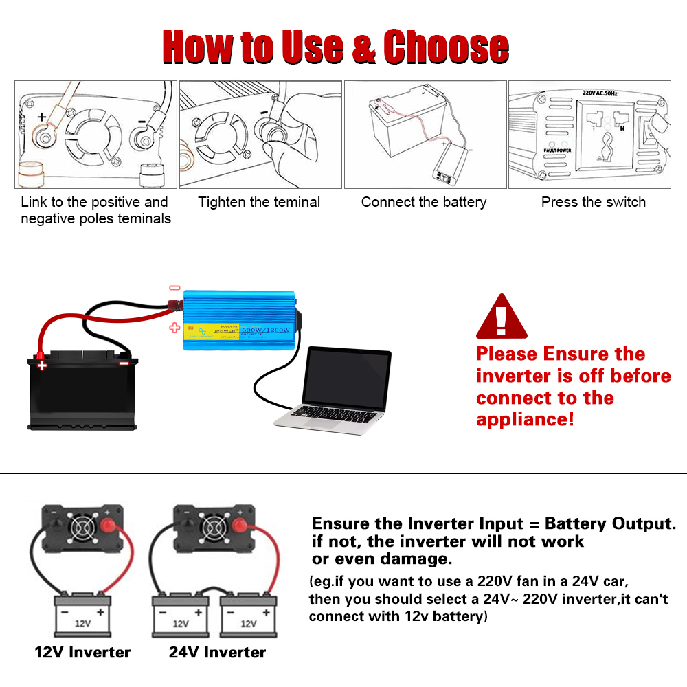 6. Älä ylikuormita. Jos käyttökohteesi on induktiivinen kuorma, valitse invertteri, jonka jatkuva teho on 3–7 kertaa suurempi kuin laitteesi watit (esim. jääkaappi, pakastin, pora, pesukone, vesipumppu, mikroaaltouuni, uuni, imuri, hiustenkuivain jne. moottorilla). Varmista ennen tilausta, että invertterin jatkuva teho vastaa tarvetta, tai kysy meiltä lisätietoja.