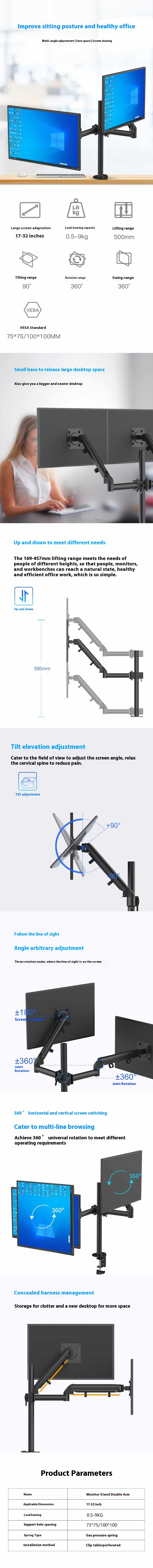 2. Kahden näytön tuki: Sopii kahdelle näytölle, joiden koko on 17-32 tuumaa, vapauttaen tilaa työpöydältä ja tehostaen työskentelyä.