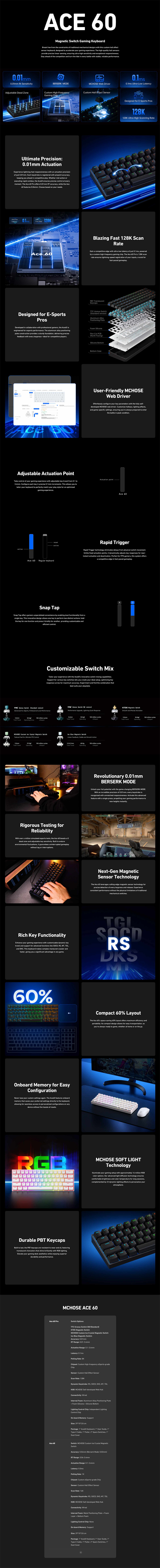MCHOSE Ace 60Pro on kompakti 60%:n kokoinen langallinen mekaaninen pelinäppäimistö, jossa on magneettikytkimet, erittäin tarkka 0.01mm aktivointipiste ja 8000Hz kyselytaajuus 0.1ms viiveellä. Mukautettava kytkintuntuma, erillinen valaistuksen ohjaus ja sisäinen muisti tekevät siitä vakaan ja tarkan valinnan pelaamiseen ja kirjoittamiseen.