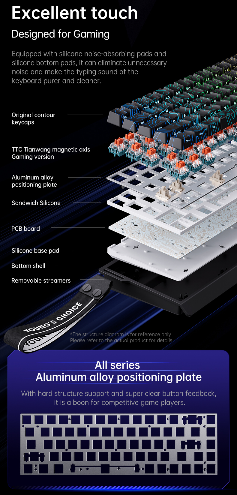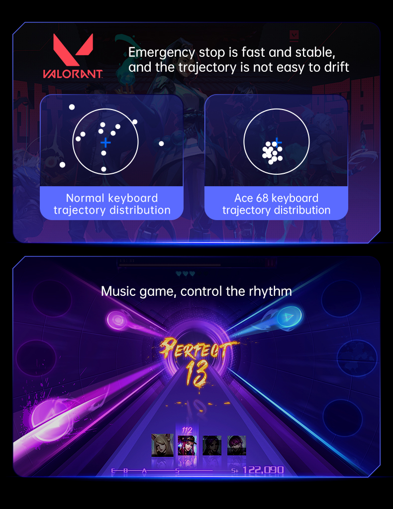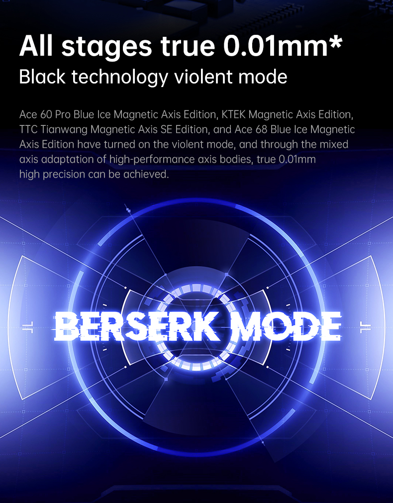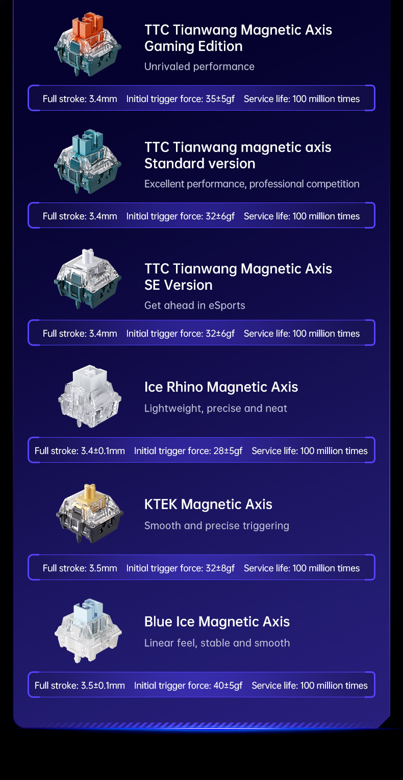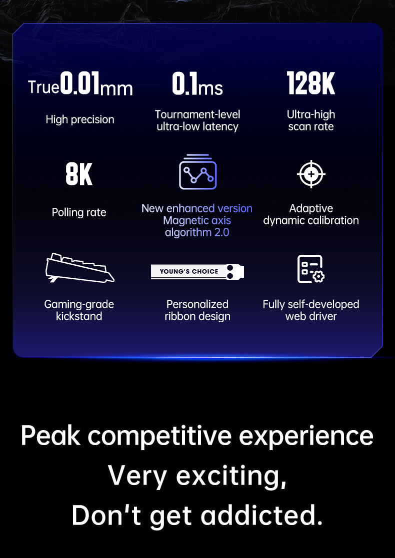 Monipuolinen 60 %:n kompakti mekaaninen pelinäppäimistö, joka yhdistää magneettikytkimien tarkan tuntuman, 0.1 ms viiveen, 8K kyselytaajuuden ja 128K skannausnopeuden. RGB-valaistus ja tukevat pelitason kallistustuet tekevät käytöstä miellyttävää sekä peleissä että työssä.