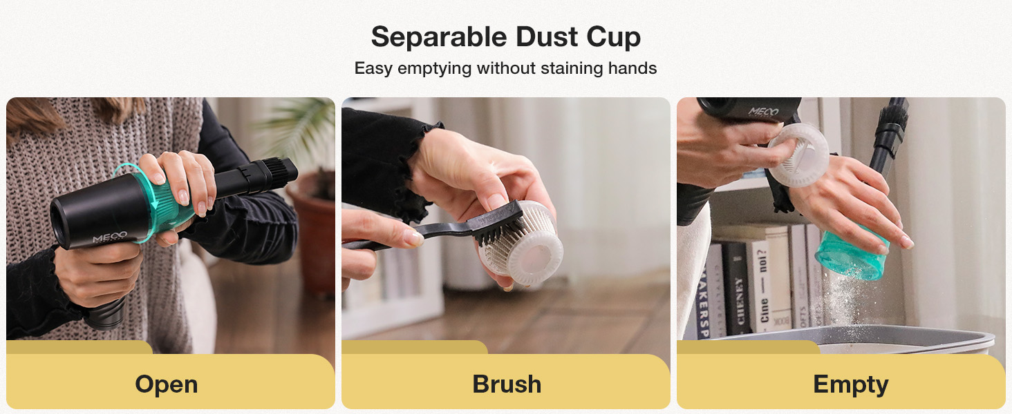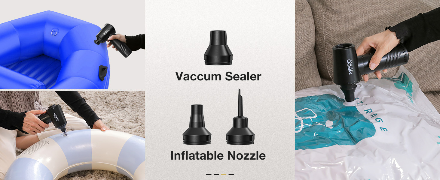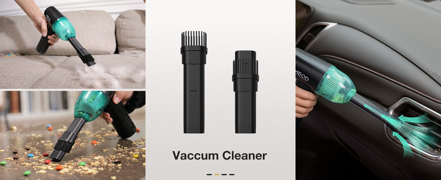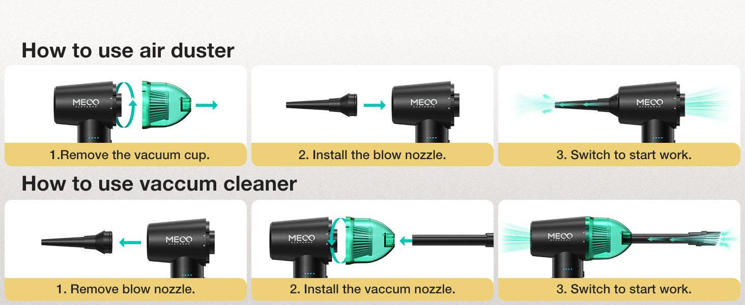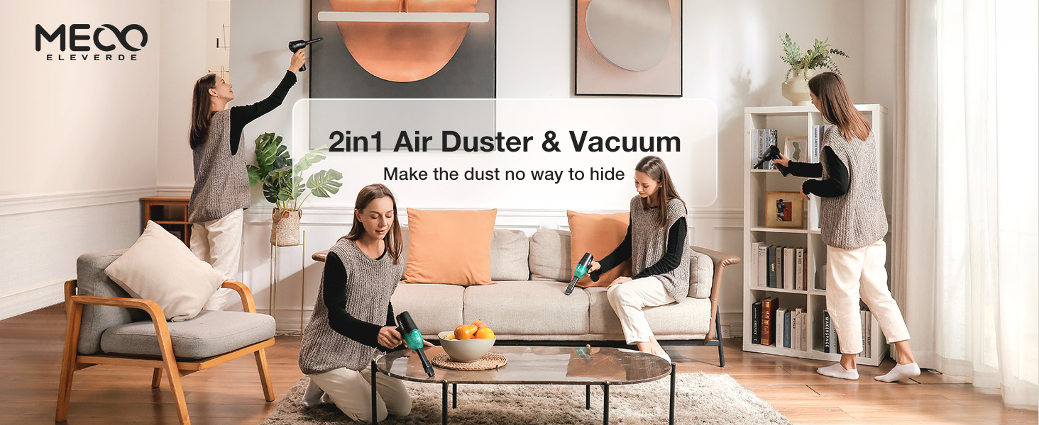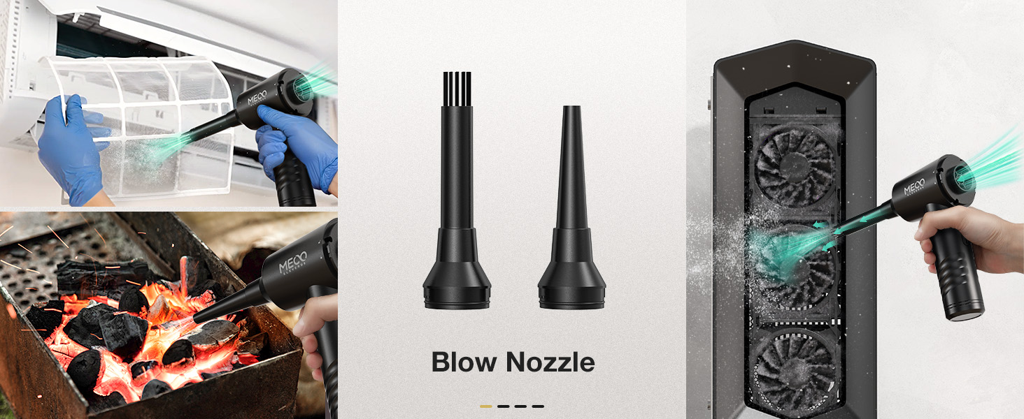 MECO-pölypuhallin sisältää useita suuttimia ja harjan eri käyttötarkoituksiin. Ilmapuhallin helpottaa vaikeapääsyisten kohtien puhdistusta. Sisäänrakennetut LED-valot syttyvät laitteen käynnistyessä ja valaisevat pimeät kulmat, mikä lisää käyttömukavuutta.