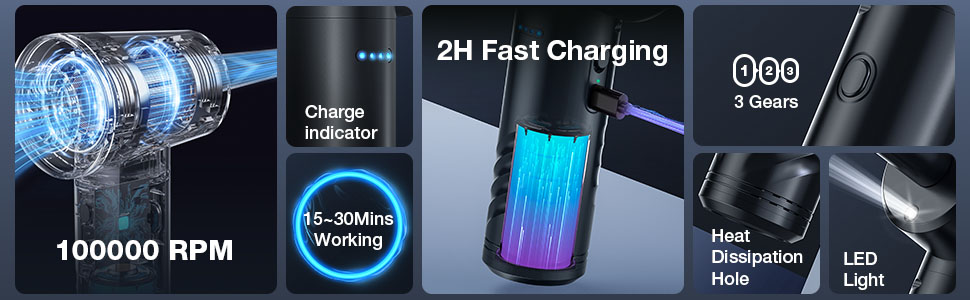 Kolme nopeutta eri tarpeisiin: matala (50,000 RPM), keskitaso (70,000 RPM) ja korkea (100,000 RPM). Valitse sopiva taso erilaisille pinnoille, tasainen ilmavirta suojaa herkempiäkin kohteita.