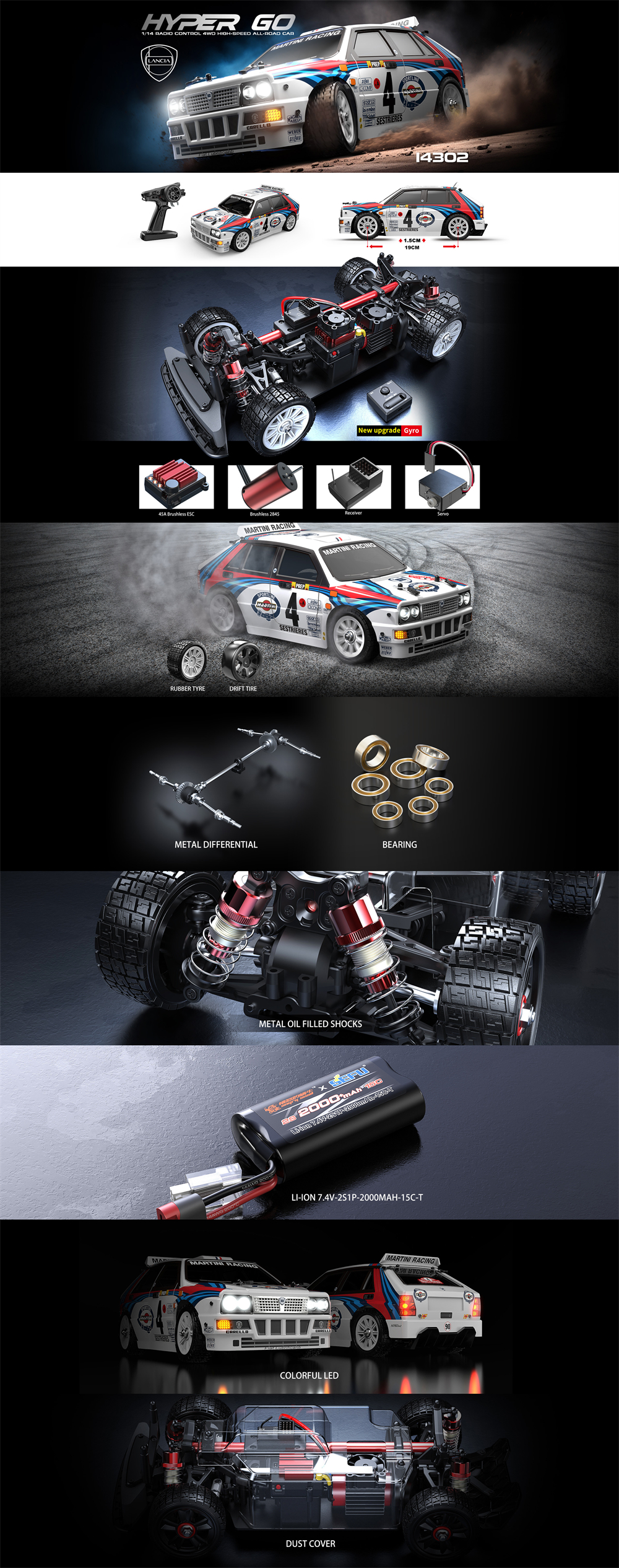 MJX HYPER GO 14302 on 1/14-mittakaavainen harjaton RC-auto, joka tarjoaa jopa 42km/h huippunopeuden ja tarkan 2.4GHZ-radiolla toimivan ohjauksen. Harjaton moottori, 45A-säädin ja 17g digitaalinen servo tekevät ajokokemuksesta sulavan sekä aloitteleville että kokeneemmille harrastajille.