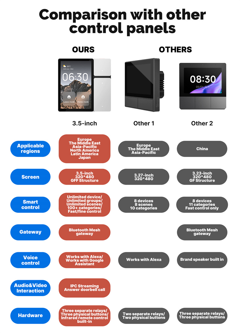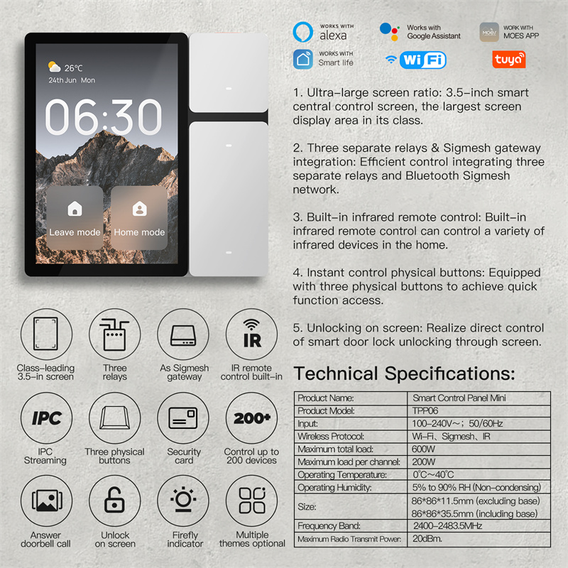 Kompakti ja selkeä kosketuspaneeli kodin älylaitteiden hallintaan. Smart Control Panel Mini yhdistää 3.5-tuumaisen näytön, kolme erillistä relettä, Sigmesh-yhdyskäytävän sekä sisäänrakennetun infrapunaohjauksen yhdeksi helppokäyttöiseksi seinälaitteeksi.