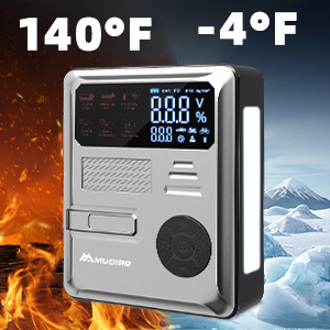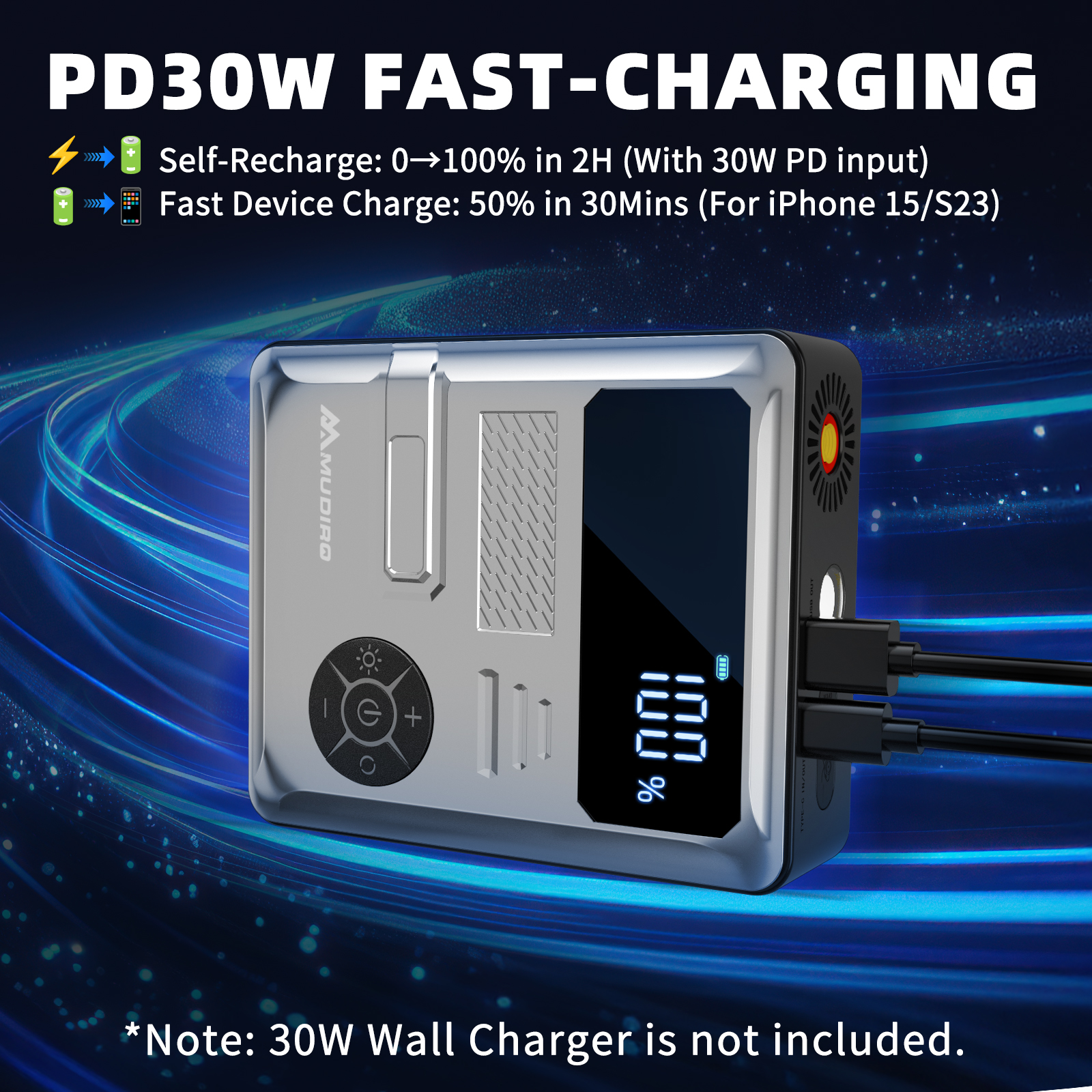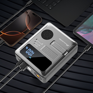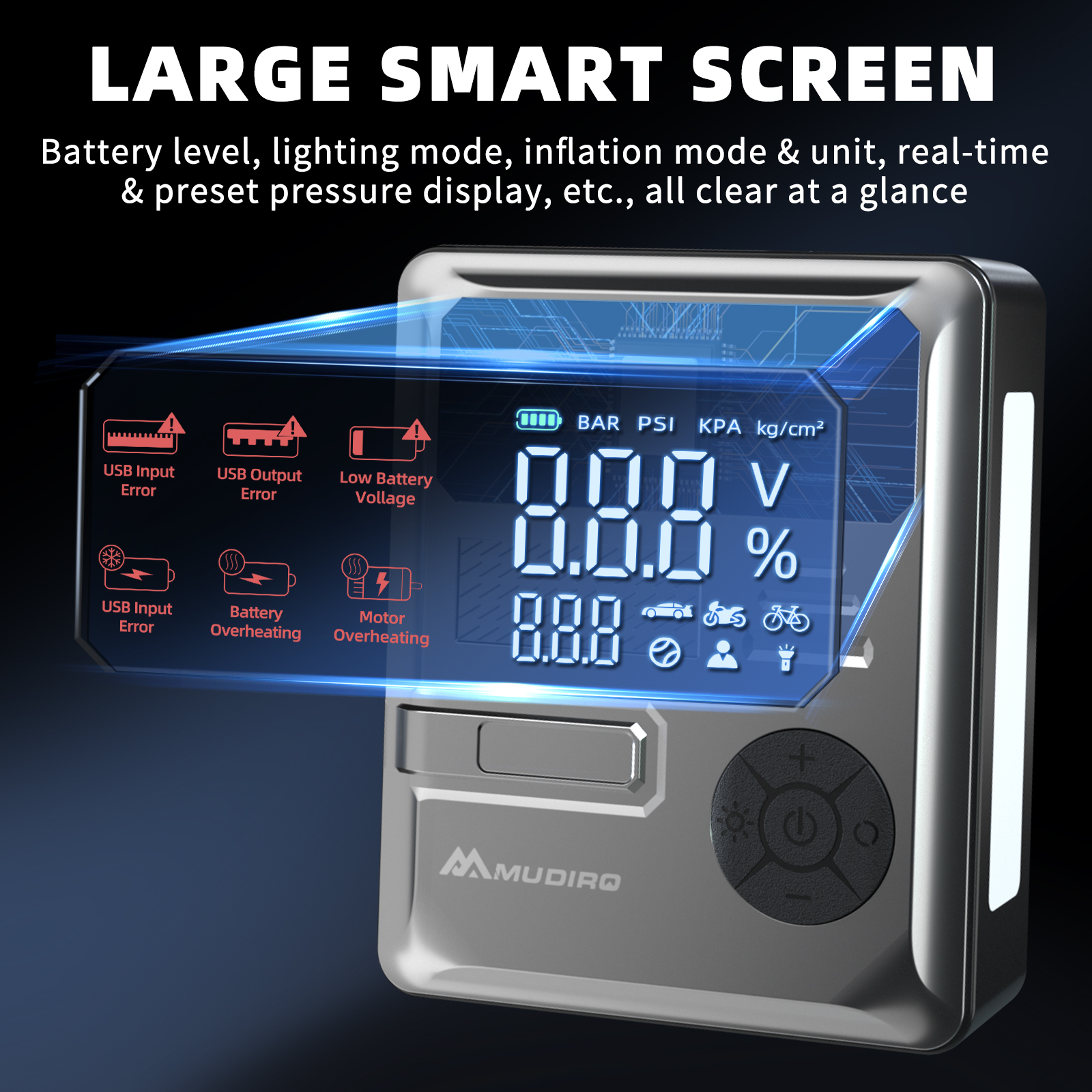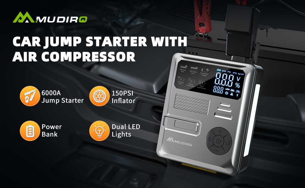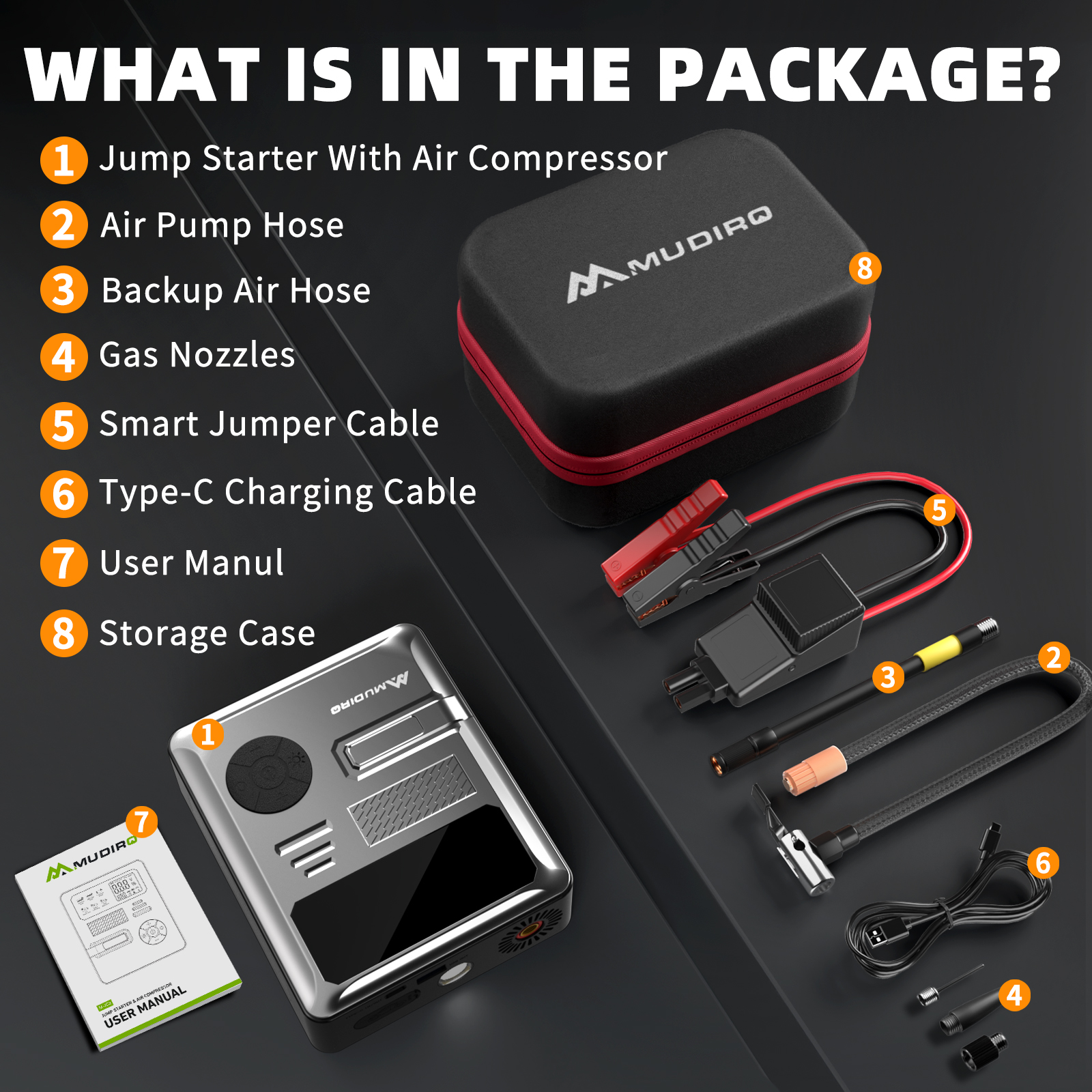 MUDIRO Jump Starter with Air Compressor yhdistää tehokkaan apukäynnistimen, kompaktin kompressorin ja varavirtalähteen yhteen helppokäyttöiseen laitteeseen. Se sopii hätätilanteisiin tiellä, renkaiden ylläpitoon sekä puhelimien ja muiden laitteiden lataamiseen.
