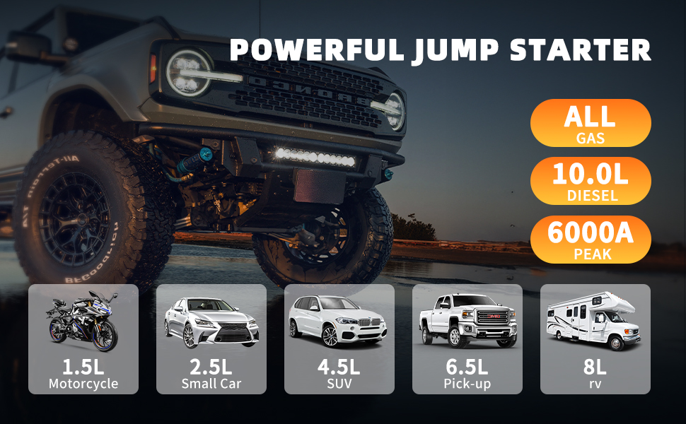 6000A HUIPPUAPUKÄYNNISTIN: 6000A huippuvirta käynnistää 12V tyhjentyneen akun (jopa kaikki bensiinimoottorit/10.0L diesel) sekunneissa, tukee 50+ käynnistystä yhdellä latauksella ja toimii lämpötilassa -4°F – 140°F. Soveltuu autoihin, kuorma-autoihin, moottoripyöriin, matkailuautoihin, veneisiin ja jopa traktoreihin.
