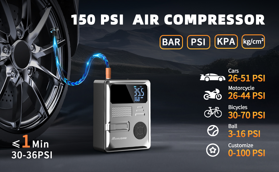 150 PSI KOMPRESSORI: Tehokas turbo 45 L/min (kestää 35 min) täyttää renkaan 195/65R15 paineesta 30 PSI tasolle 36 PSI 1 minuutissa. 5 esiasetustilaa (autot, polkupyörät, moottoripyörät, pallot, mukautettu) + 3 erilaista suutinta + 4 yksikköä (BAR/PSI/KPA/kg/cm²) tarkkaan täyttöön ja tiehätään.