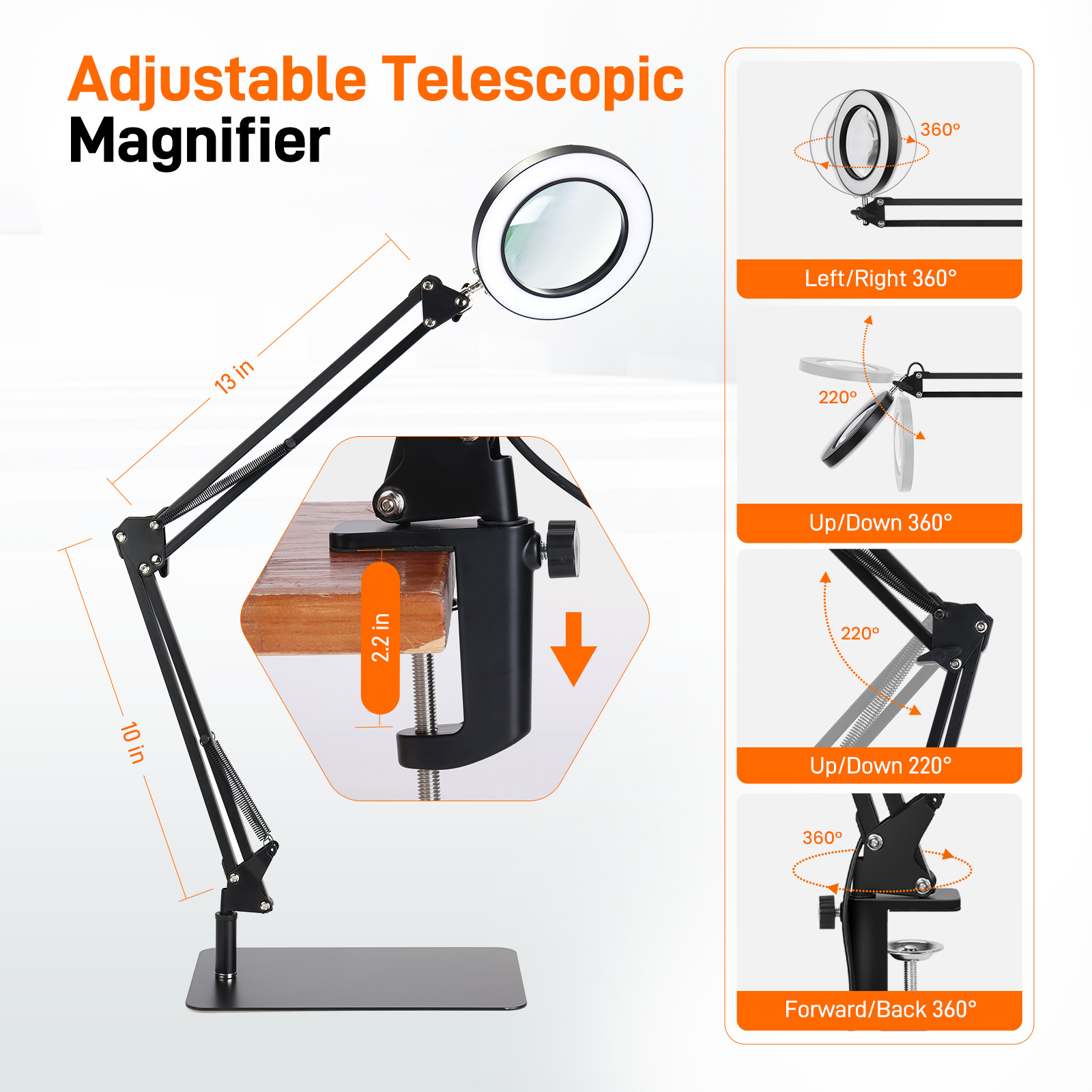 Kädet vapauttava työskentely onnistuu suurennuslasilla, jossa on valo ja pöytäkiinnitteinen puristin. Säädettävä keinuvarsi on varustettu 4 vahvalla jousella ja 3 nivelletyllä kohdalla, jotka tarjoavat tukevan tuen ja estävät valaisinta painumasta. Asennus ei vaadi työkaluja. Pöytäsuurennuslasi voidaan kiinnittää helposti tasaisen pinnan reunaan, enimmäispaksuus 2.1-tuumaa. Soveltuu käytettäväksi esimerkiksi työpöydällä, pöydällä, työpenkillä ja hyllyllä.