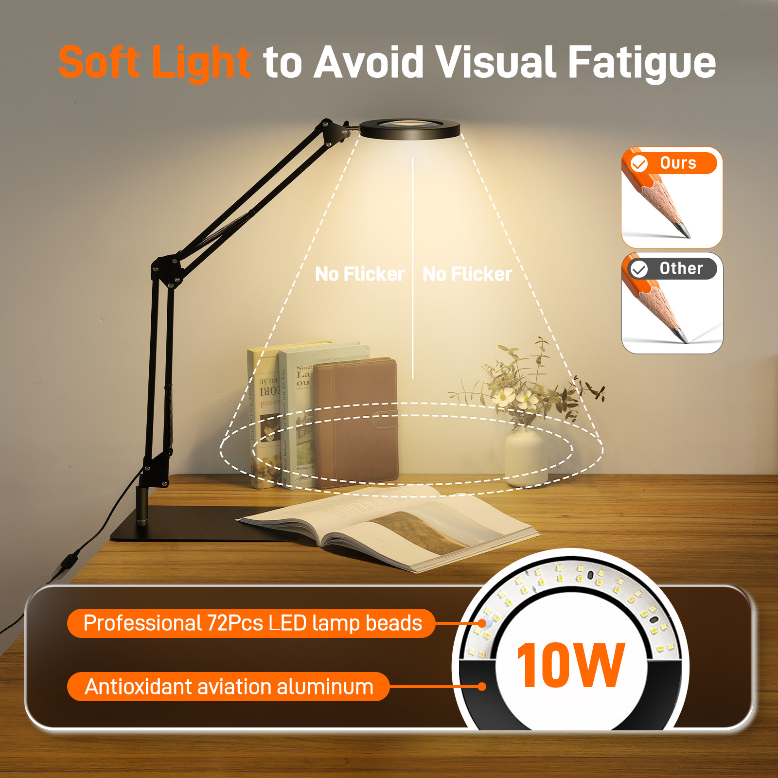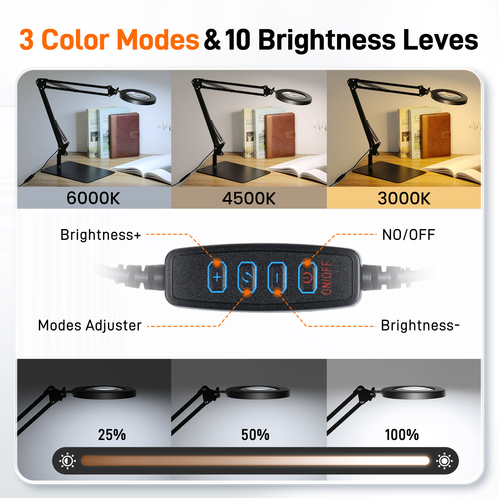 Suurennuslasi valolla ja jalustalla tarjoaa 5 värimoodia ja 10 himmennettävää kirkkaustasoa eri tarpeisiin. Korkealaatuiset rengas-LED-valot tuottavat tasaisen, välkkymättömän valon, joka parantaa näkyvyyttä ja vähentää silmien rasitusta pitkäaikaisessa käytössä. Pöytäsuurennuslasin muistitoiminto säilyttää edellisen tilan ja kirkkauden. Sopii esimerkiksi korjaajille, kosmetologeille, taiteilijoille, kolikkokeräilijöille, arkkitehdeille ja veistäjille.