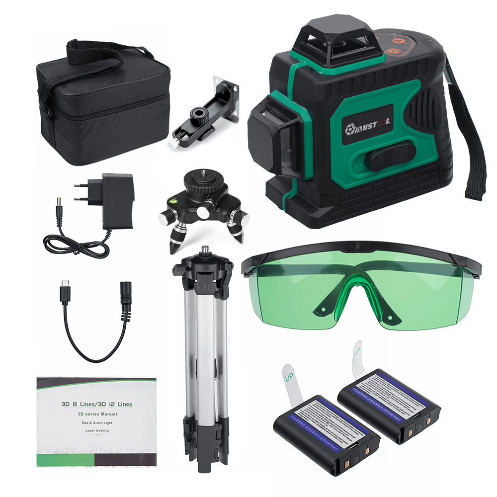 MUSTOOL 3D vihreä itsevaaittuva lasertaso 12 viivaa 360 asteen vaaka ja pysty litiumakut